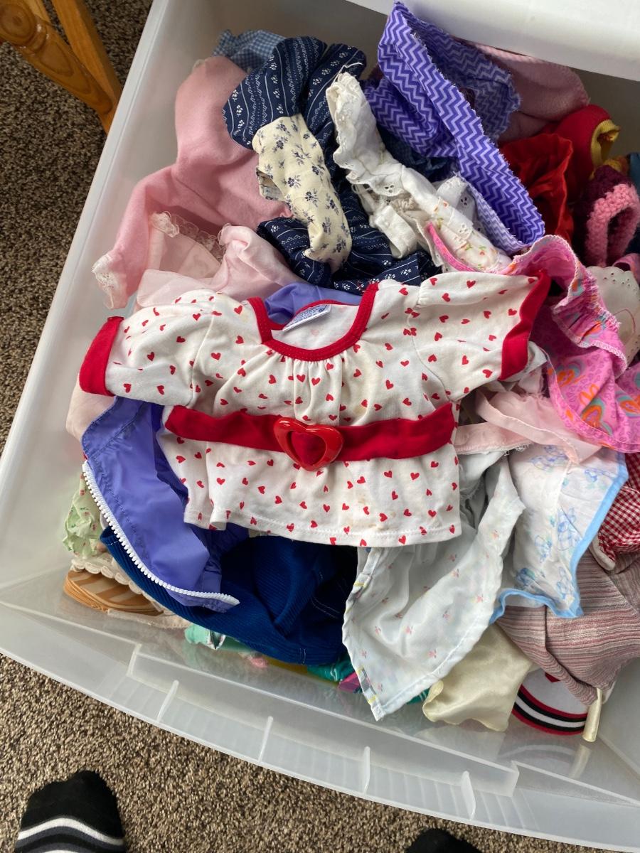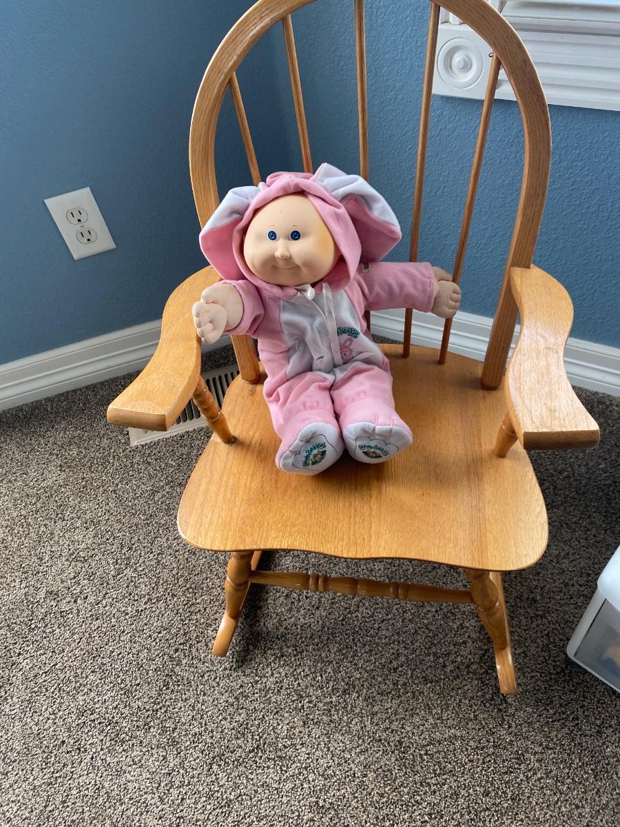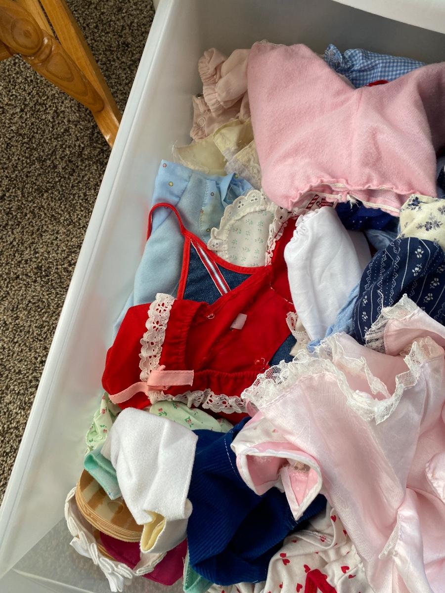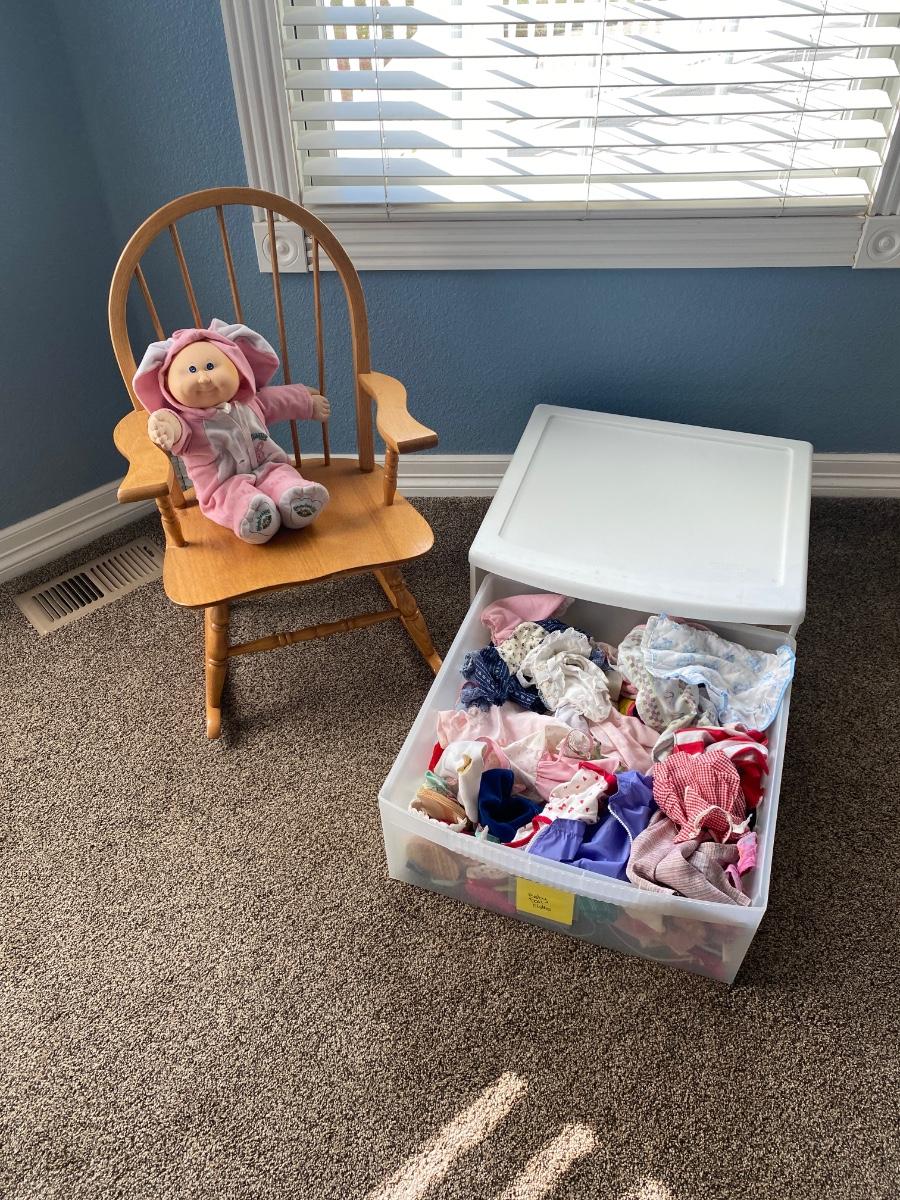 CHILD SIZE ROCKING CHAIR AND TOTE FULL OF DOLL CLOTHES