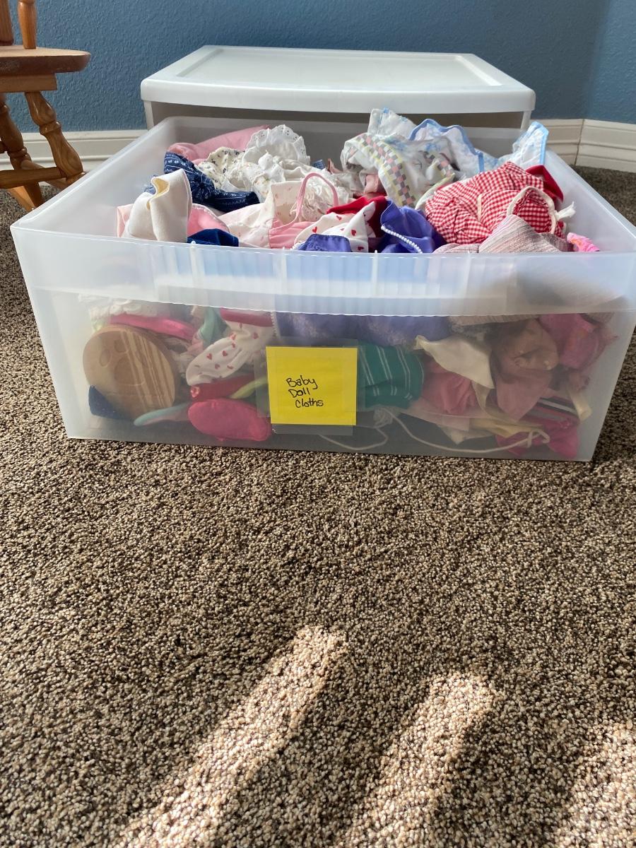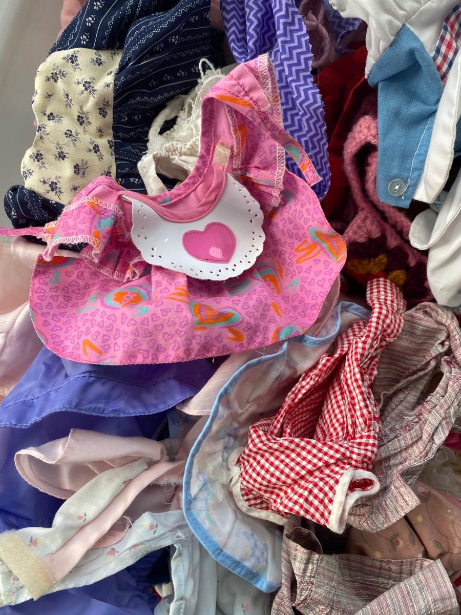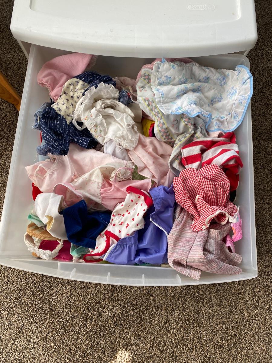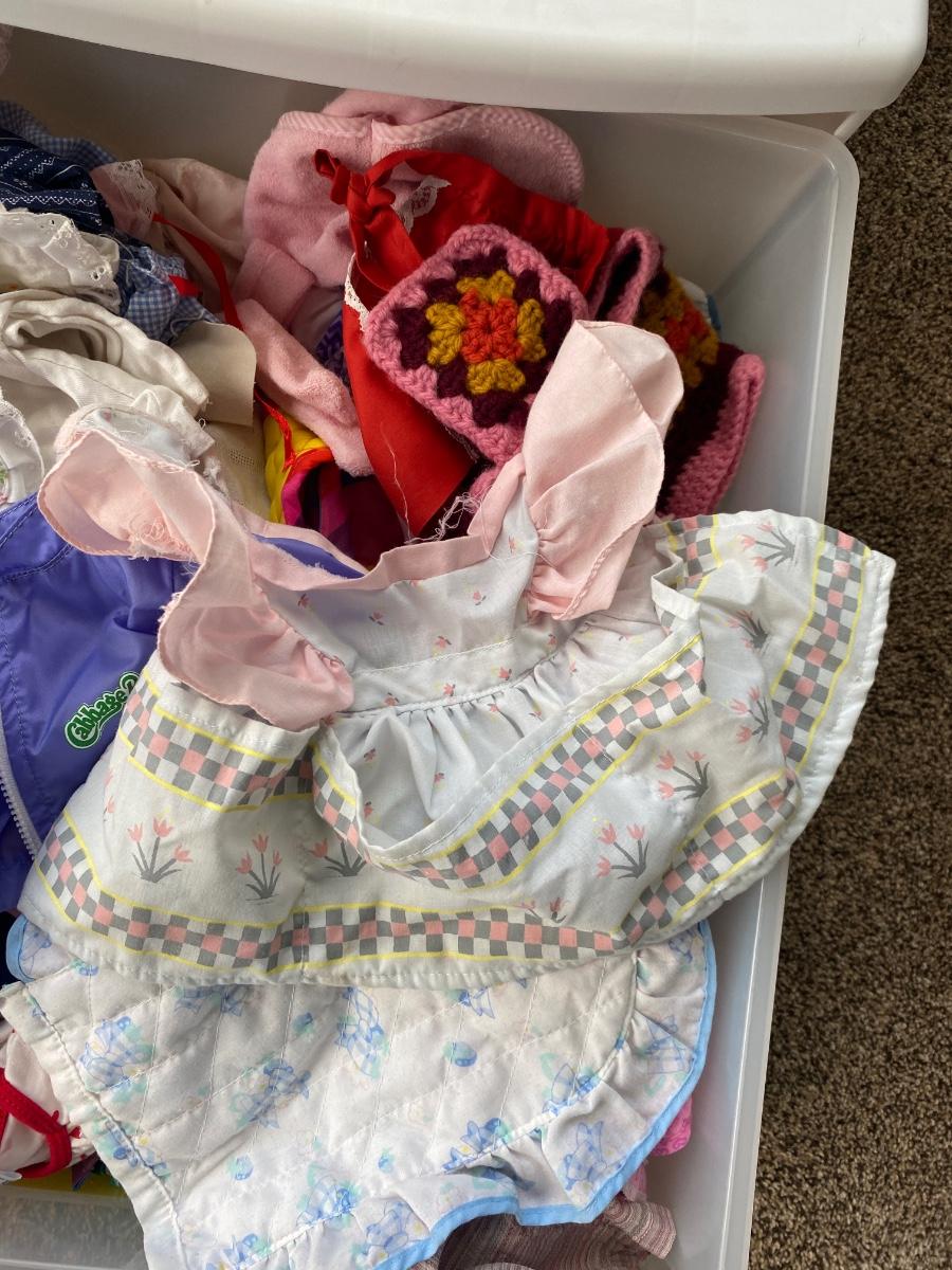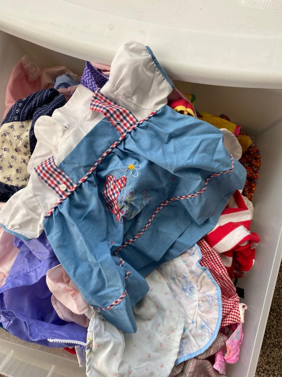 CHILD SIZE ROCKING CHAIR AND TOTE FULL OF DOLL CLOTHES