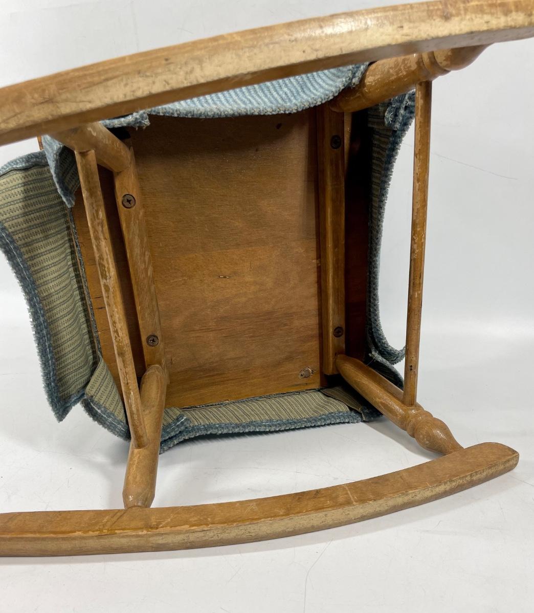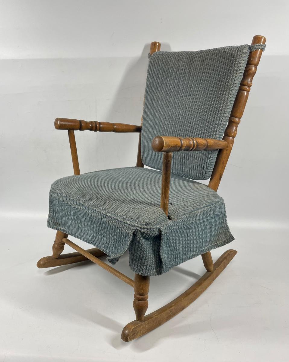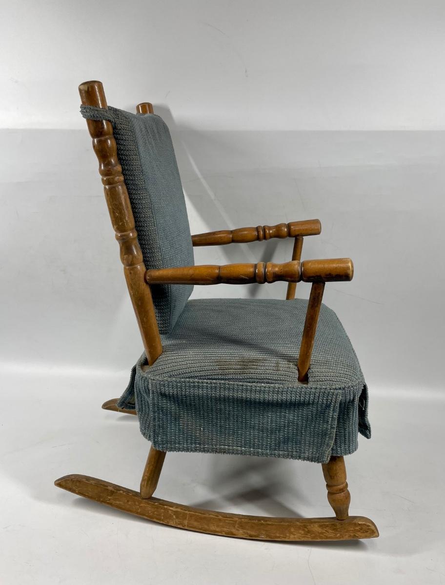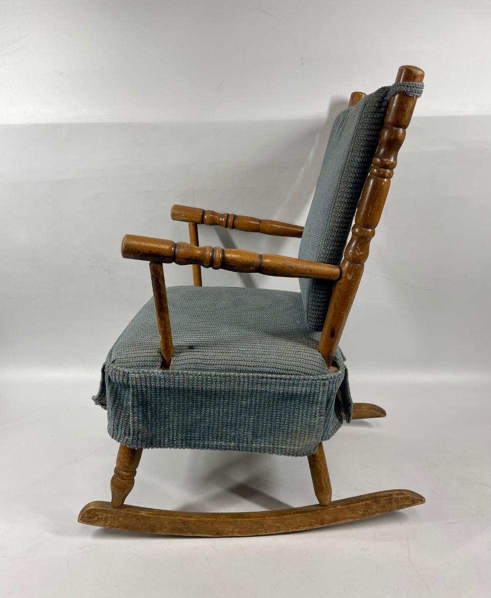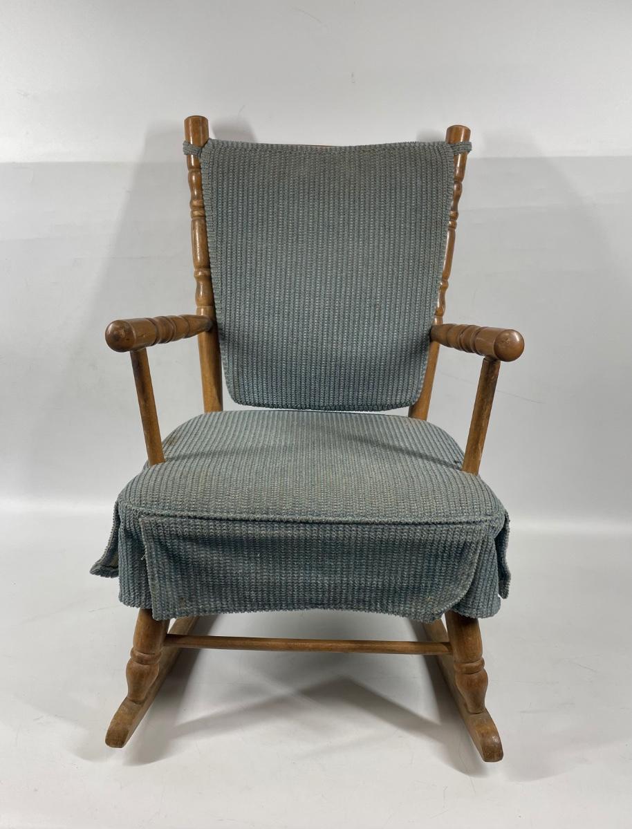 Child size vintage rocking chair. Has back and seat cushions. 29” long rockers, approx 24" tall.