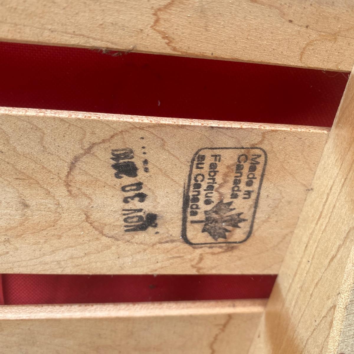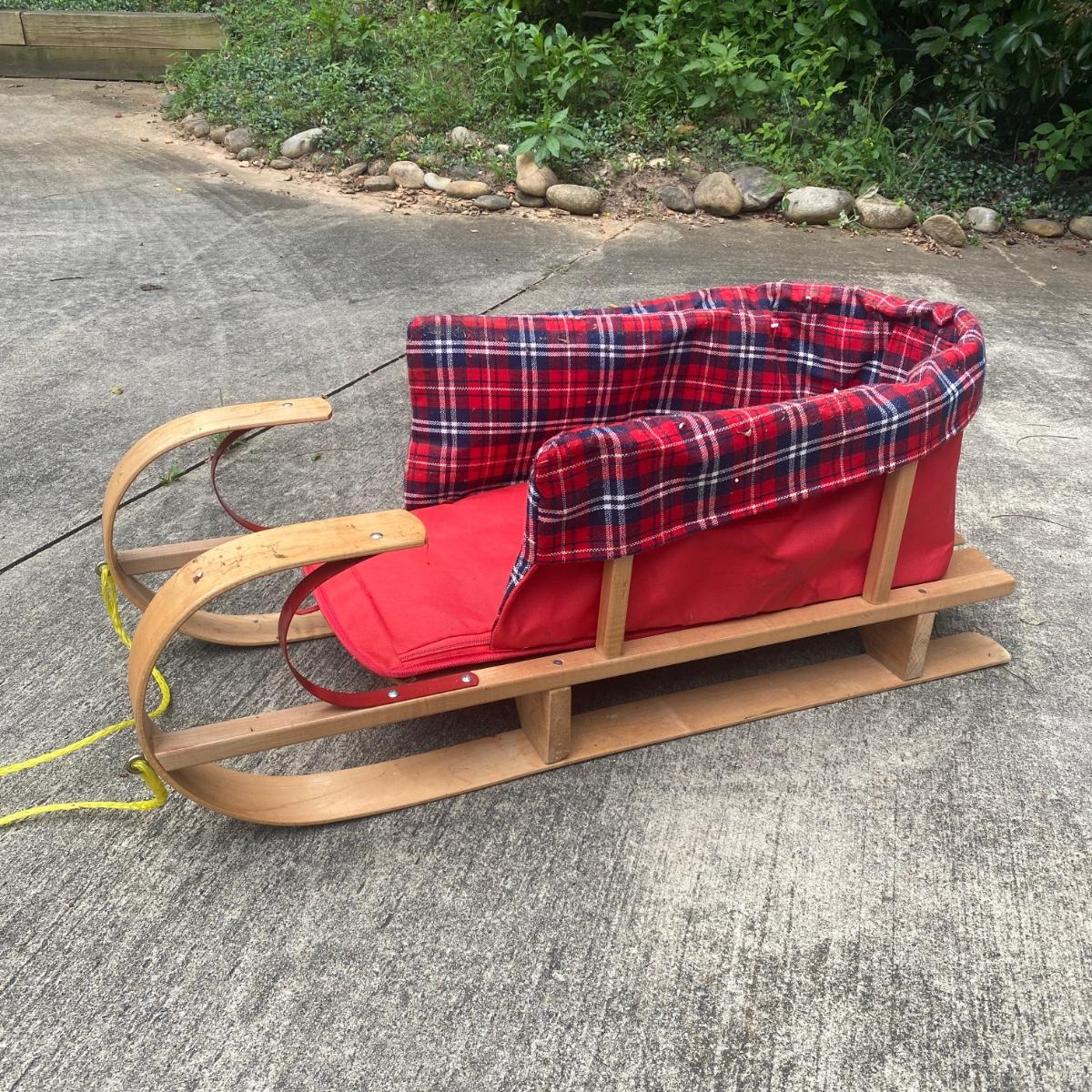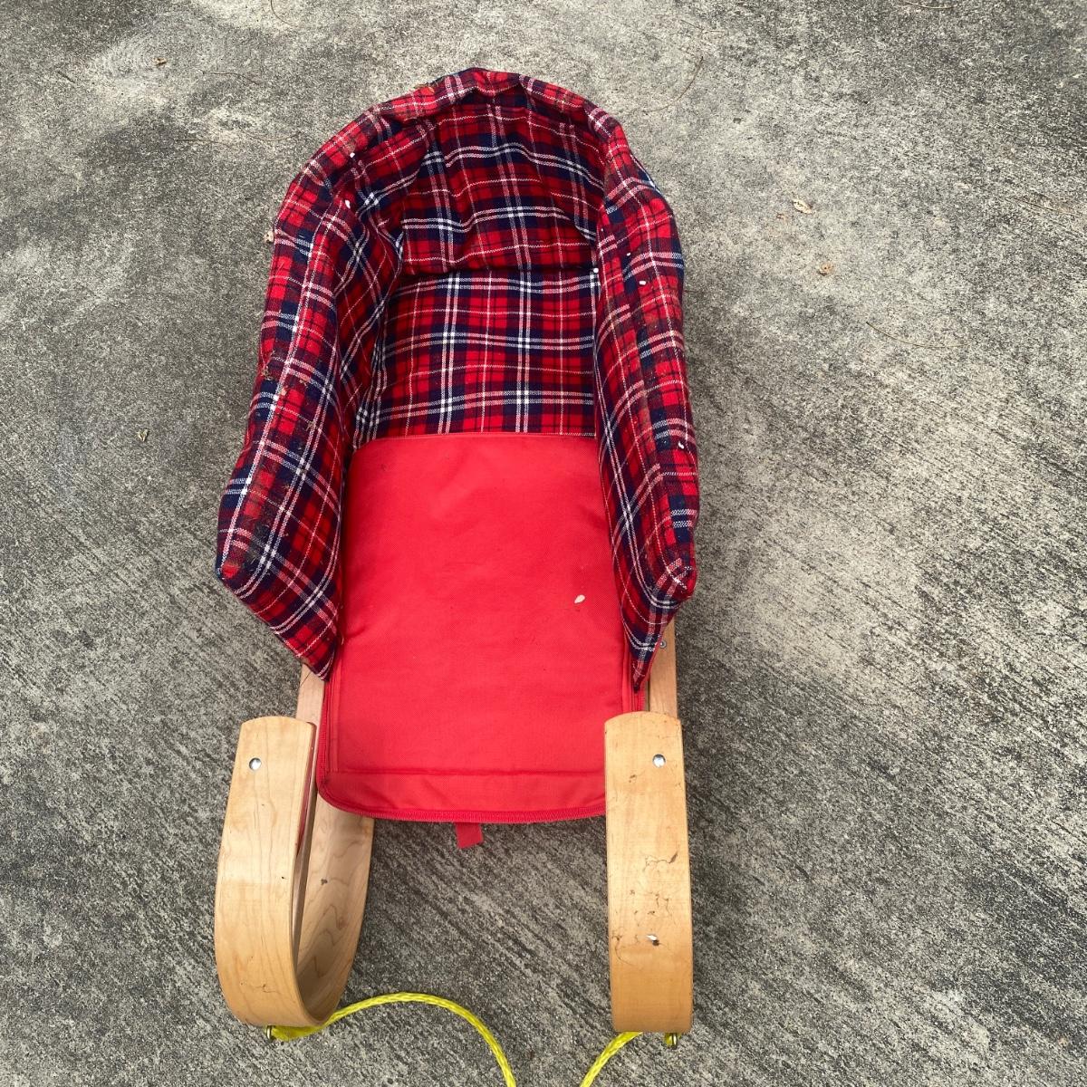 Sweet small sled with padding for comfort. Looks like it’s made for a child. Stamped “Made in Canada” with One Step Ahead brand cushion. Yellow cord for pulling. Could use a cleaning. Measures 34” long x 12” high x 16” wide. Local pick up only.