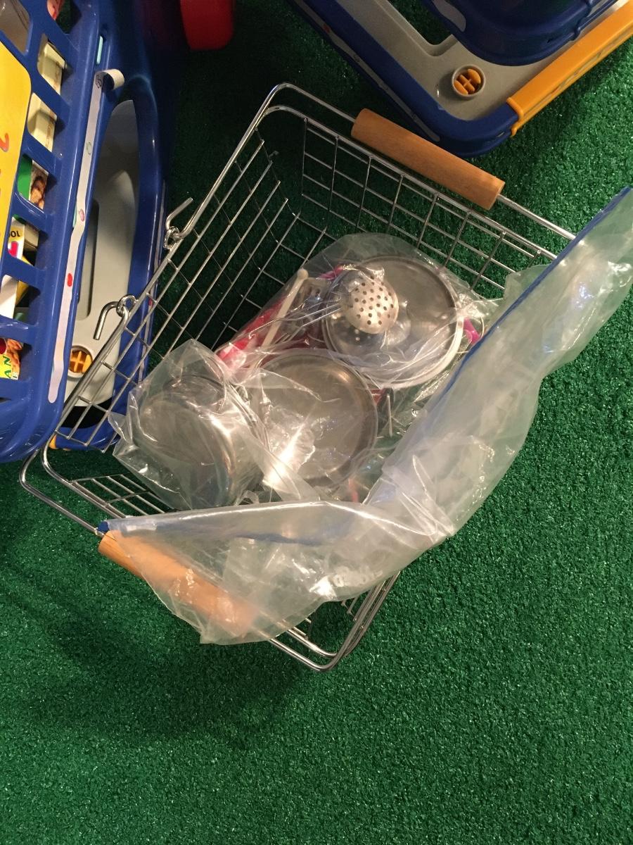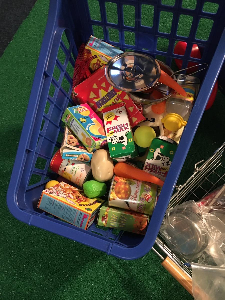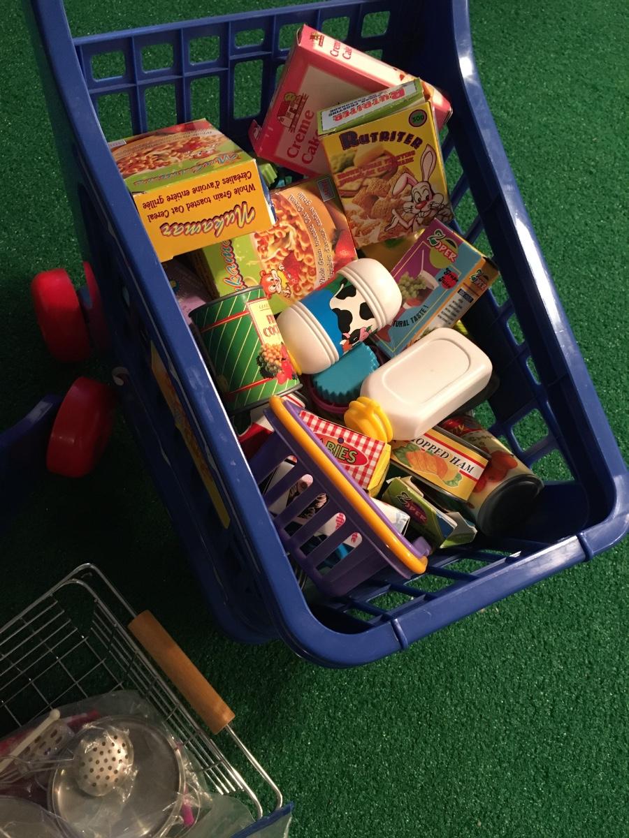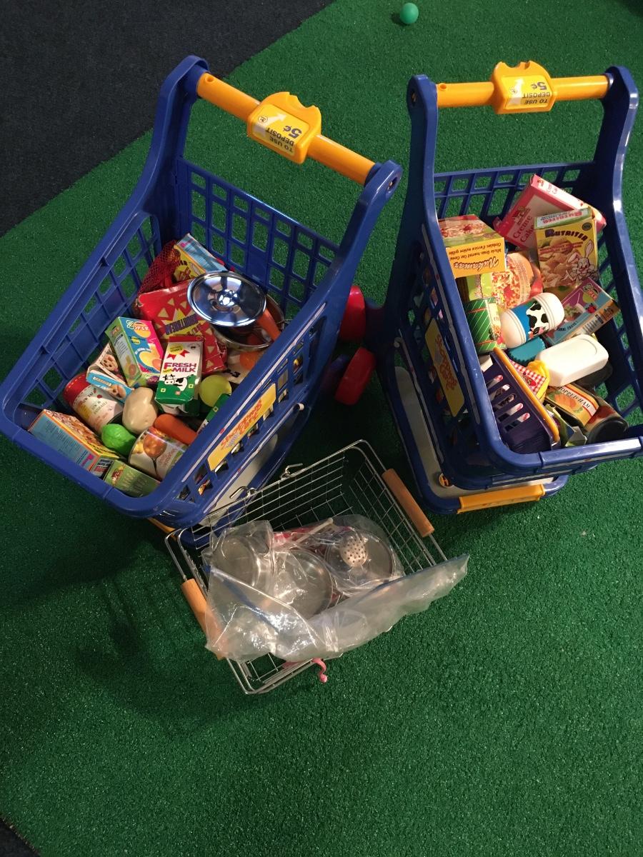 Pair of kids grocery carts loaded with groceries! Comes with metal hand basket for those quick shopping trips!
