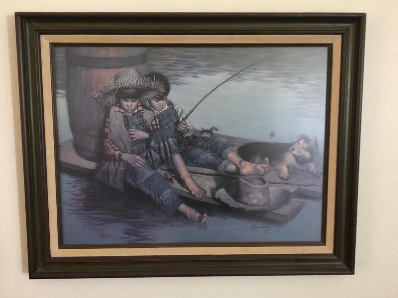 Lovely print by Jim Daly. Two kids fishing on a make shift raft.
