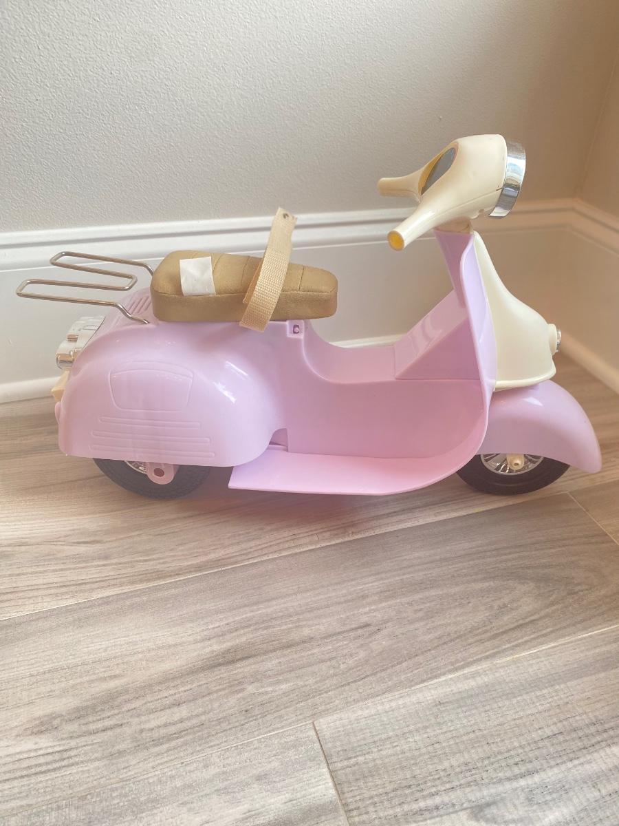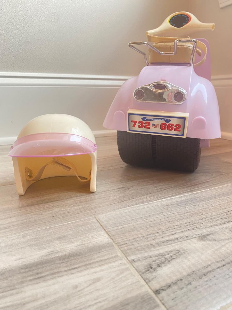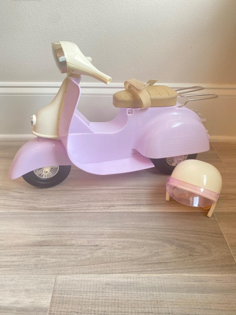 1- Doll Scooter ( non-motorized) & Helmet by Battat. Seat has minor wear. 20”x 13”