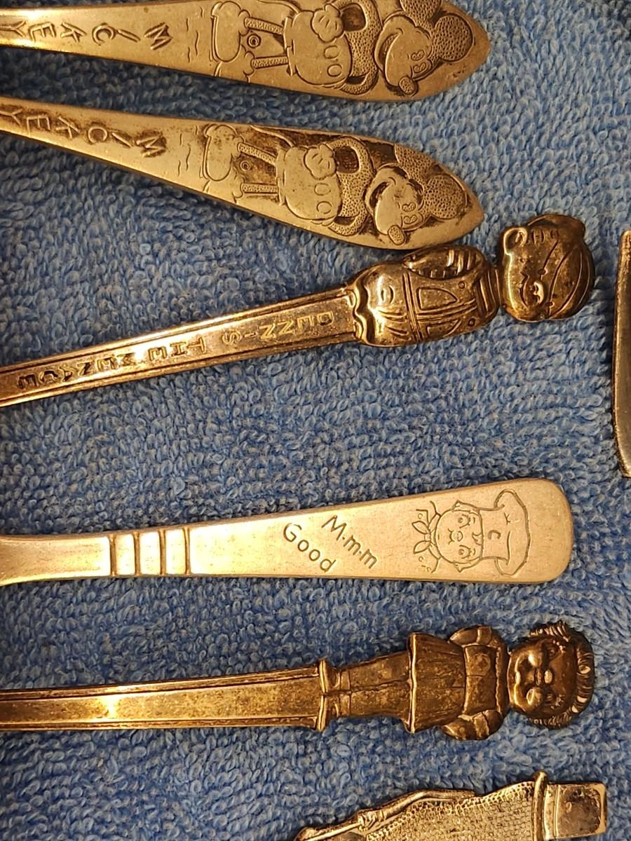 Take a good look at these pictures or stop in to see this lot. Awesome grouping of kids silverware, Mickey Mouse, Campbell's soup, peanuts, 3 little pigs, Dennis the menace and more. Some sterling.