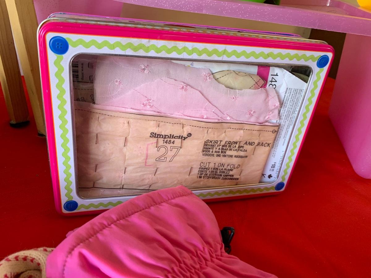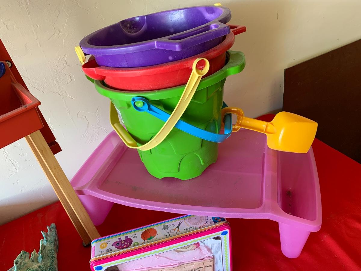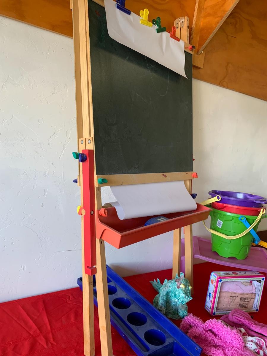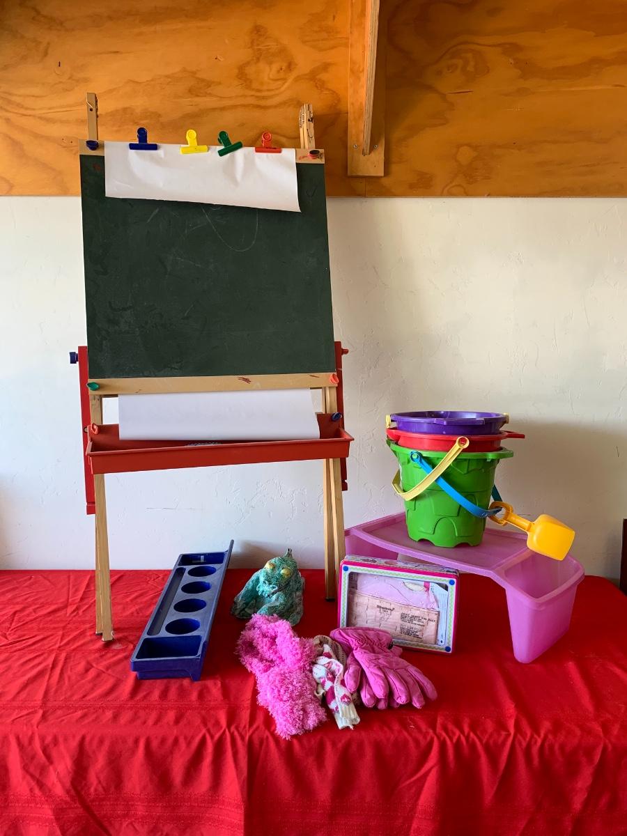 Artwork items including an easel, a sewing kit and a children’s drawing table