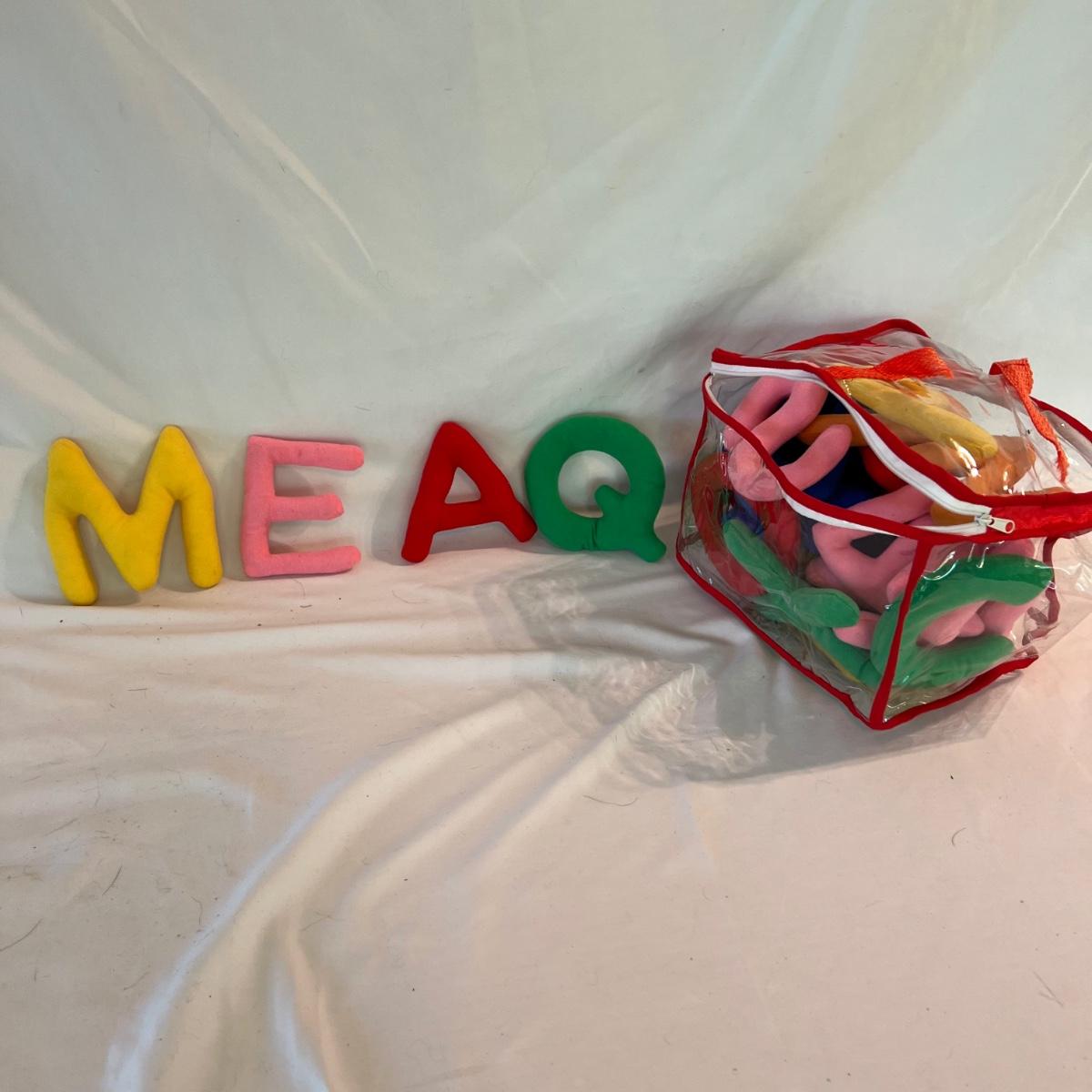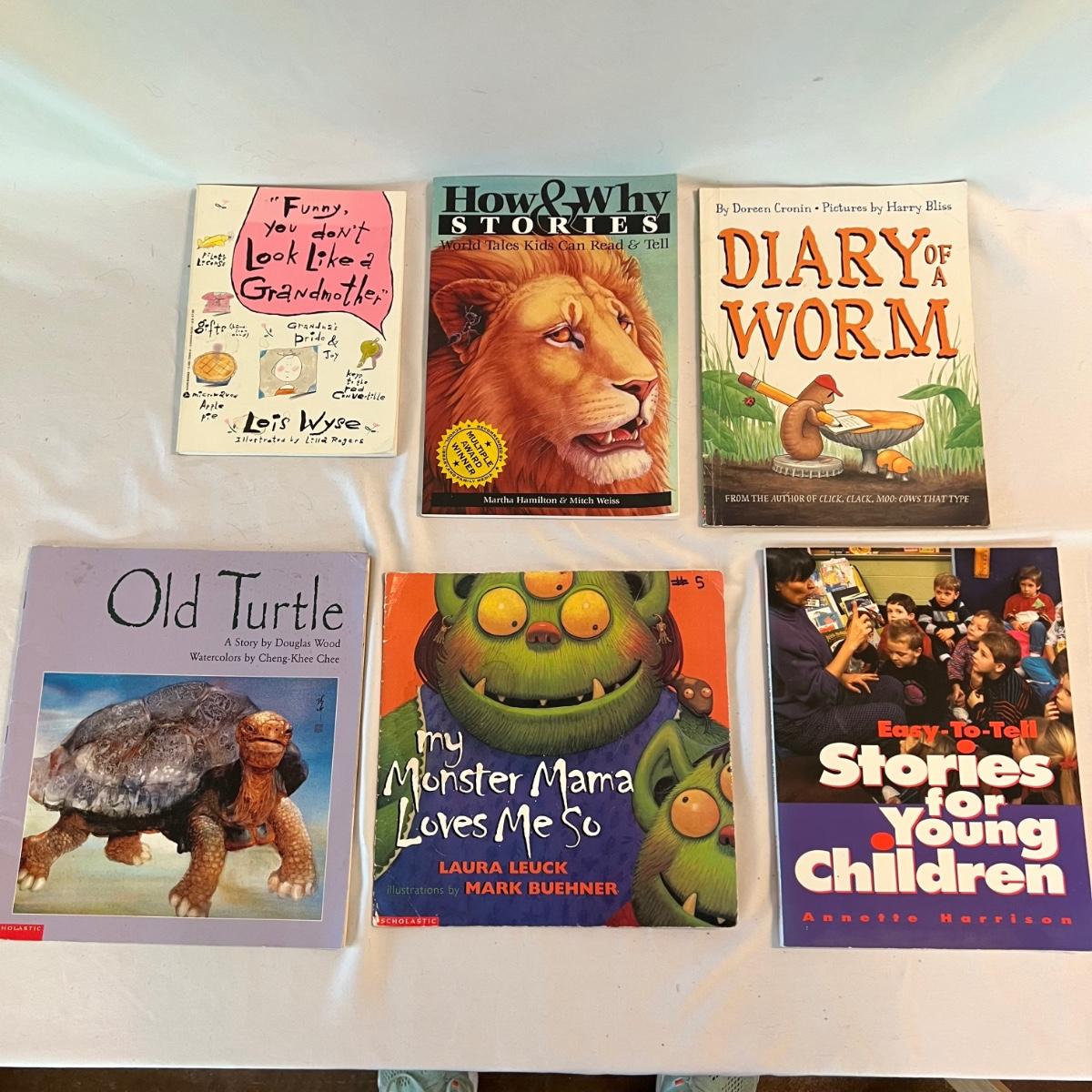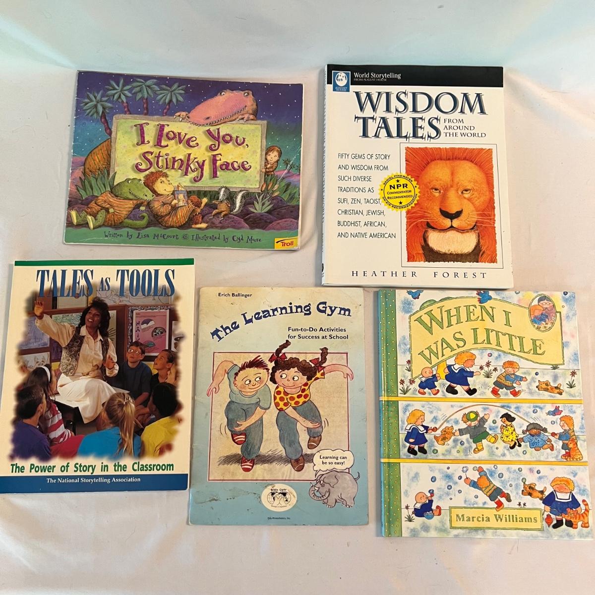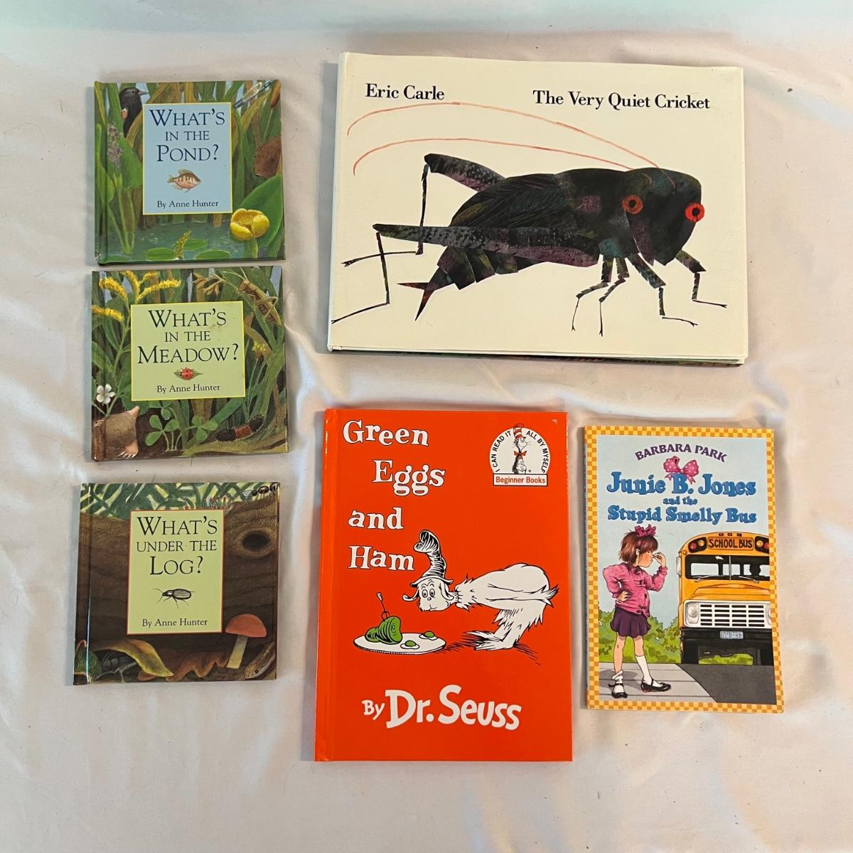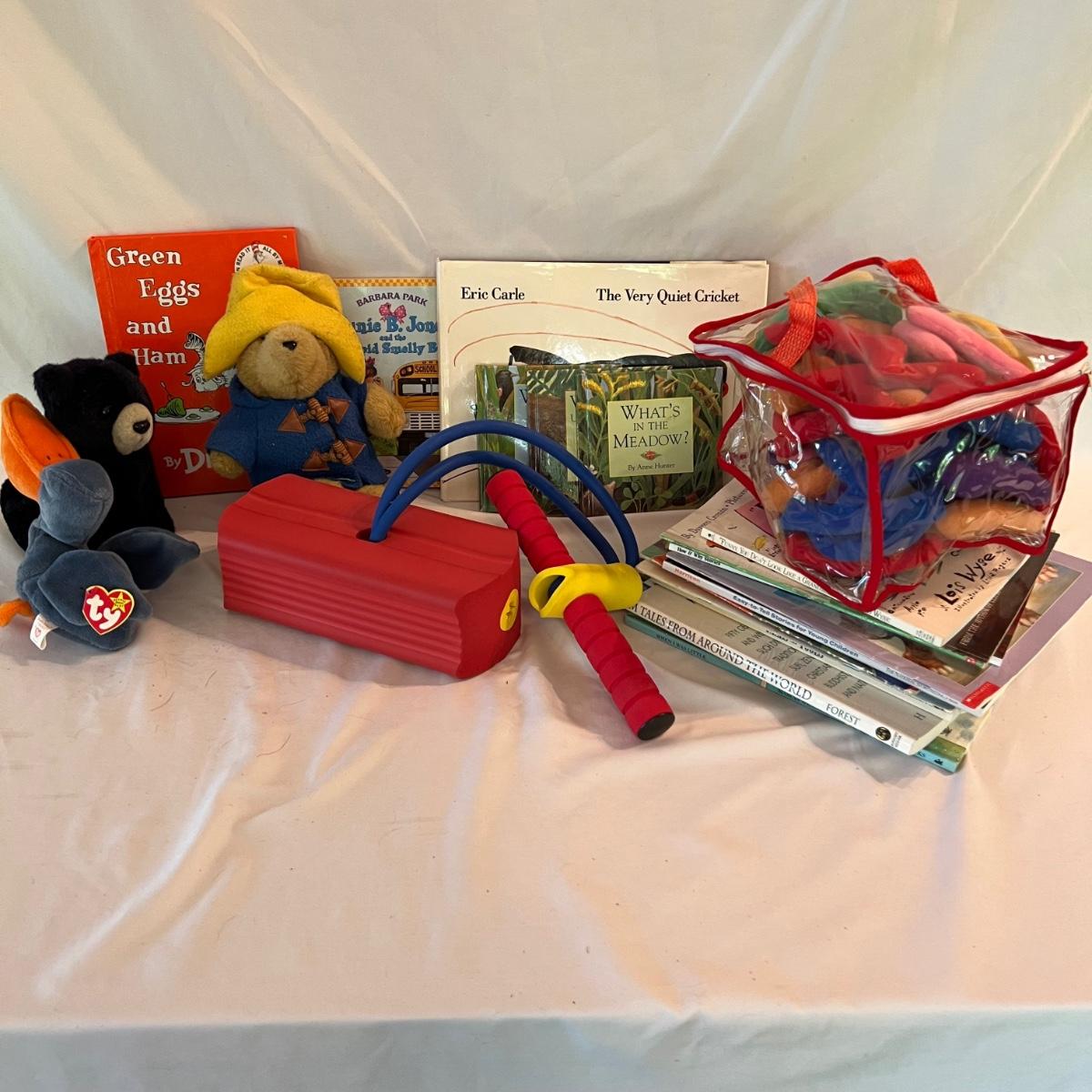 A collection of children’s classic books, three stuffed animals and a set of stuffed letters and jumping toy. Paddington Bear measures 7" x 10".