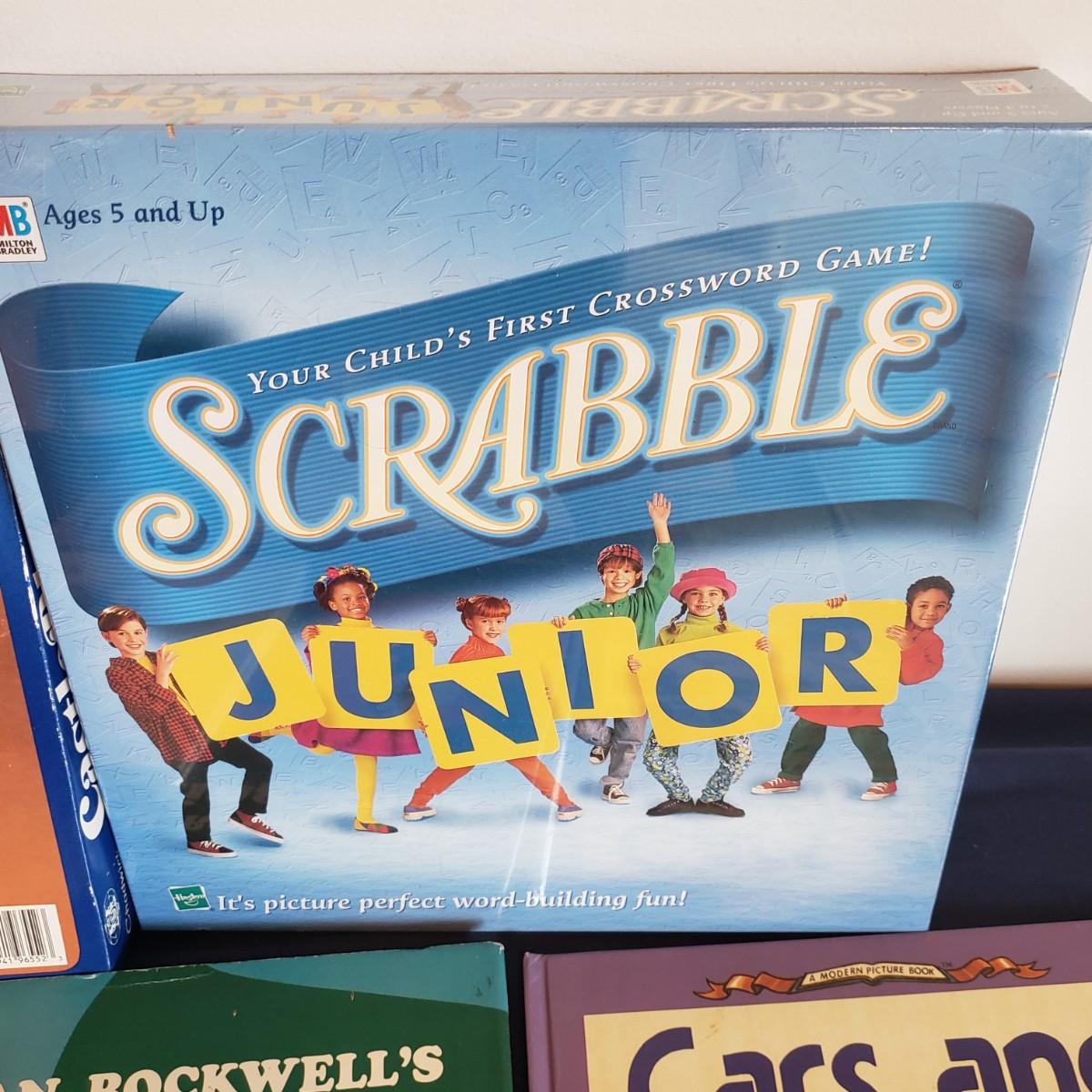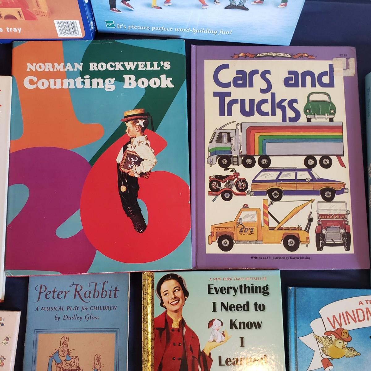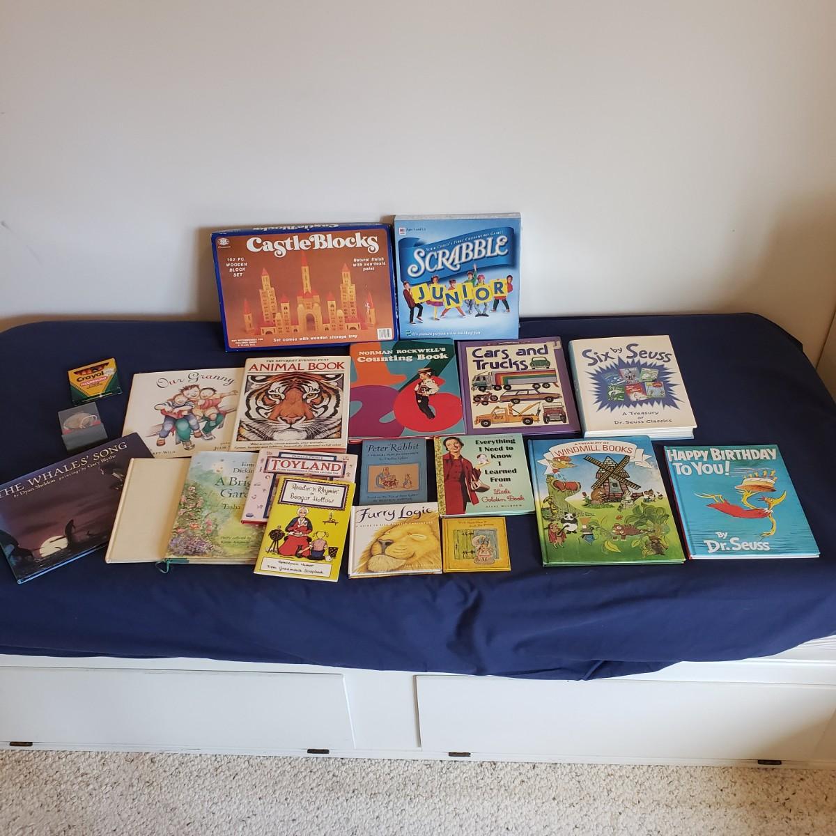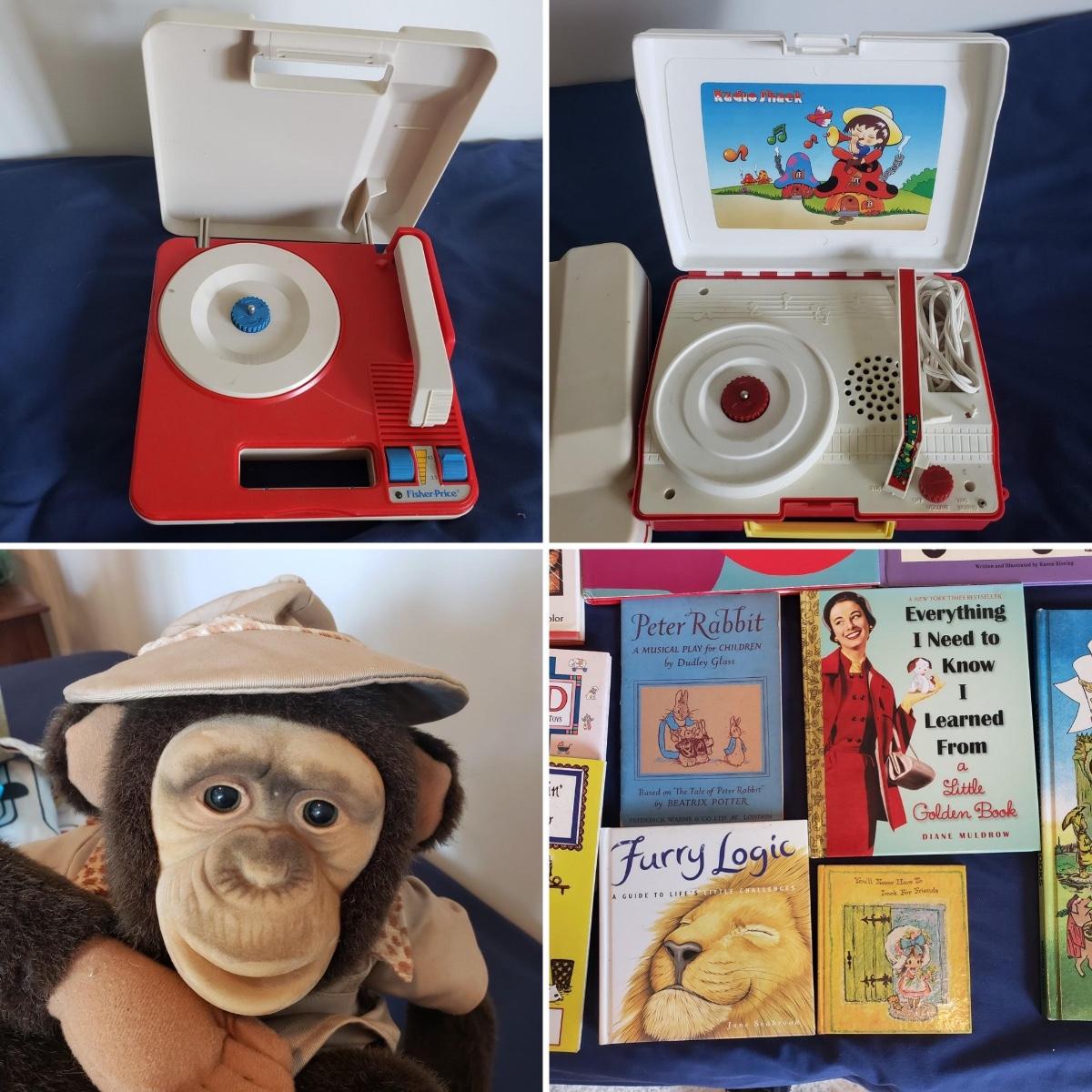 Books and Toys how fun! This lot includes a variety of children's books including a Norman Rockwell counting book and a collection of Dr. Suess books. There is also a yoyo, with no markings, a NIB Scrabble Junior, a wooden castle making set, a Mickey Mouse children's size sleeping bag, a monkey puppet and a hard cardboard castle foldout. A late add on are two children's record players. One is a Radio Shack record player and the other is a Fisher Price battery operated record player. The Radio Shack powers on when plugged in. The Fisher Price needs batteries, so we were unable to check, so we cannot guarantee it works and it is missing the battery cover.