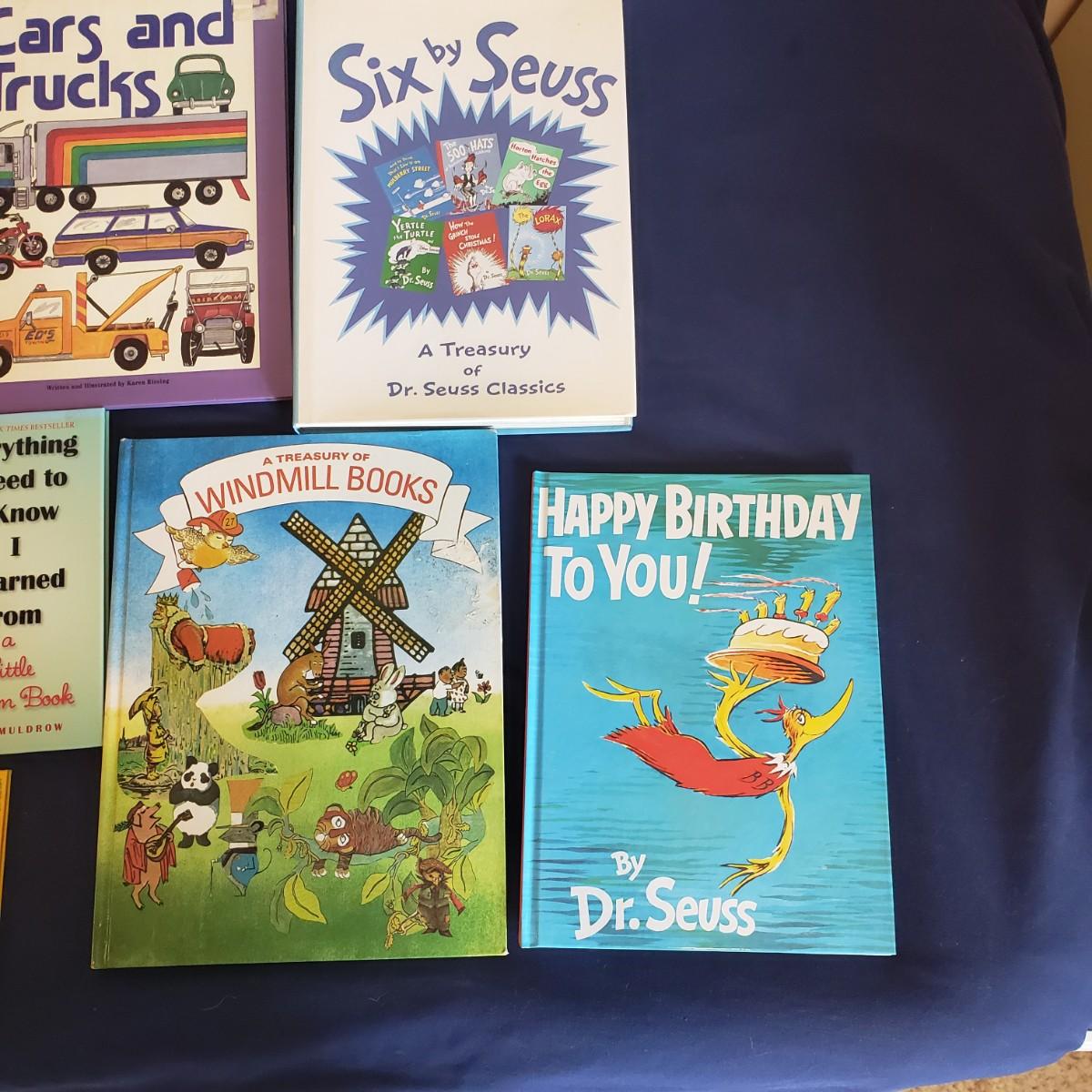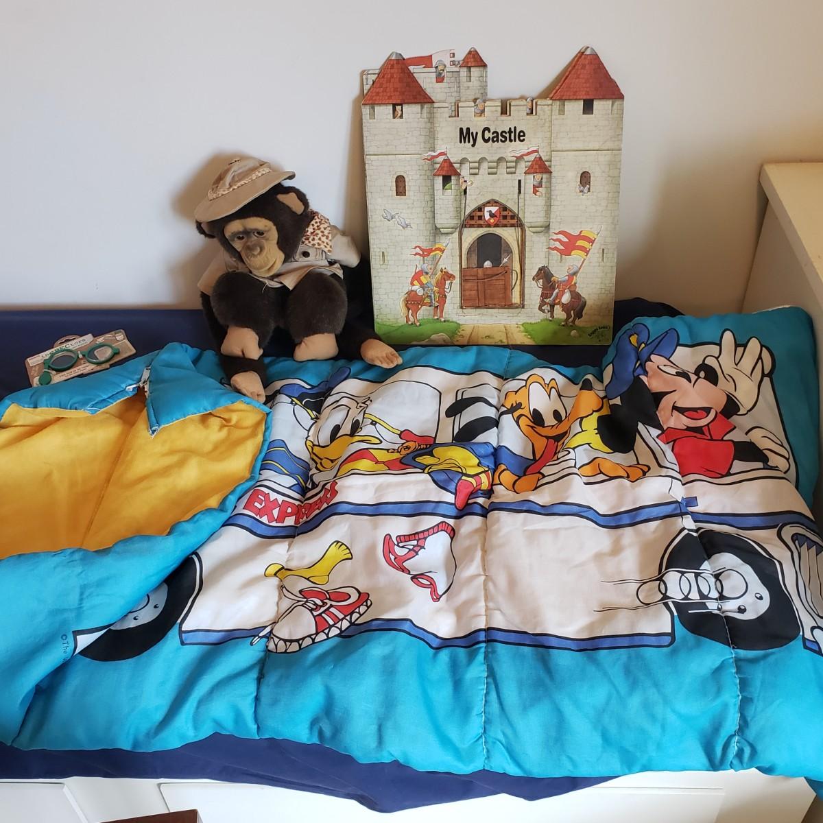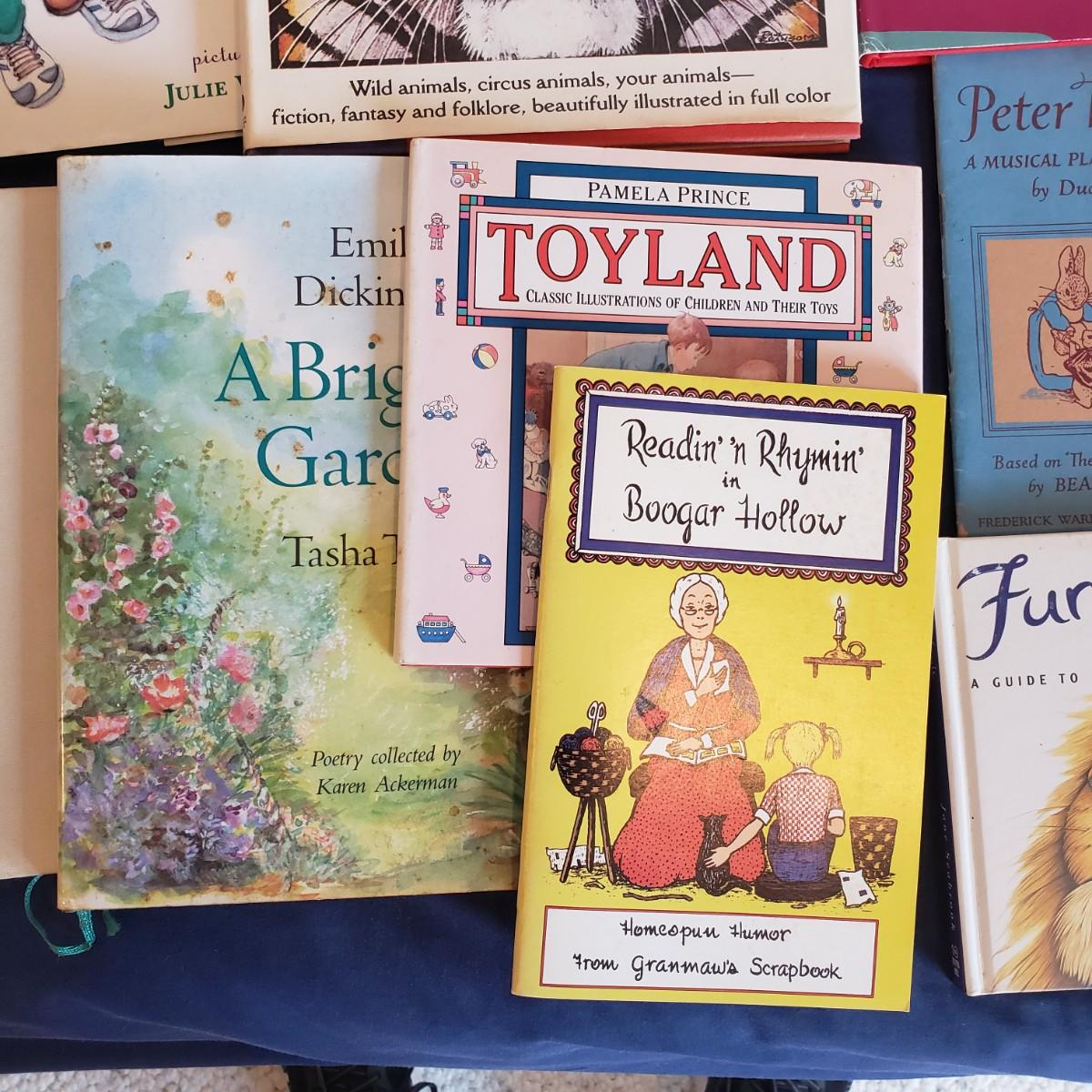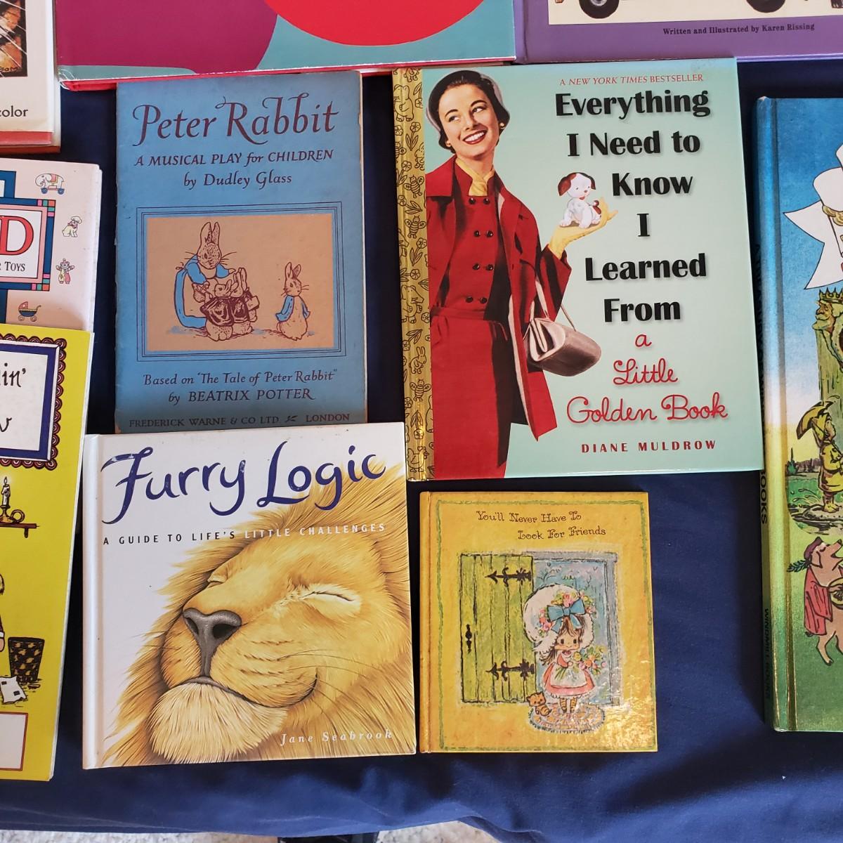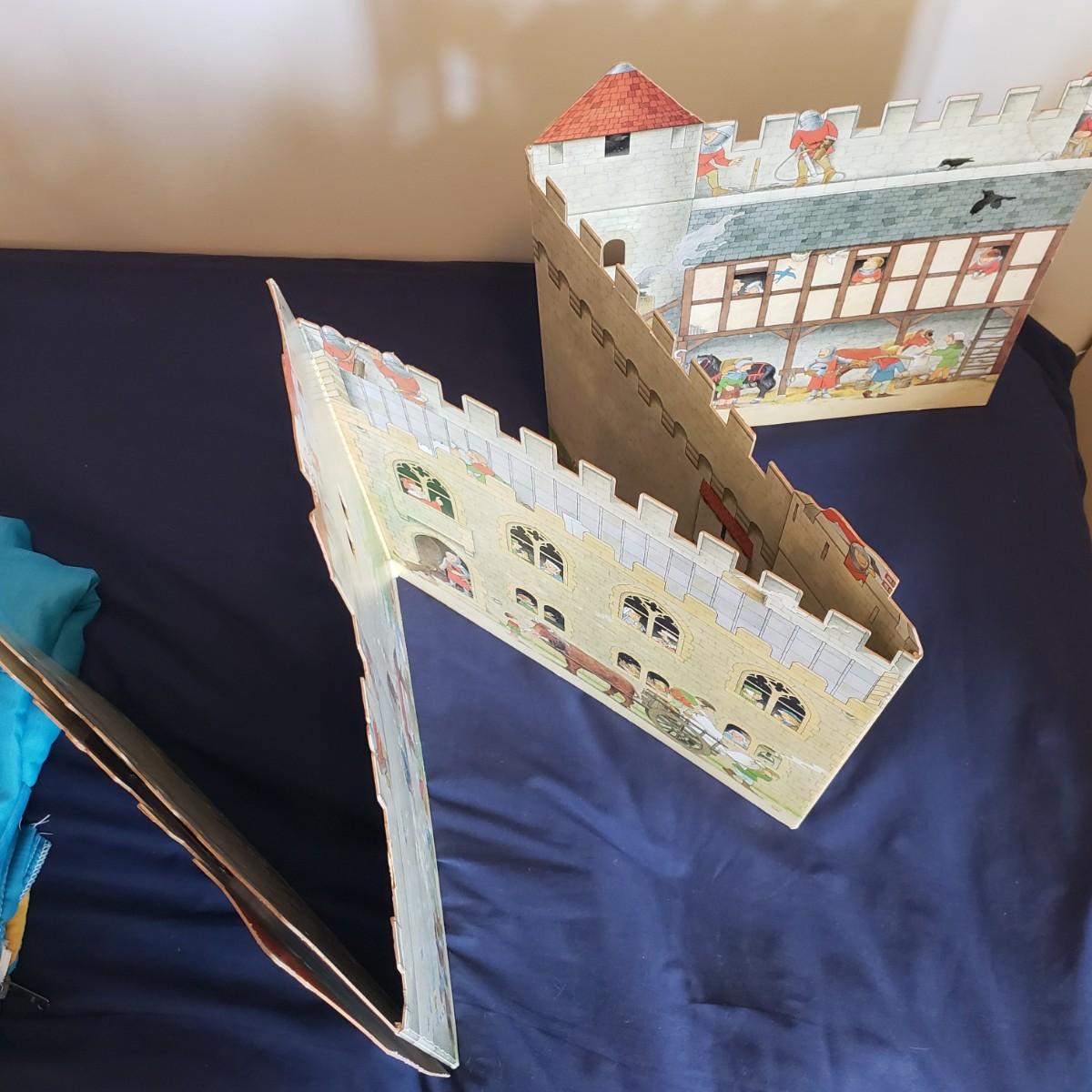 Books and Toys how fun! This lot includes a variety of children's books including a Norman Rockwell counting book and a collection of Dr. Suess books. There is also a yoyo, with no markings, a NIB Scrabble Junior, a wooden castle making set, a Mickey Mouse children's size sleeping bag, a monkey puppet and a hard cardboard castle foldout. A late add on are two children's record players. One is a Radio Shack record player and the other is a Fisher Price battery operated record player. The Radio Shack powers on when plugged in. The Fisher Price needs batteries, so we were unable to check, so we cannot guarantee it works and it is missing the battery cover.