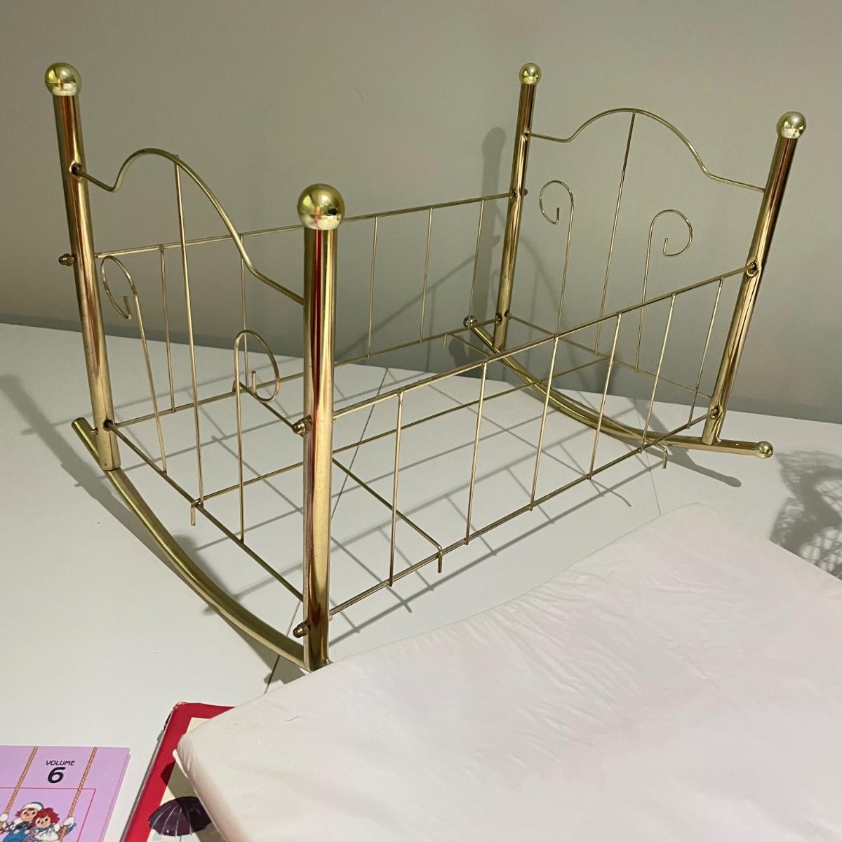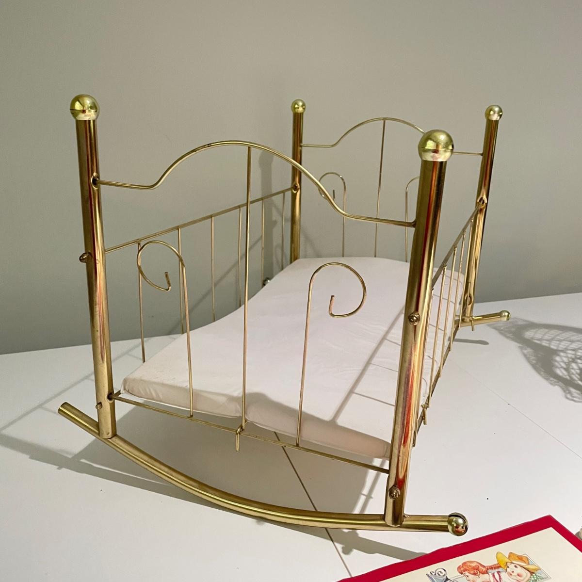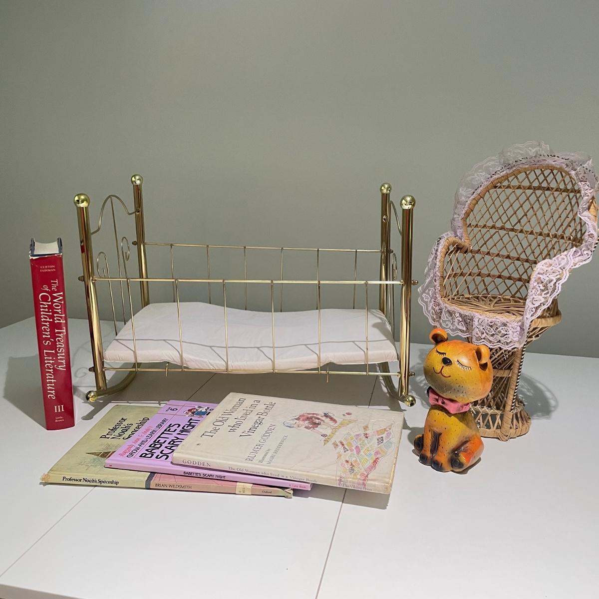 Four vintage children’s books including The World Treasury of Children’s Literature. A lightweight resin bank, it does not include a stopper for the bottom. Lot also features a brass colored doll crib for display only and a woven doll chair with purple lace. Crib measures 20” x 15.5” x 13”, it is missing one bulb on the edge of the base and comes with a foam bed liner. See images, shipping available.