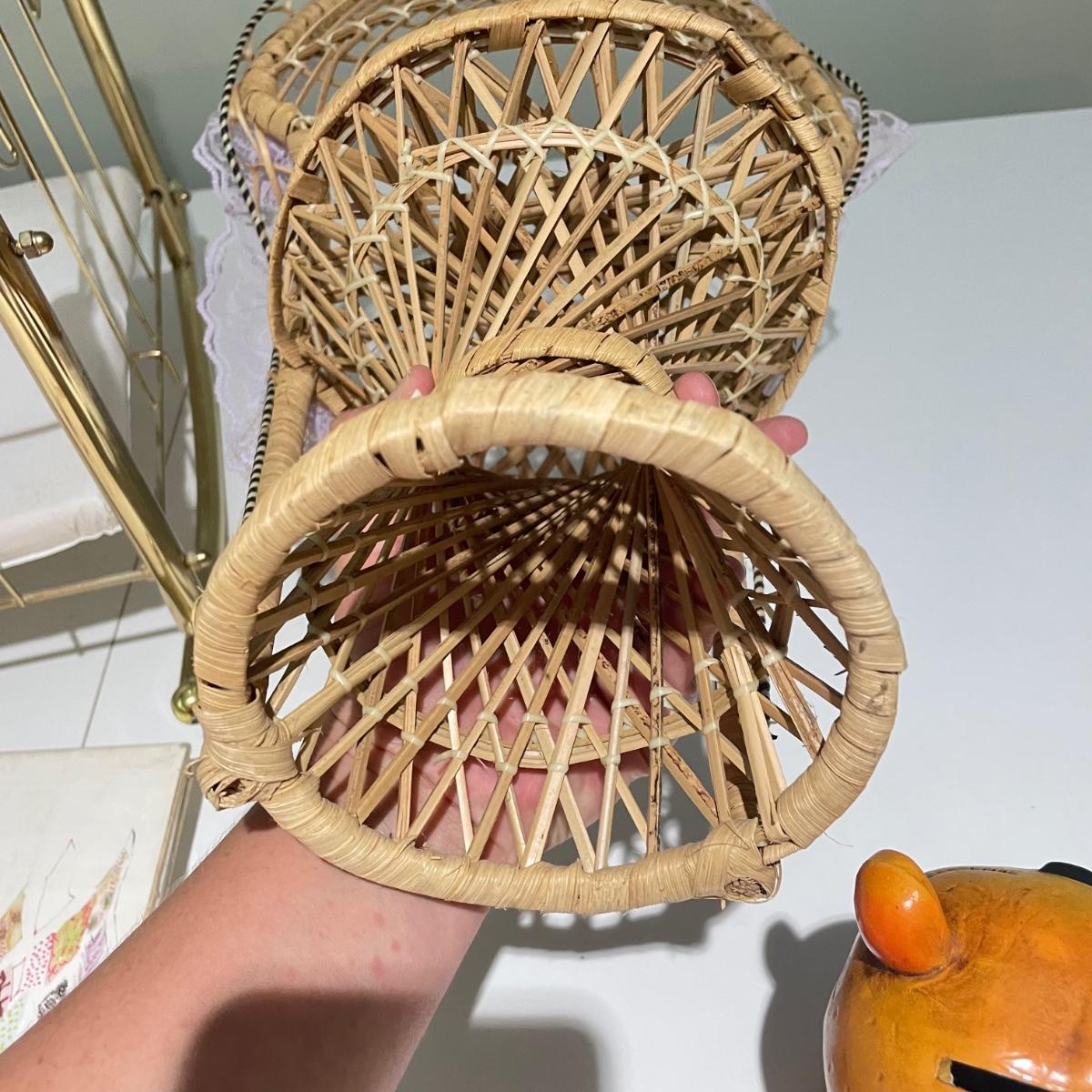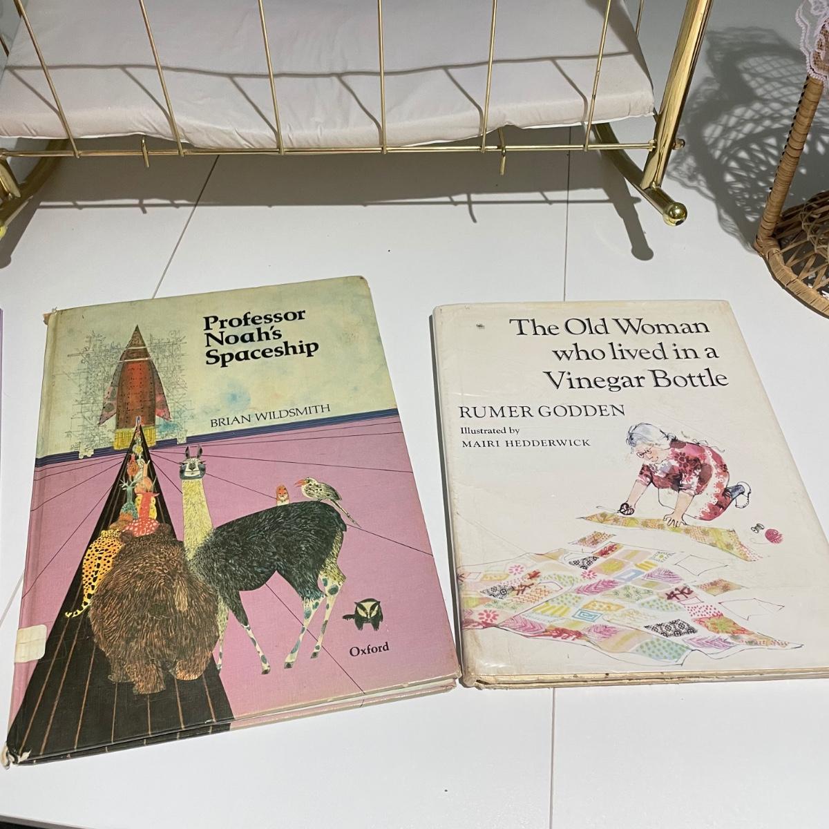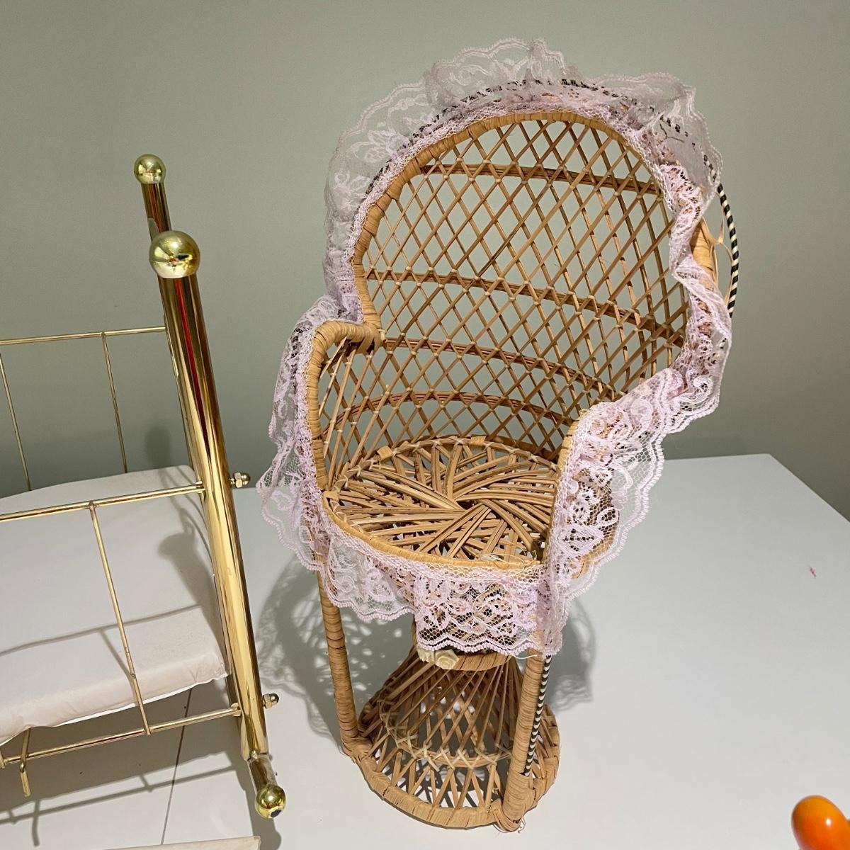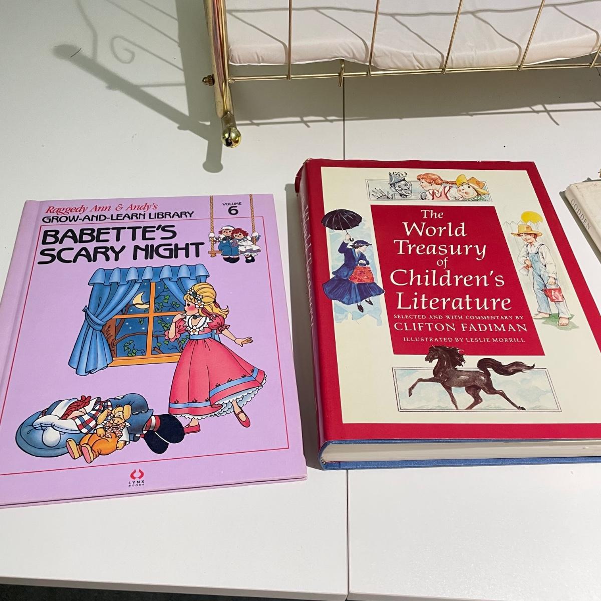 Four vintage children’s books including The World Treasury of Children’s Literature. A lightweight resin bank, it does not include a stopper for the bottom. Lot also features a brass colored doll crib for display only and a woven doll chair with purple lace. Crib measures 20” x 15.5” x 13”, it is missing one bulb on the edge of the base and comes with a foam bed liner. See images, shipping available.