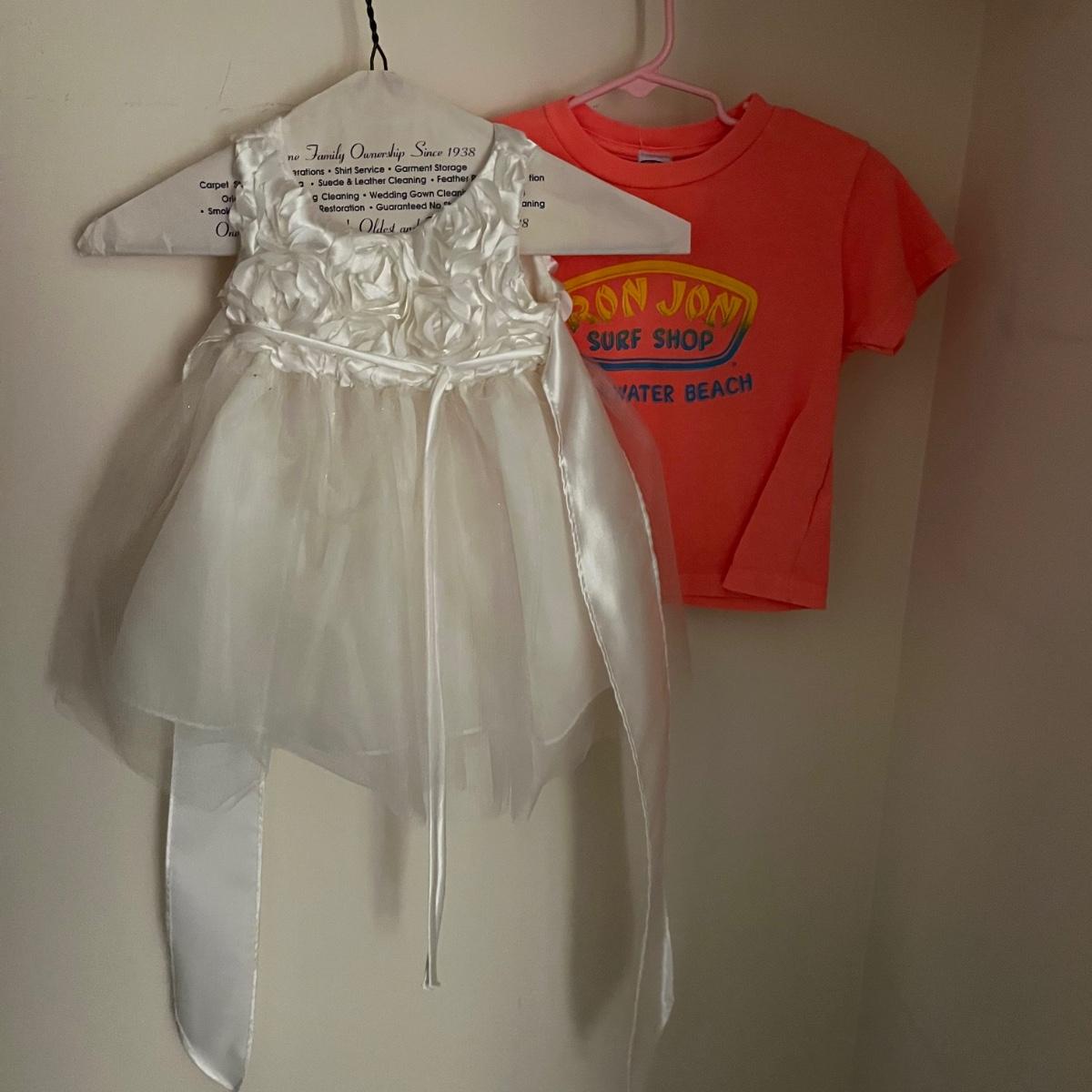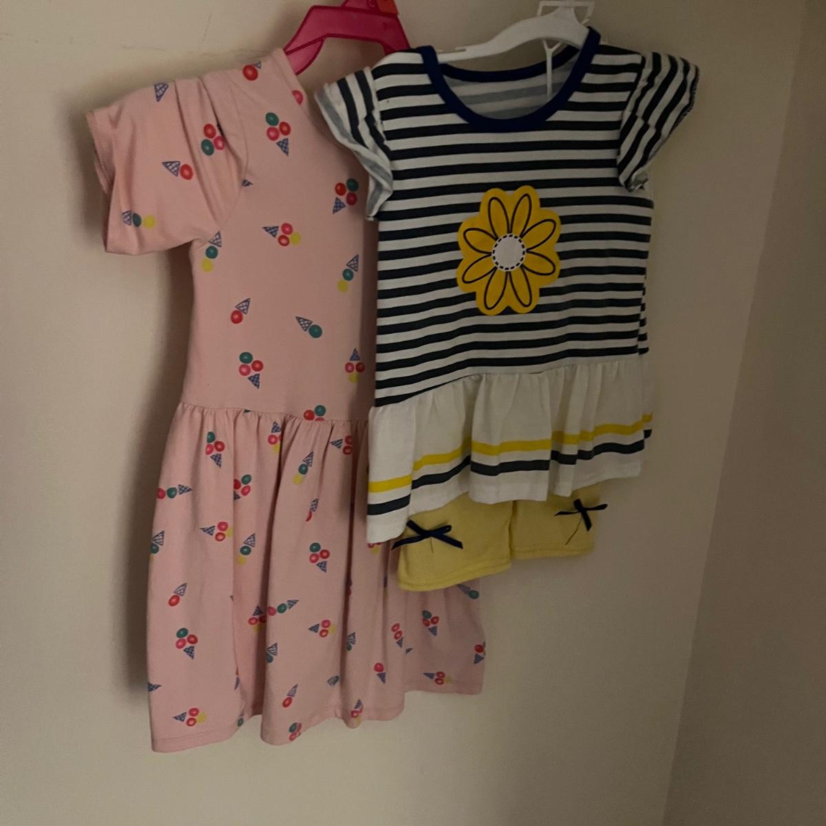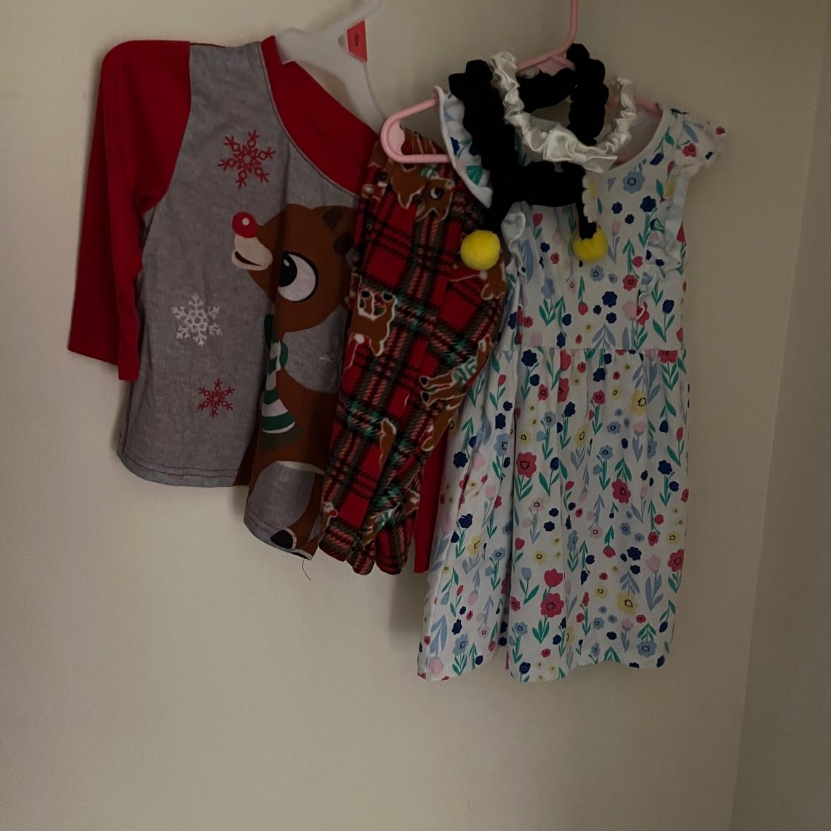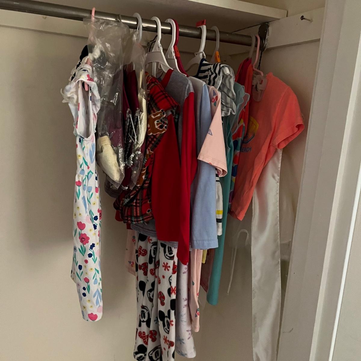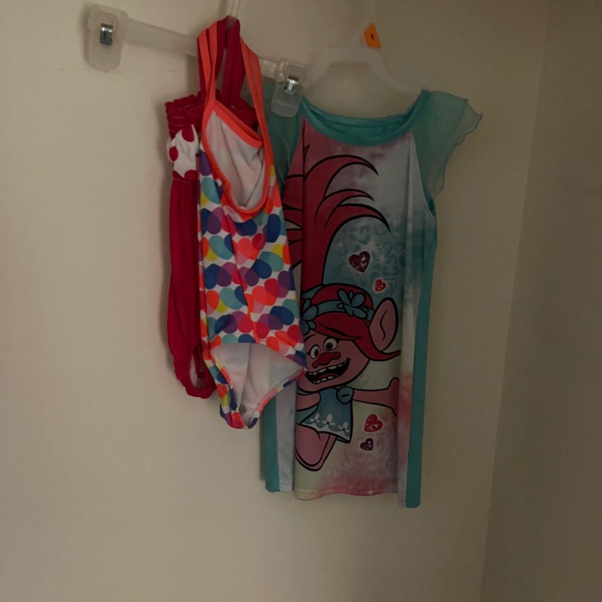Lot includes children’s clothing for six year olds. Includes two dresses, two costumes with sequins, two pants, three t shirts, swimsuit, pajamas and more.
