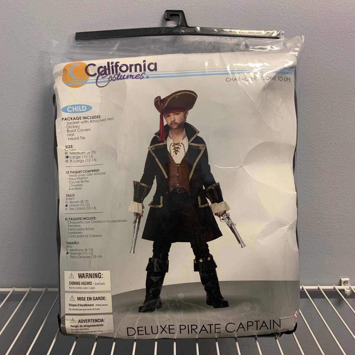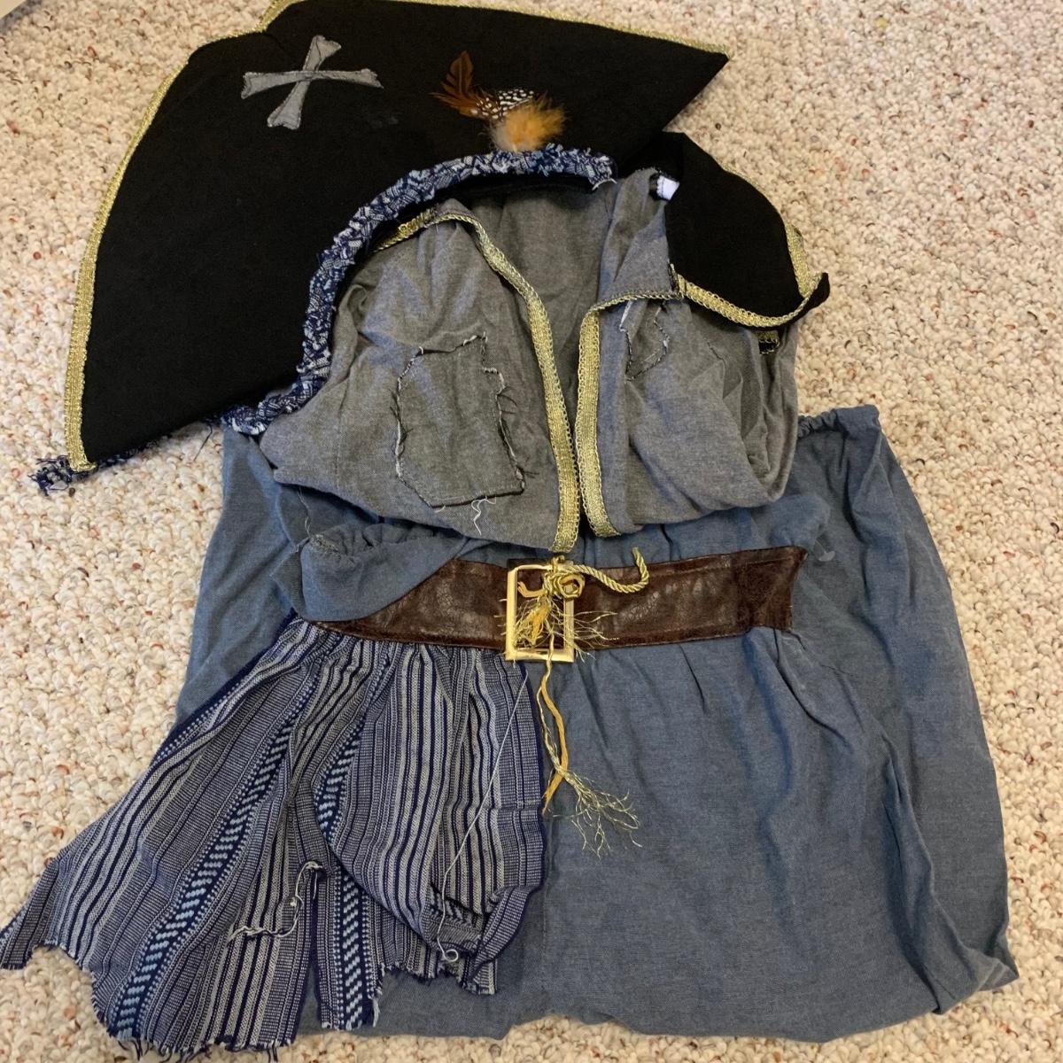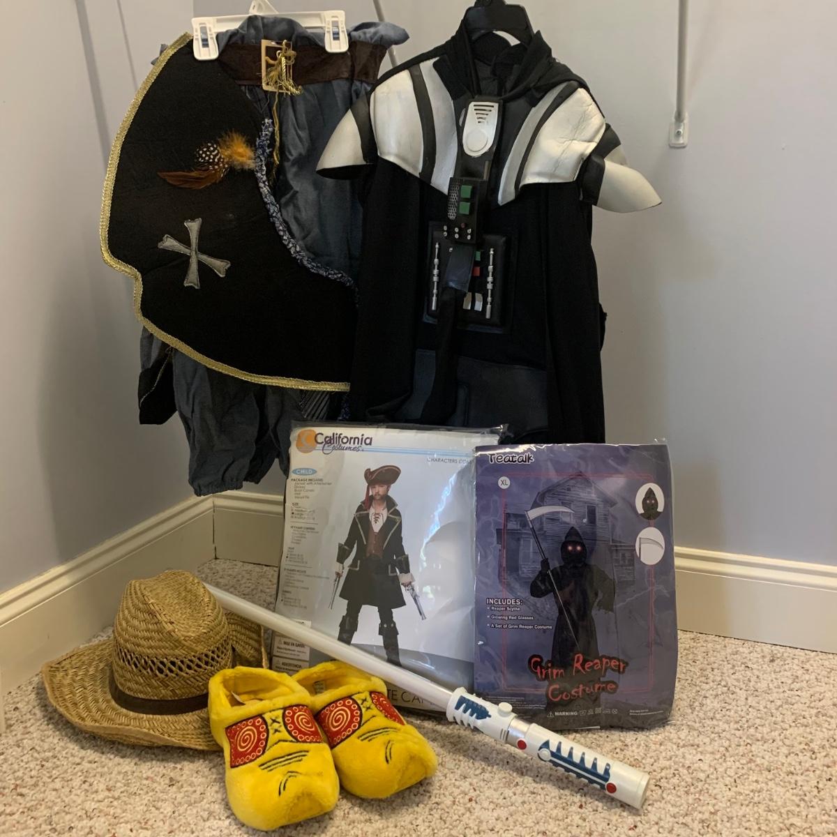 Variety of children costumes in sizes large and extra large. Lot includes pirate costume, Star Wars costume, light saber style sword, straw hat, plush clogs, reaper costume, and Pottery Barn pirate costume. Reaper and pirate are unopened. Please see photos for more details. Shipping available.