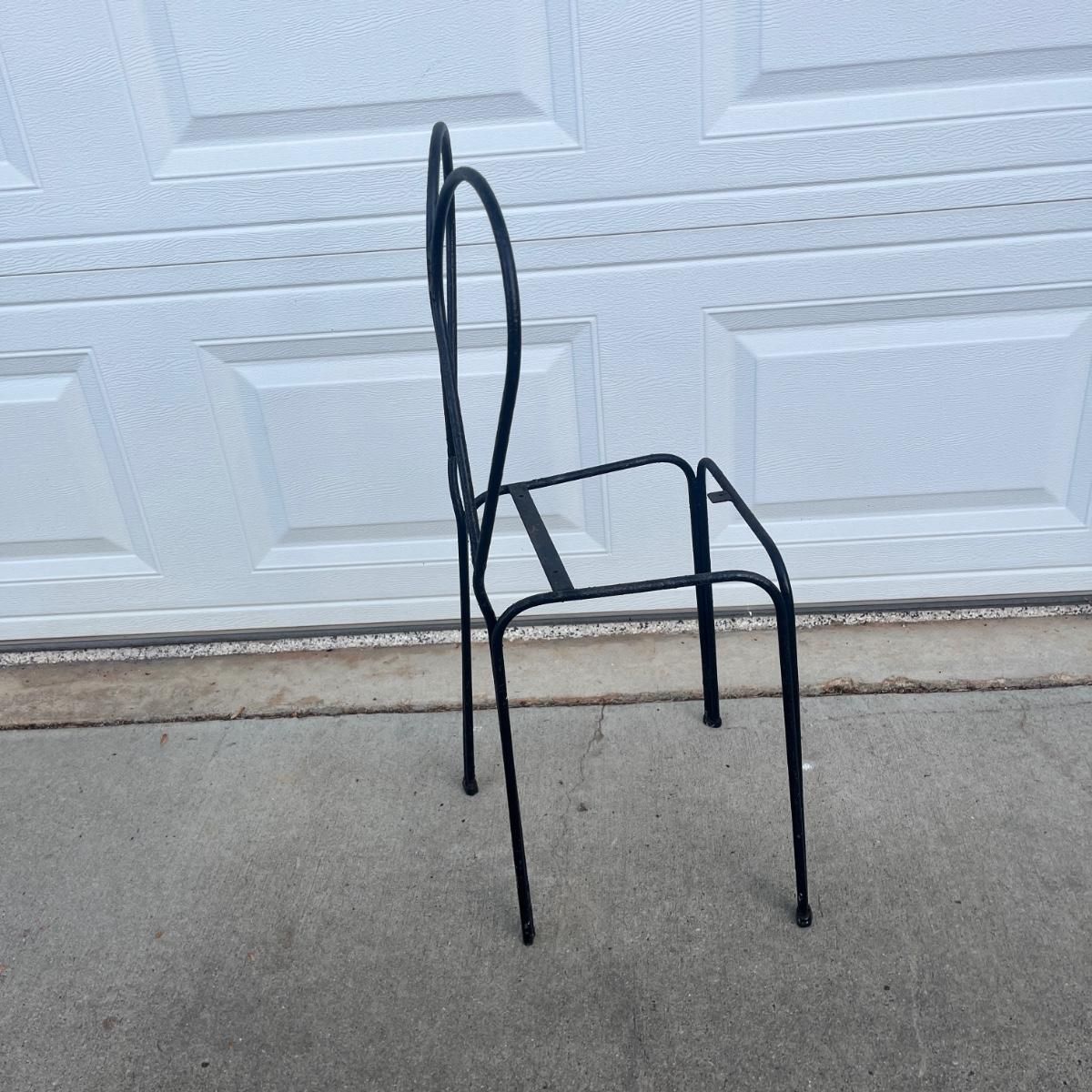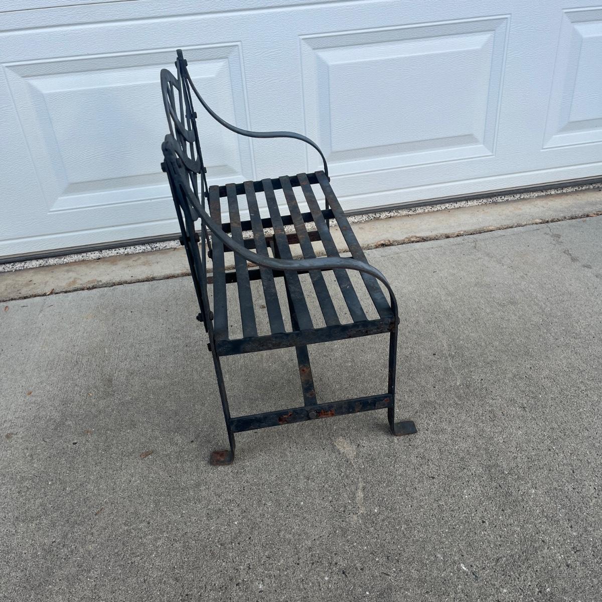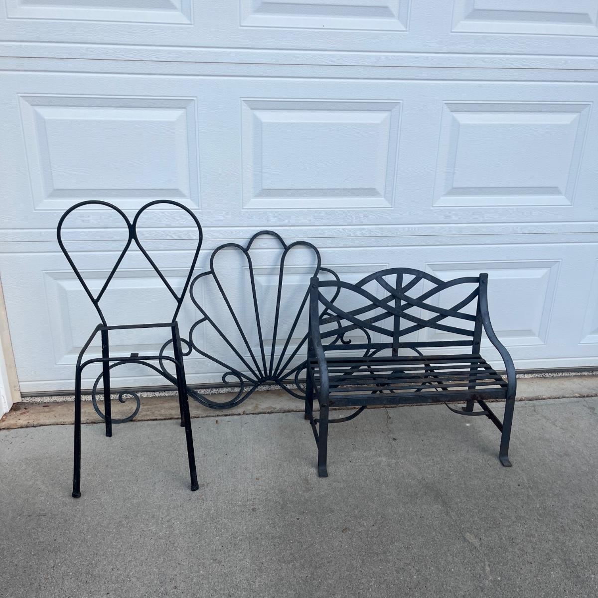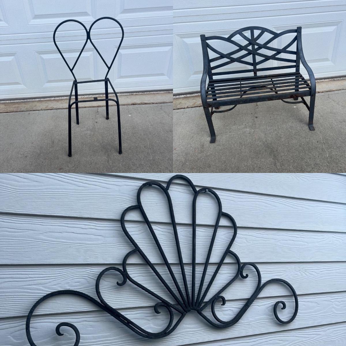 Lot includes a children’s iron bench, chair and a decorative piece of iron wall art. Bench measures 13” x 22” x 20”H with a 9.5” seat height. Chair is missing seat.