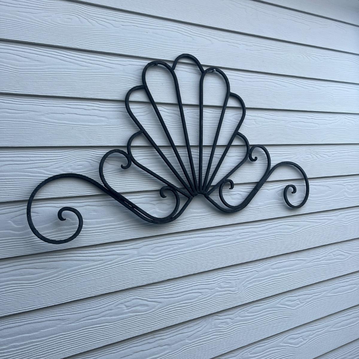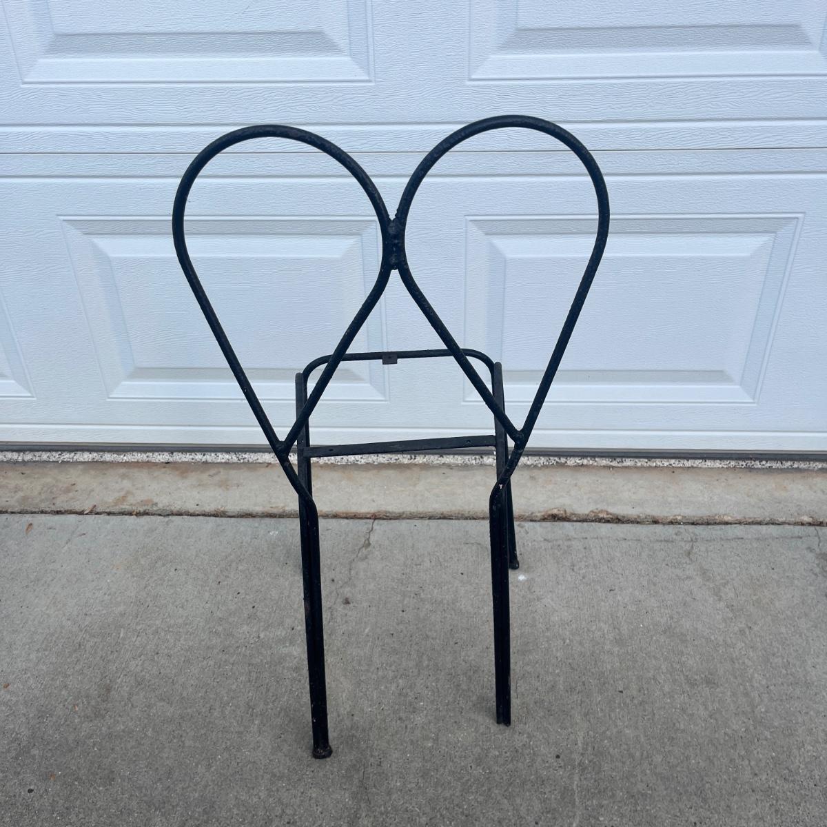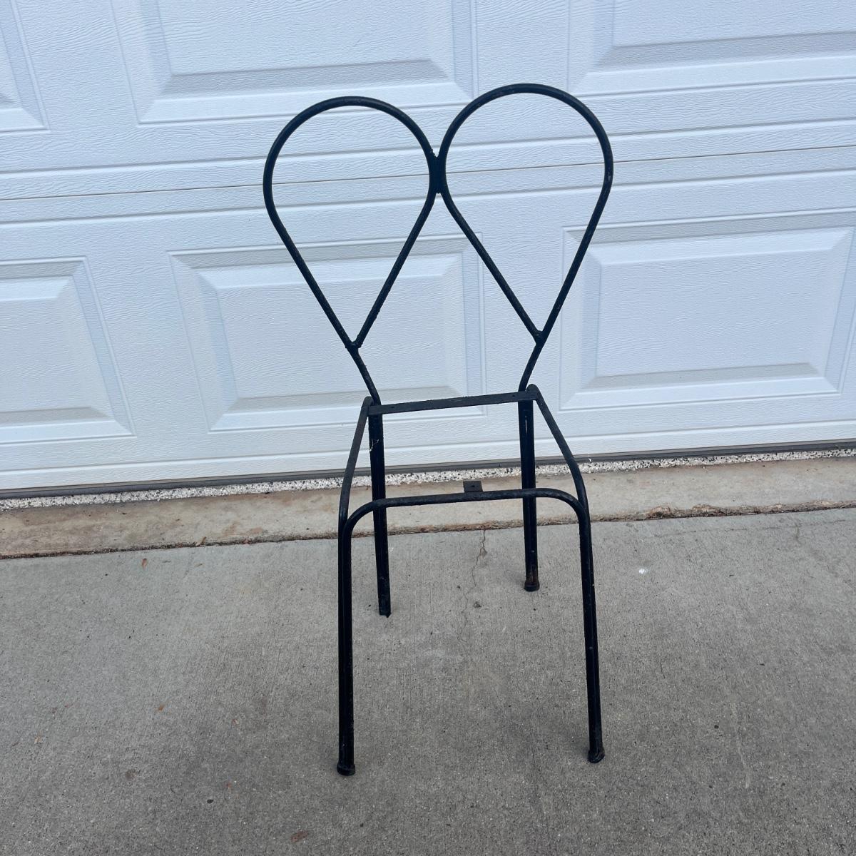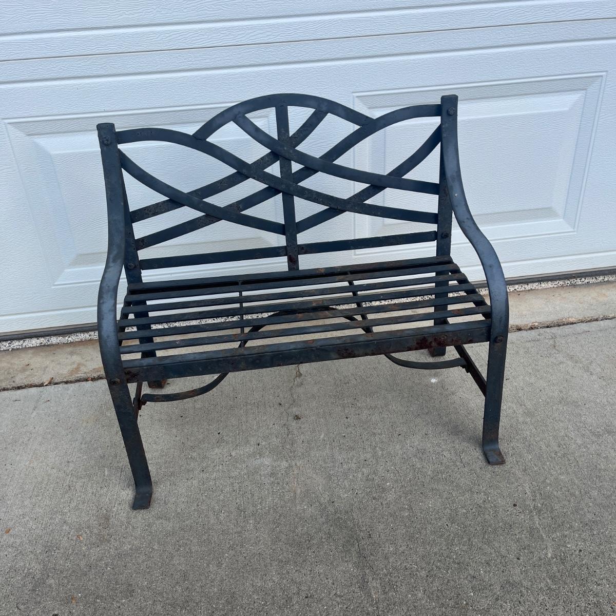 Lot includes a children’s iron bench, chair and a decorative piece of iron wall art. Bench measures 13” x 22” x 20”H with a 9.5” seat height. Chair is missing seat.