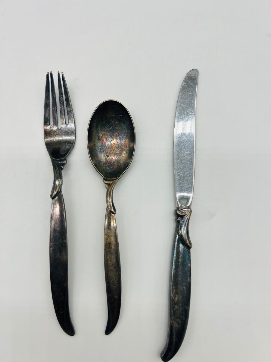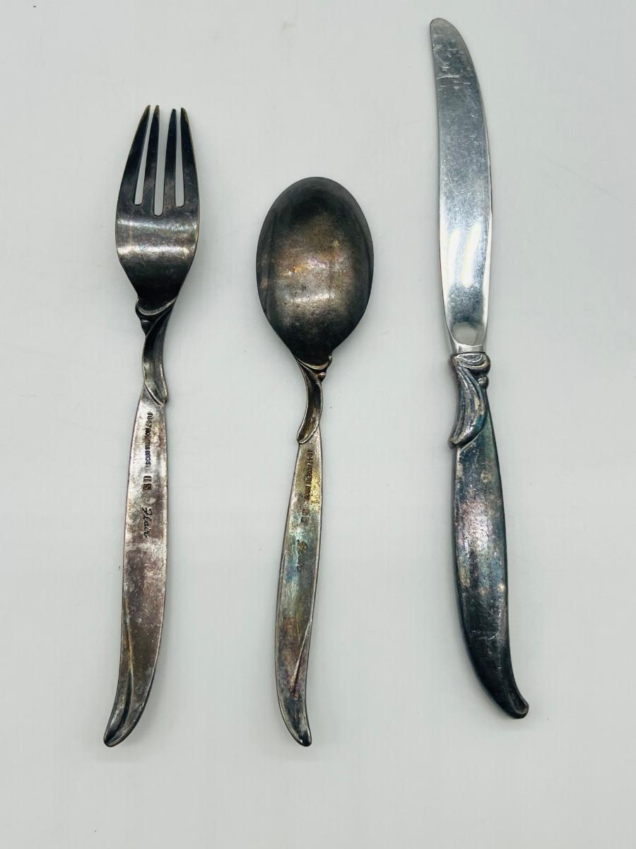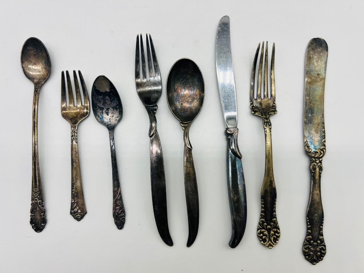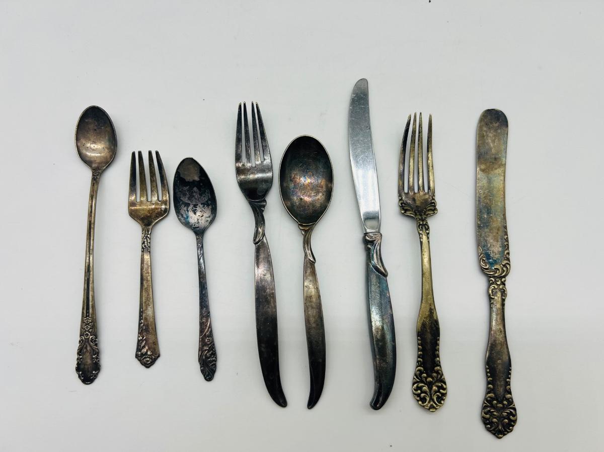 Mixture of sterling and silver plated, children’s vintage utensils, forks, spoons, and knives. Rogers Sterling Bridal veil spoon, heirloom sterling damask rose fork, Community spoon 1847 Rogers flair, Fork spoon and knife and Rogers fork and knife.