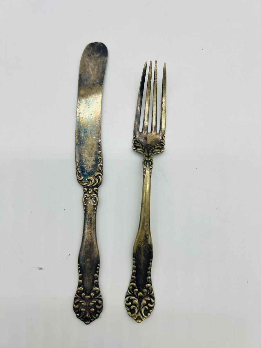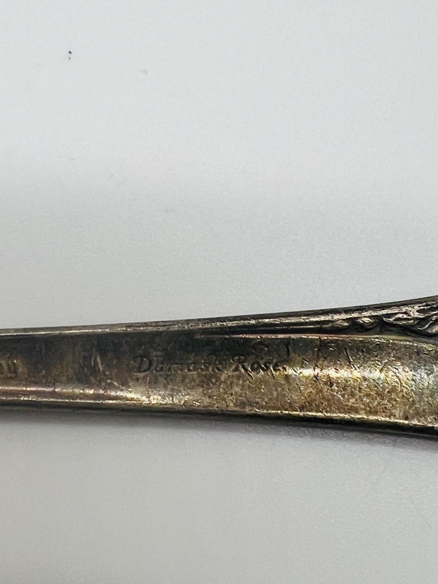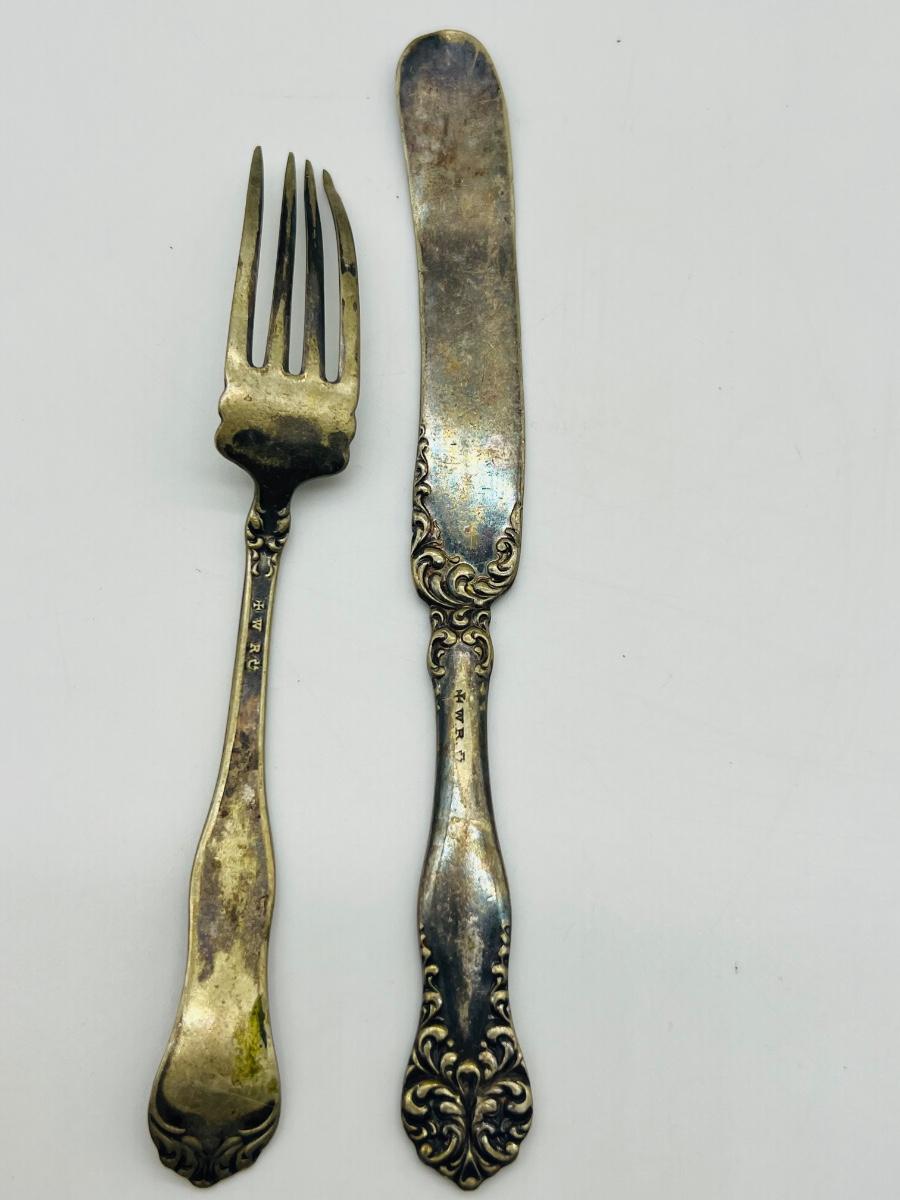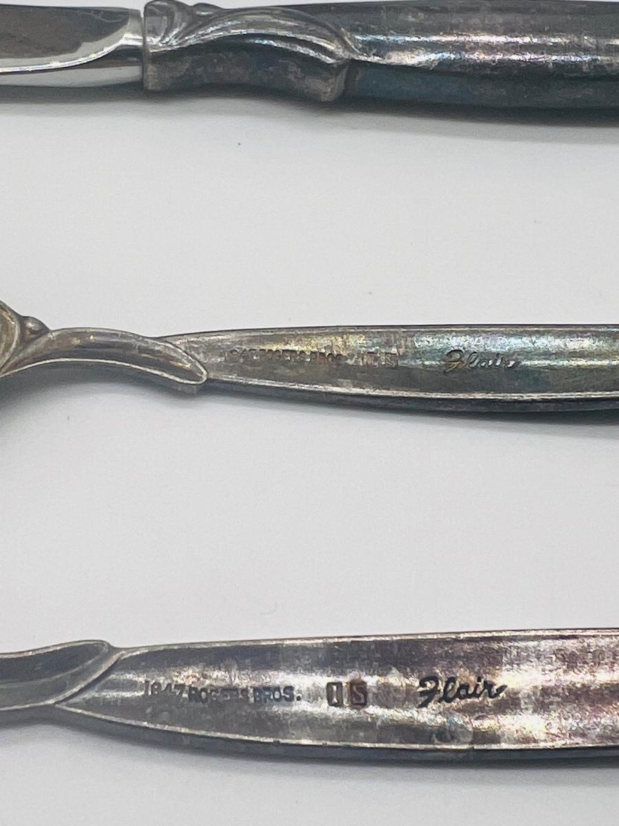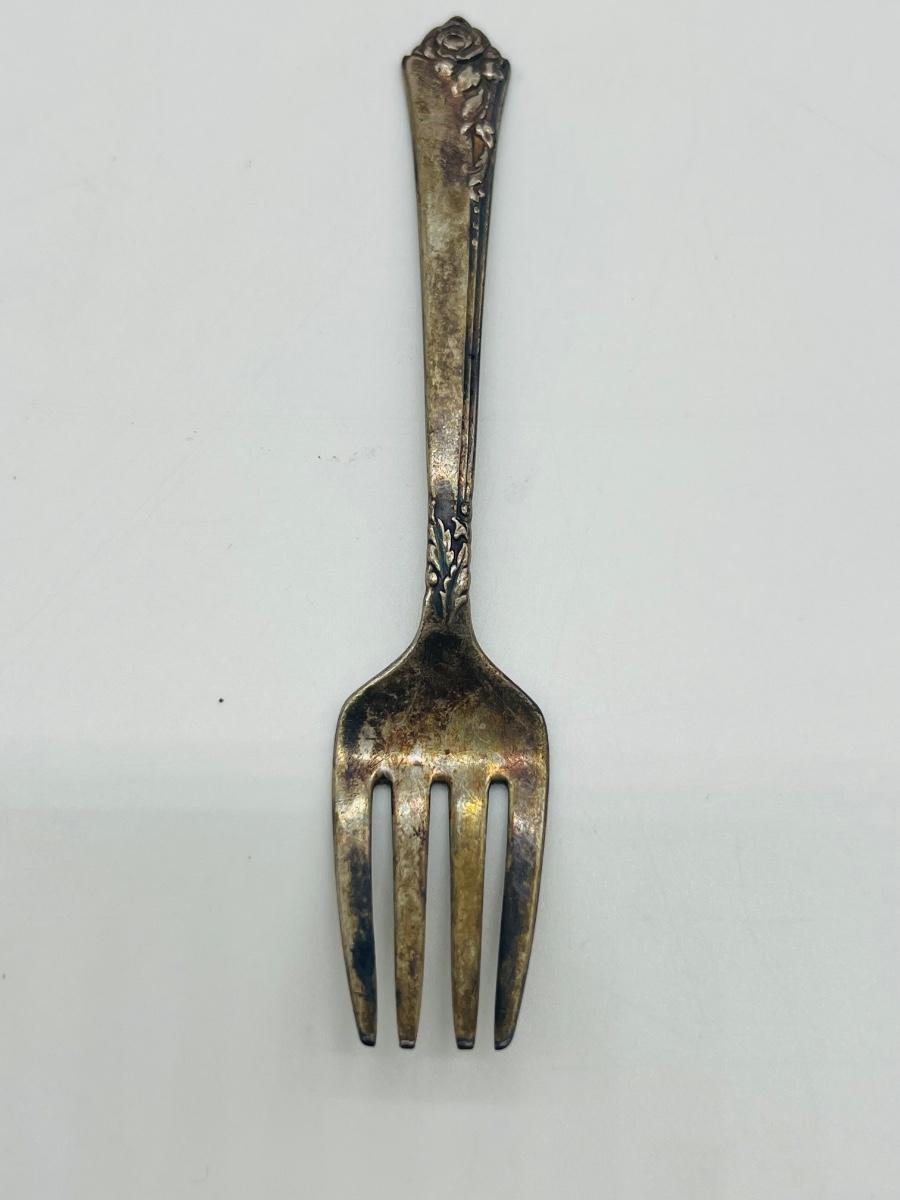 Mixture of sterling and silver plated, children’s vintage utensils, forks, spoons, and knives. Rogers Sterling Bridal veil spoon, heirloom sterling damask rose fork, Community spoon 1847 Rogers flair, Fork spoon and knife and Rogers fork and knife.