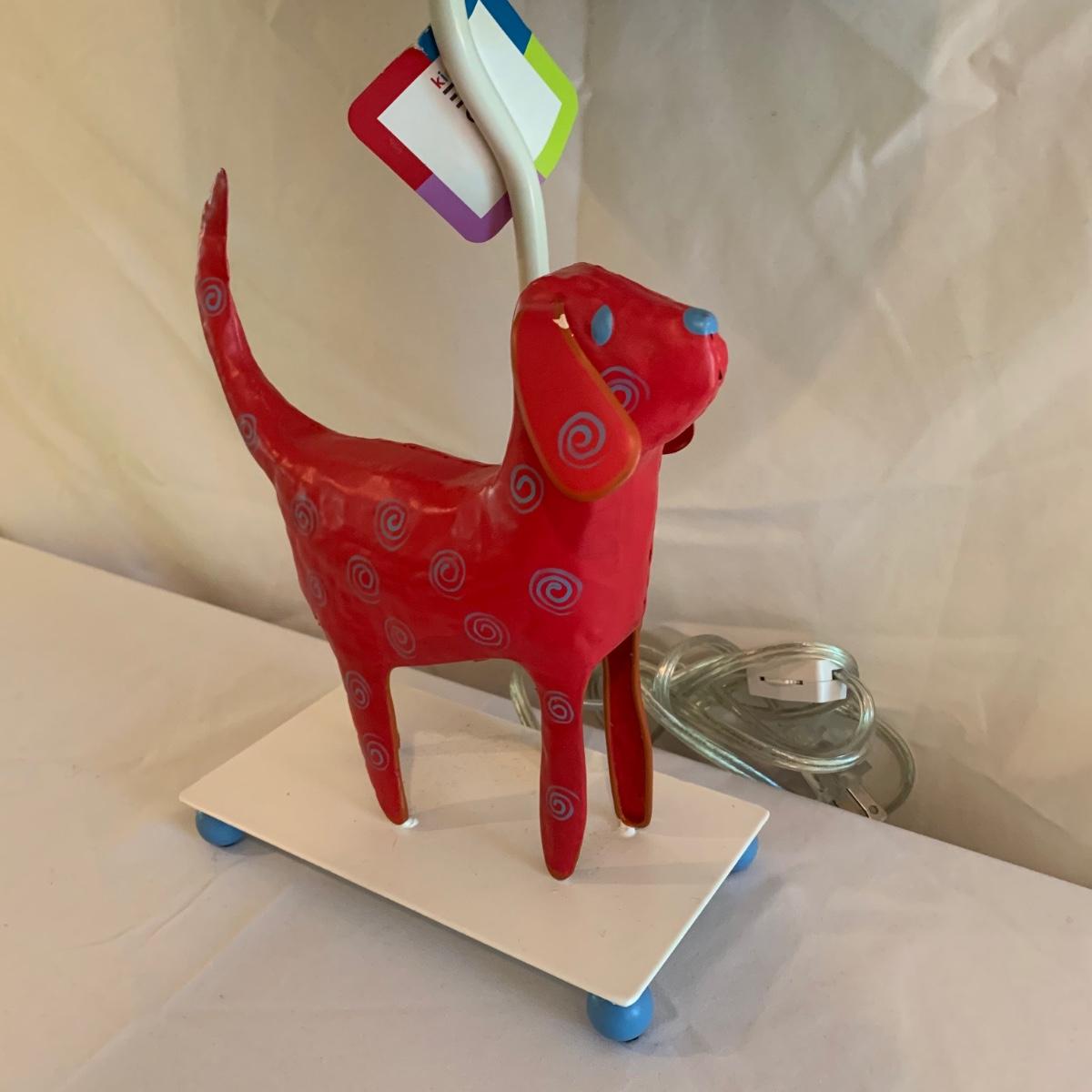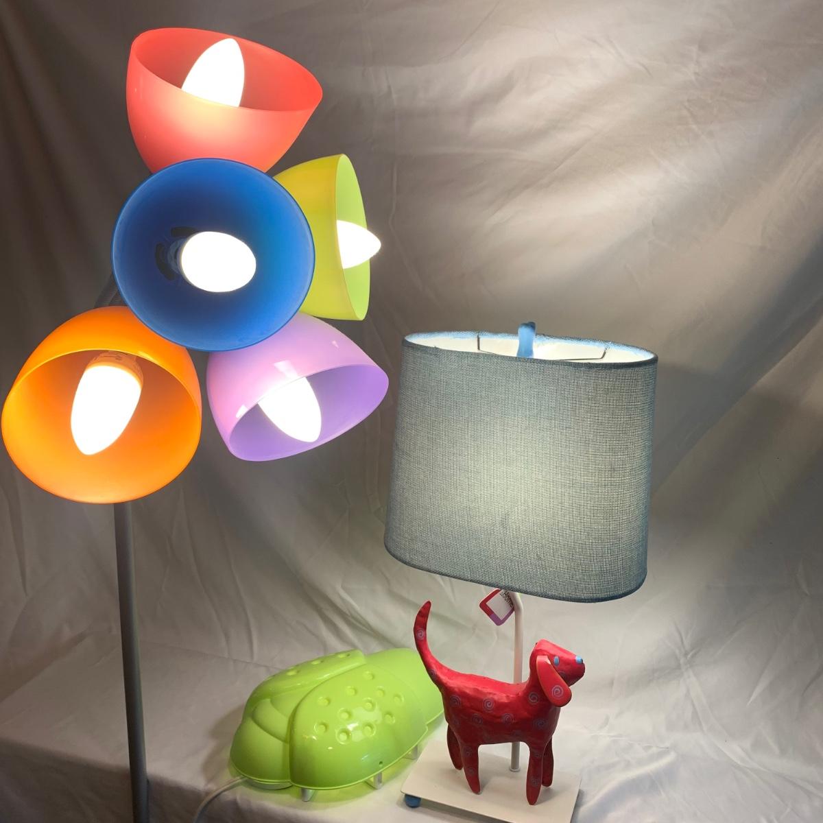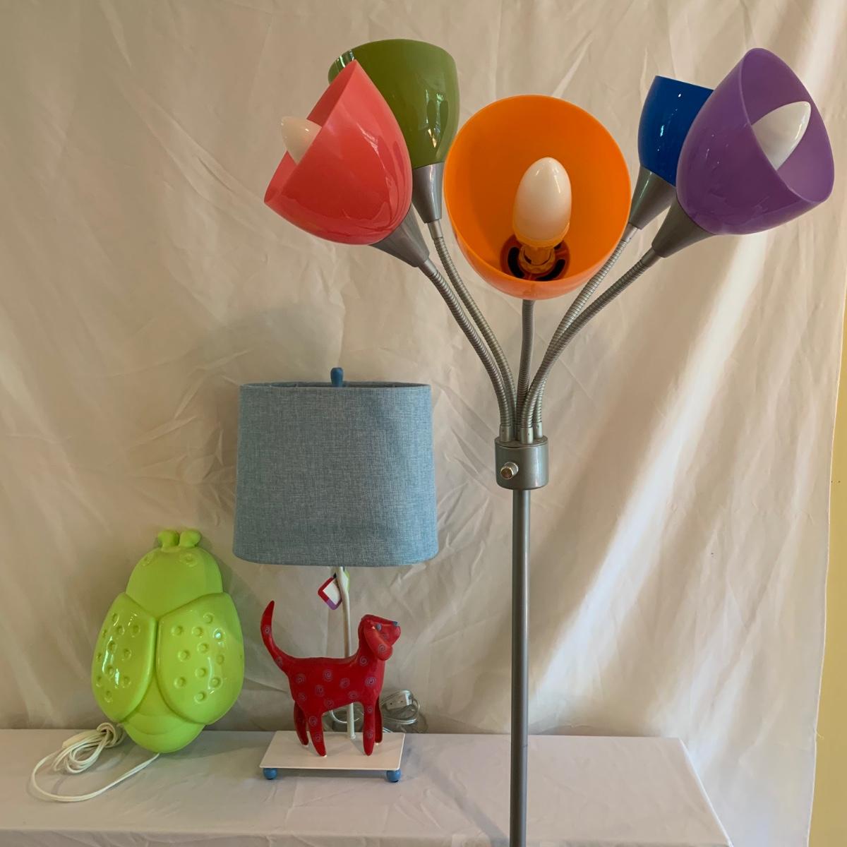 Lot includes multicolored floor lamp, green bug wall lamp, and tin red dog table lamp. All lamps power on and add a bit of color to any room. Floor lamp measures, 9”D at the base and is 67”H. Please see photos for more details. Local pickup only.