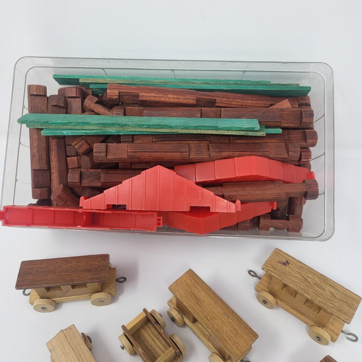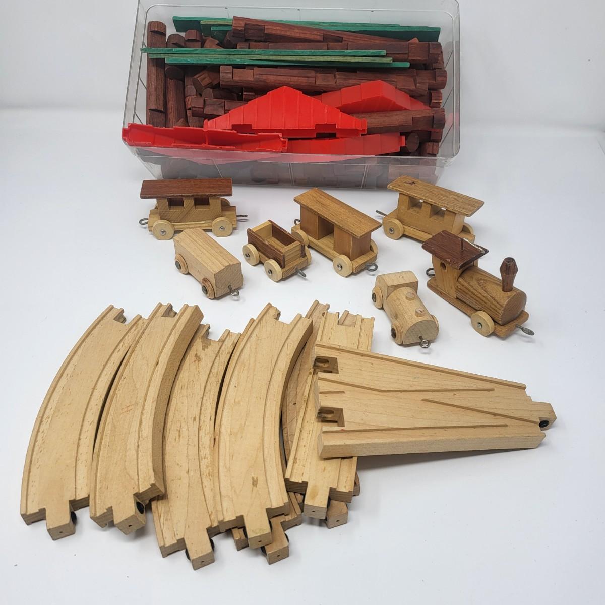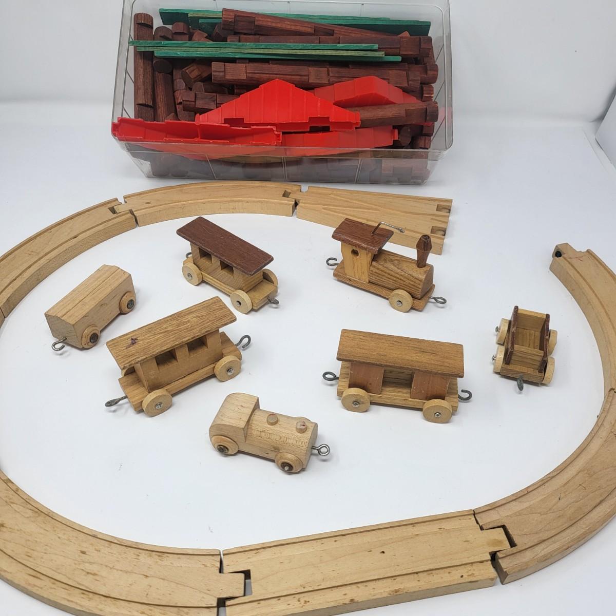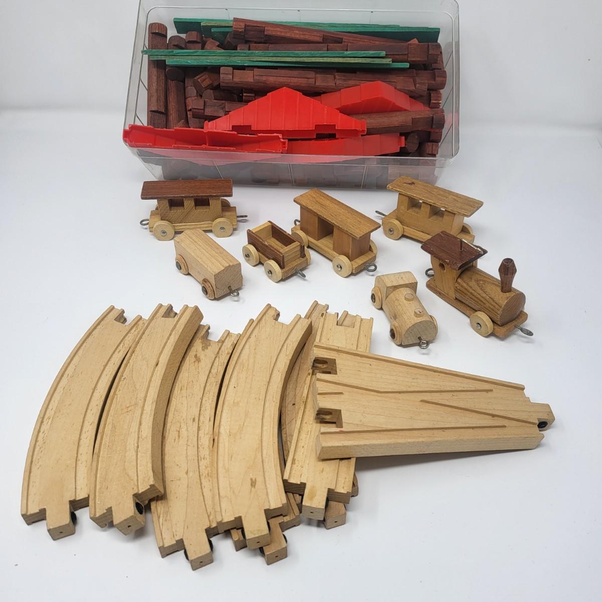 Children's wood toys lot. Lincoln Logs and wood trains with tracks.