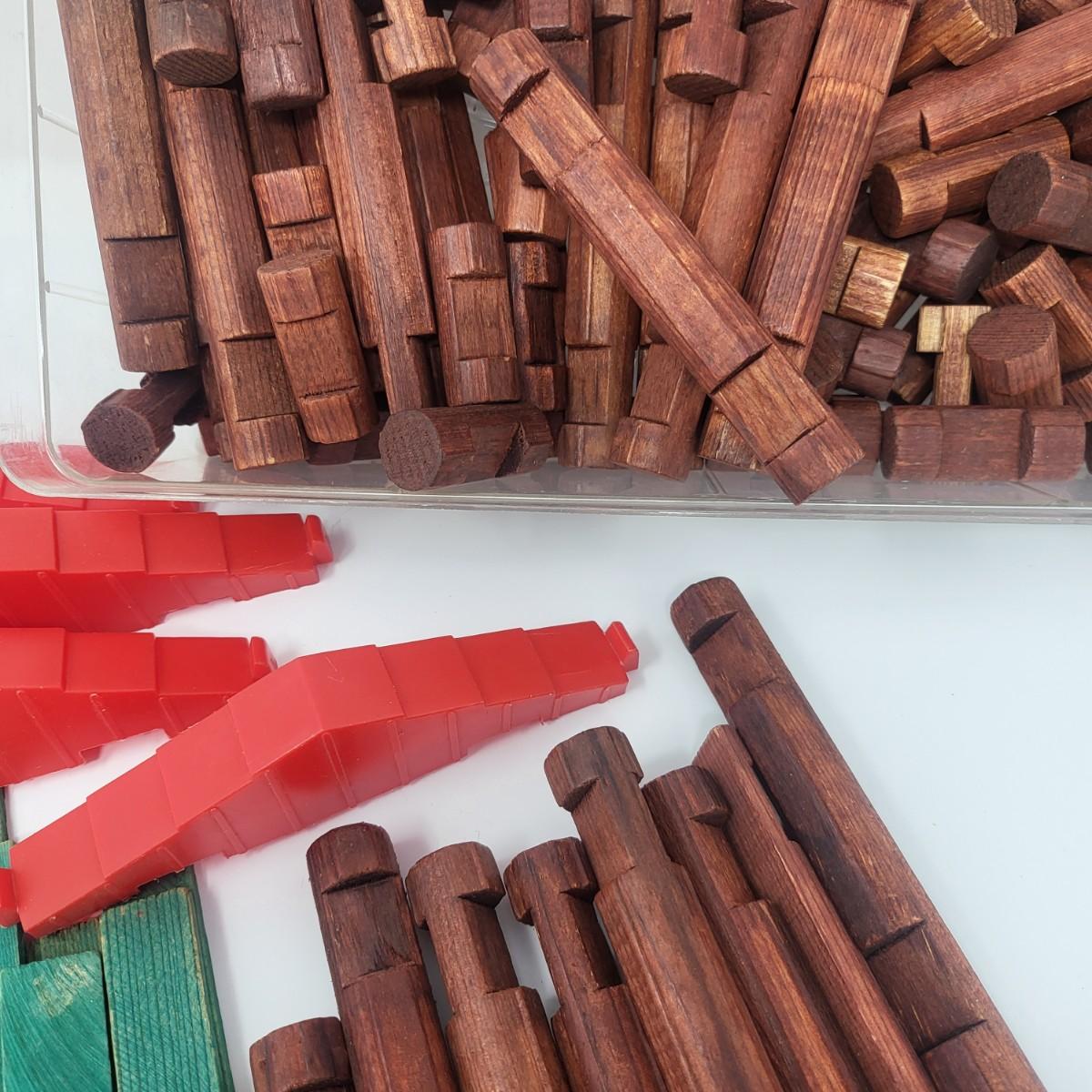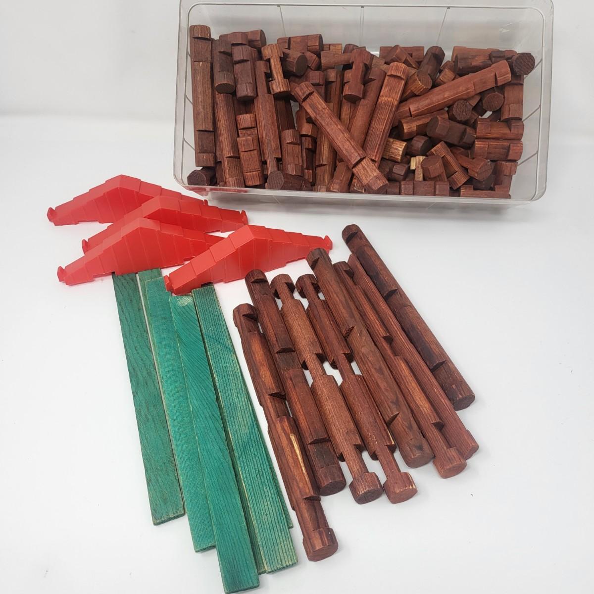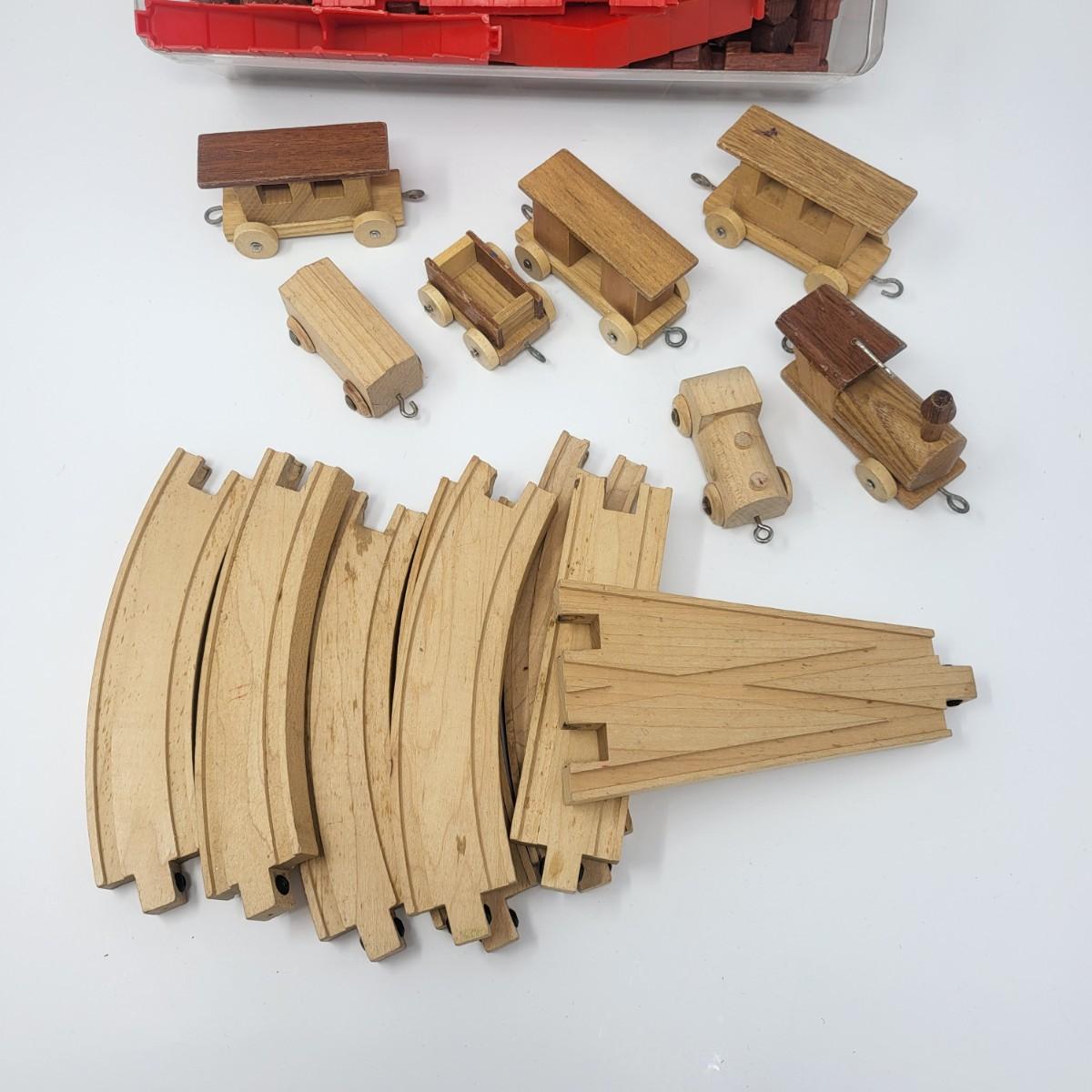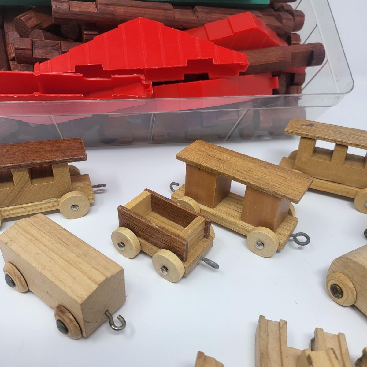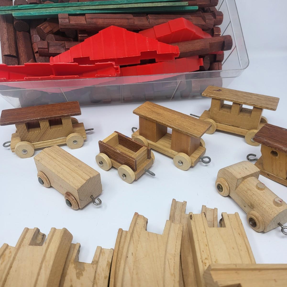 Children's wood toys lot. Lincoln Logs and wood trains with tracks.