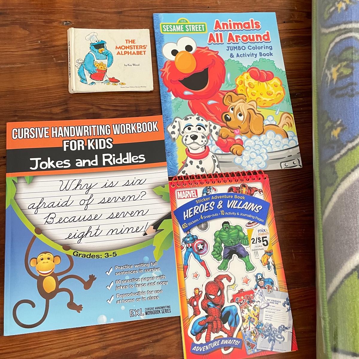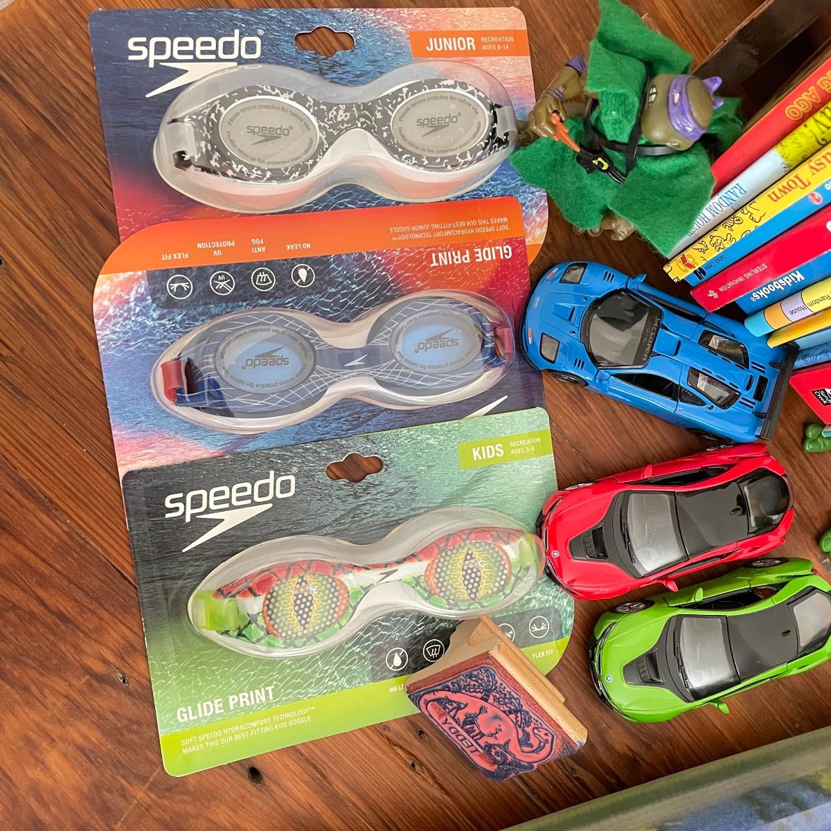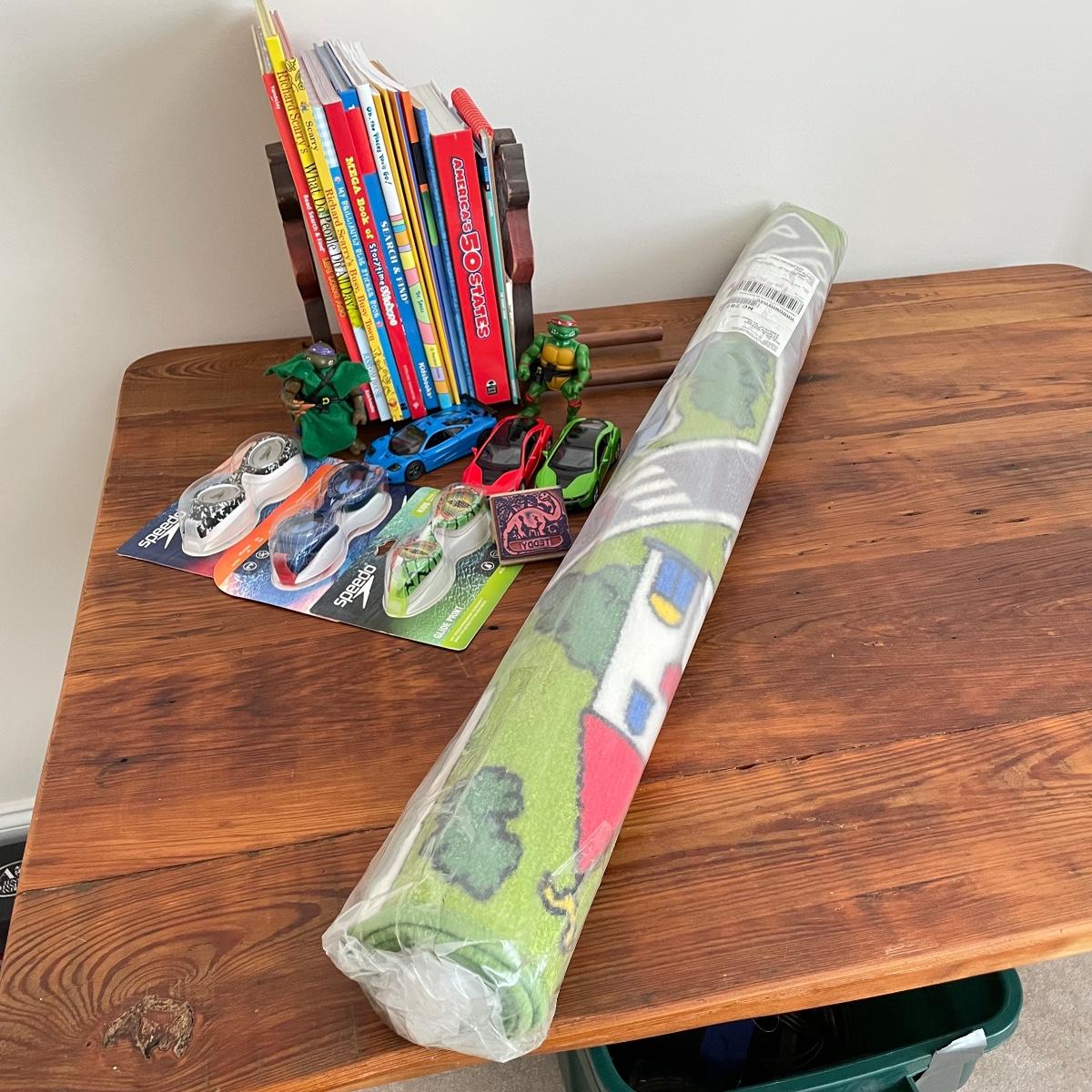 Three unused Speedo goggles, three die cast 1/36 cars, two Teenage Mutant Ninja Turtles, wooden bear rack. Nine reader/look and find books, plus eight sticker/activities books for children. One “Streets Rug” by Kaplan Early Learing Company is still in packaging and is 40” tall. Local pick up only.