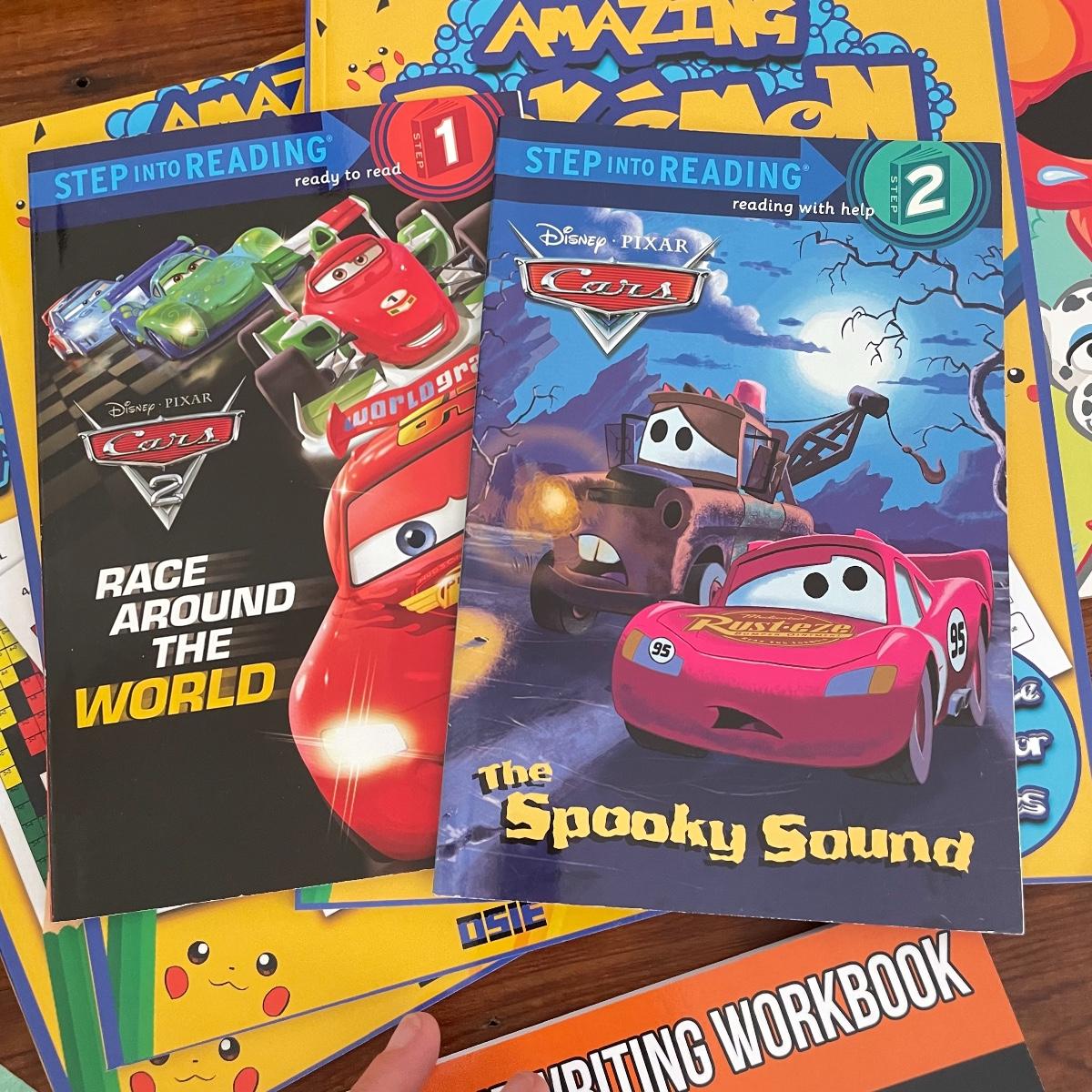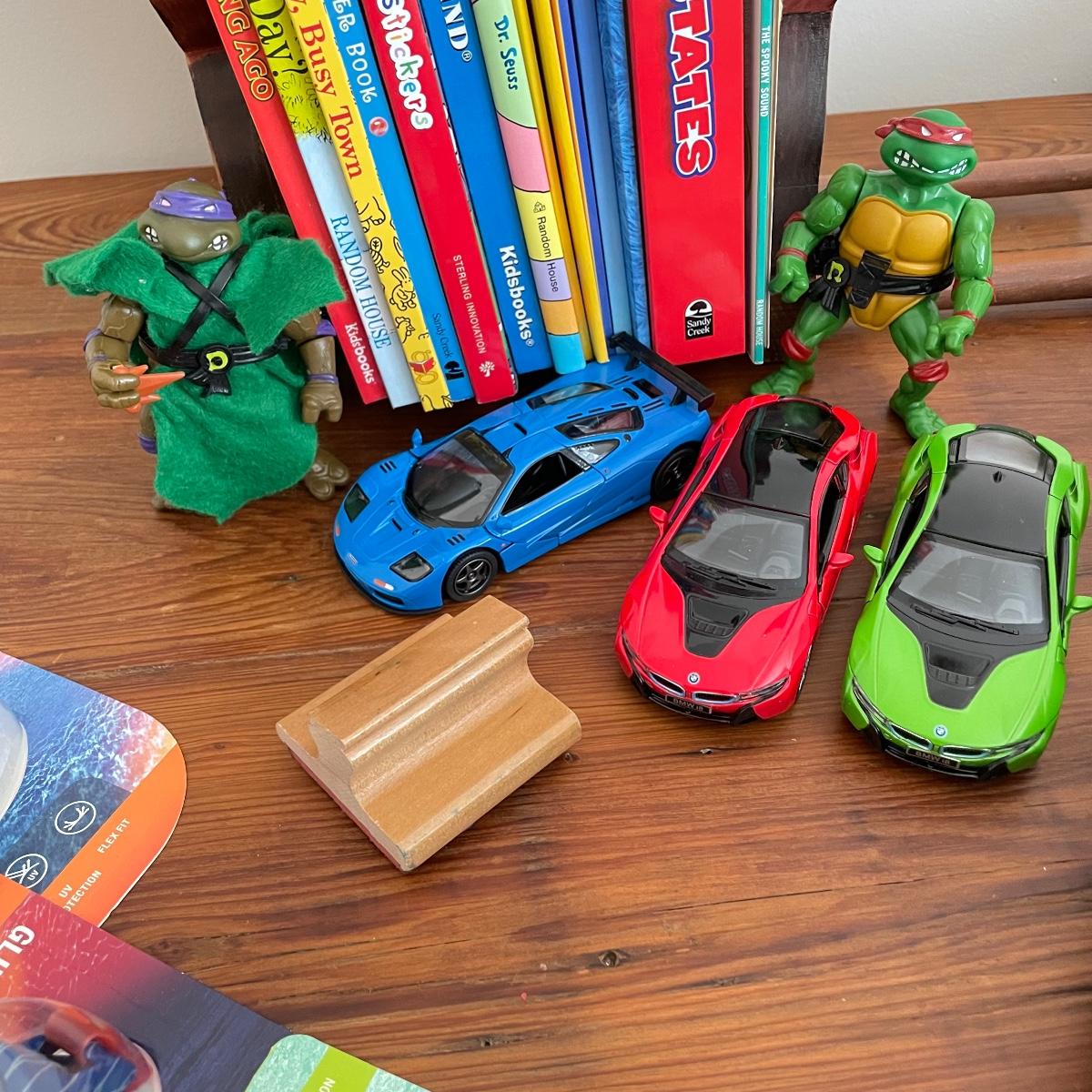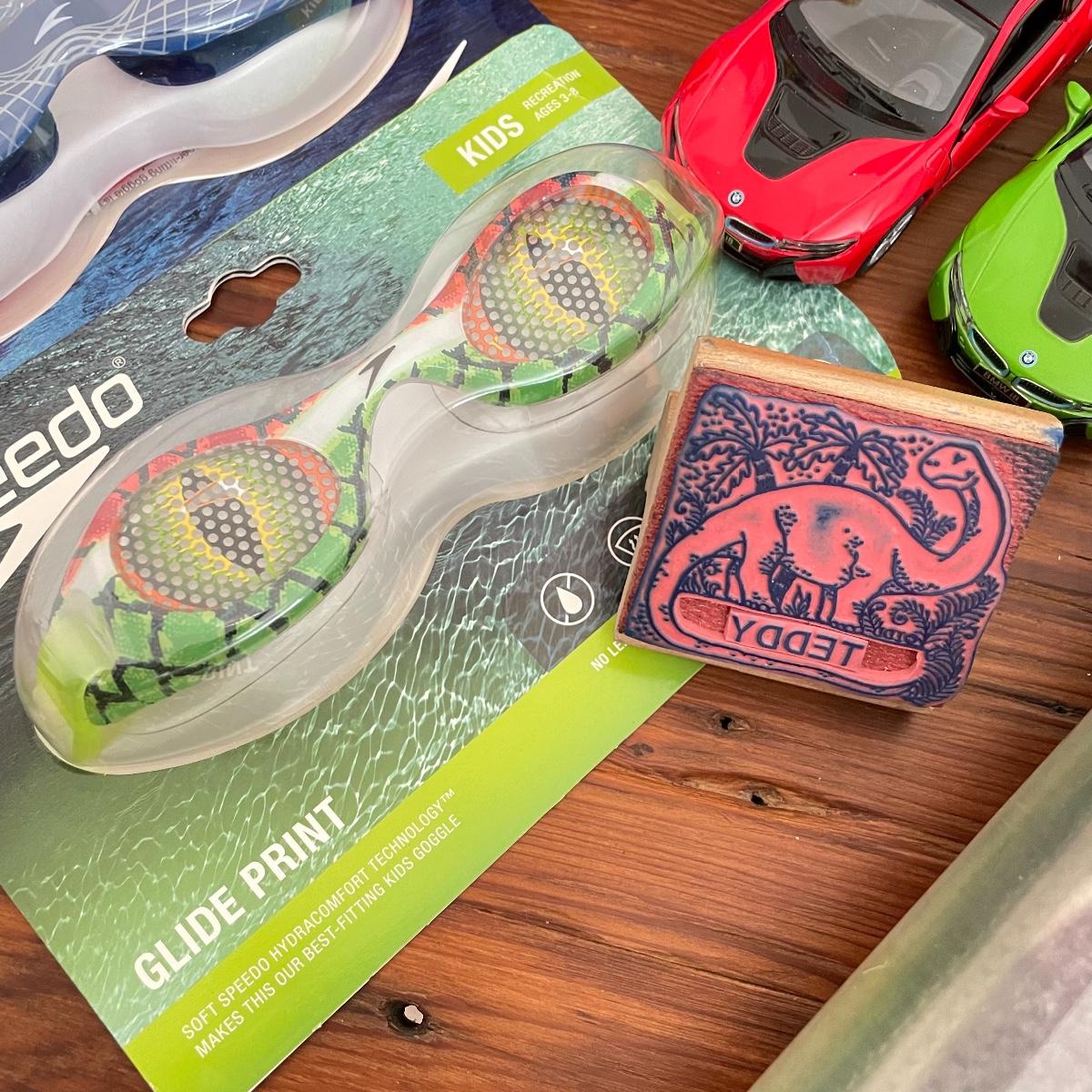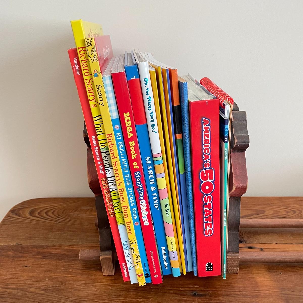 Three unused Speedo goggles, three die cast 1/36 cars, two Teenage Mutant Ninja Turtles, wooden bear rack. Nine reader/look and find books, plus eight sticker/activities books for children. One “Streets Rug” by Kaplan Early Learing Company is still in packaging and is 40” tall. Local pick up only.