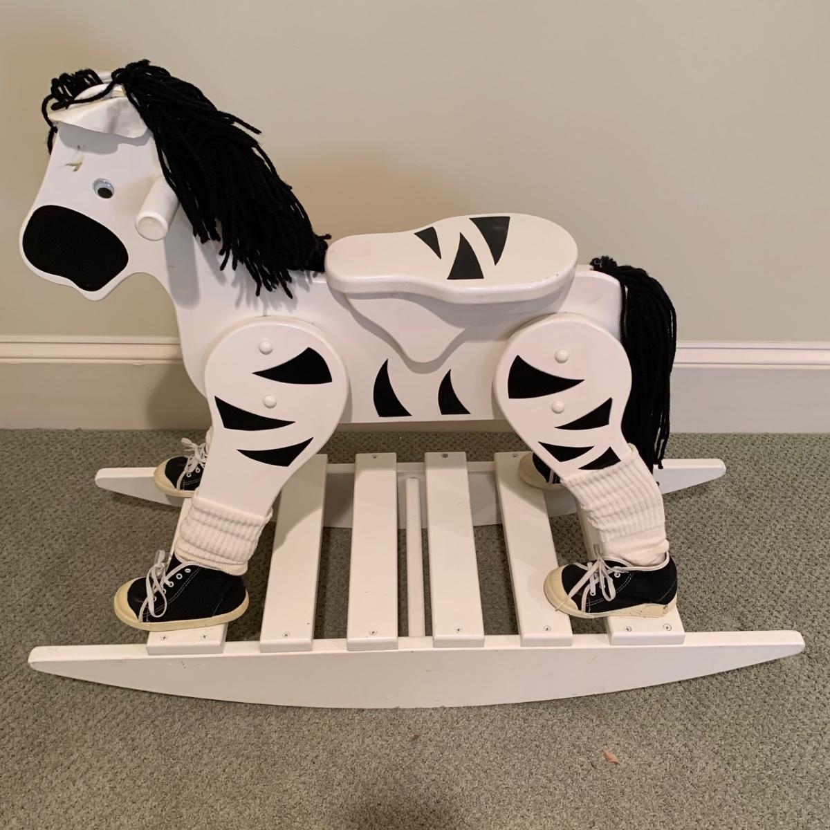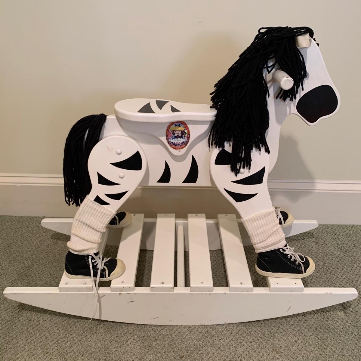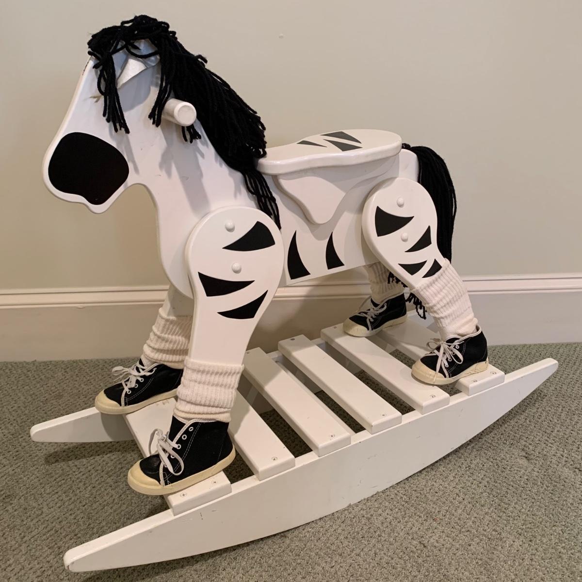 Adorable Zebra style rocker. Rocker is made of wood and measures, 34” x 12” x 27”H. There is some paint chipping around the handles. Item has some surface smudges. Will need to be cleaned up but some smudges appear into the paint. Please see photos for more details. Local pick-up only.