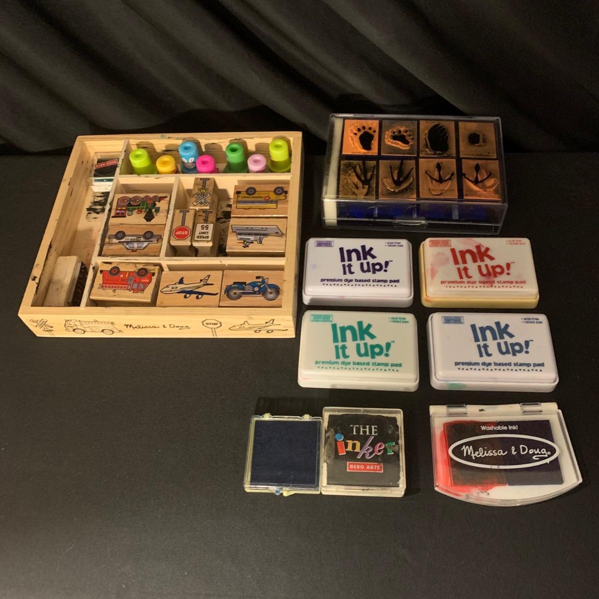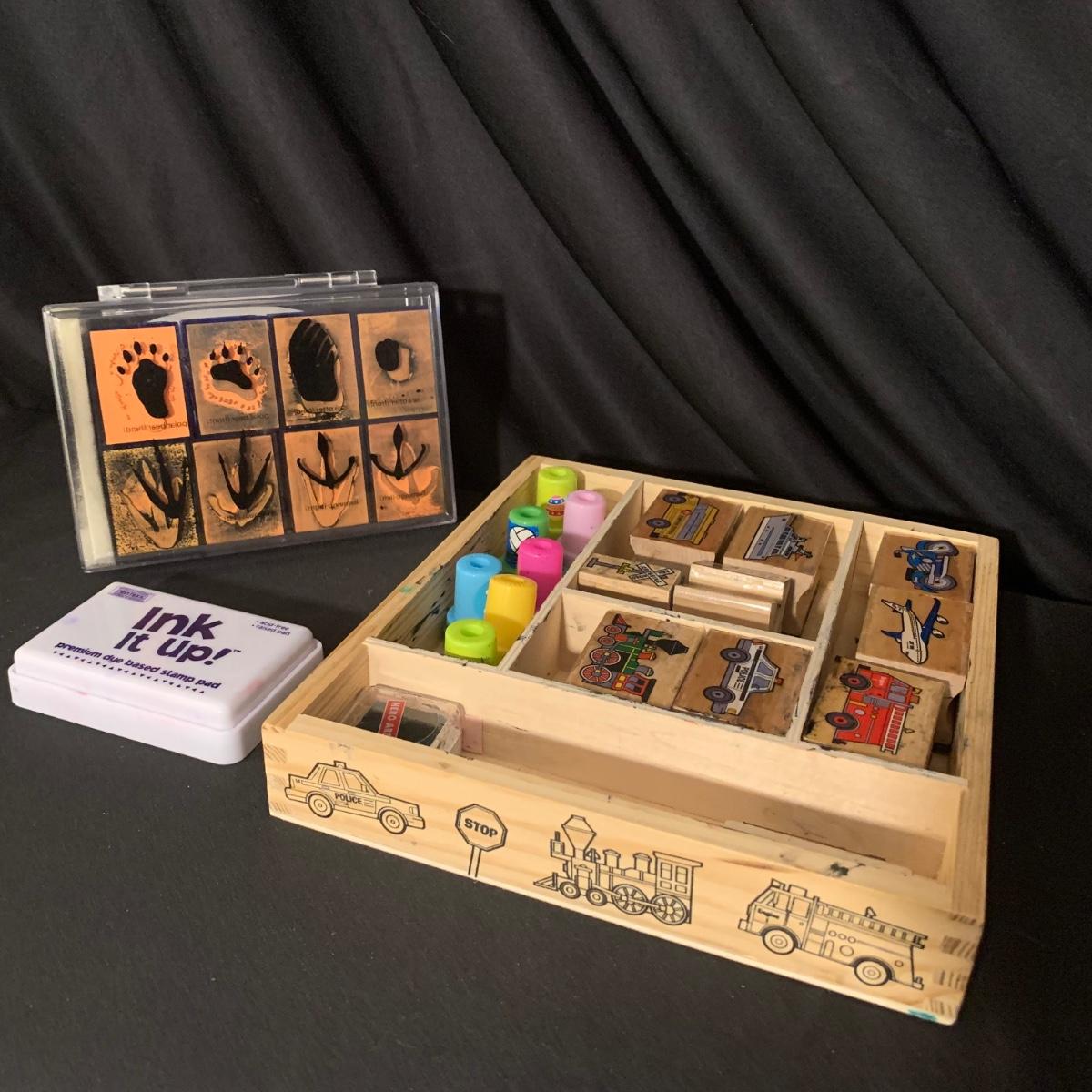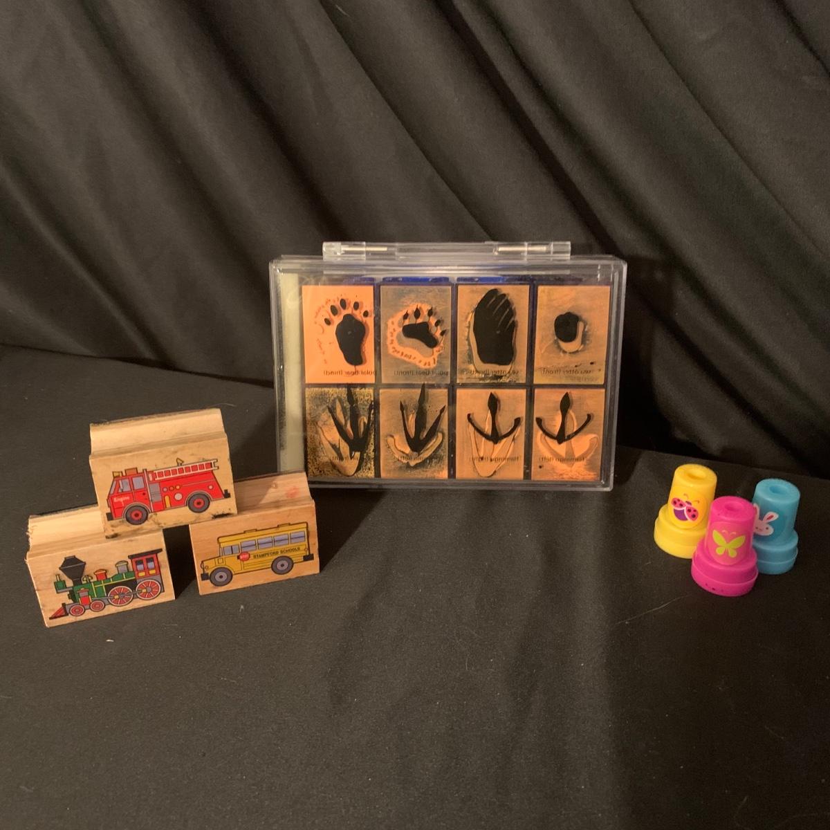 Children’s collection of stamps and stamp pads. Stamps are well loved but still have a lot of life left. Stamp pads are slowly drying out but with a little water they are likely to last a bit longer. Stamp collection comes in lidded plastic container.