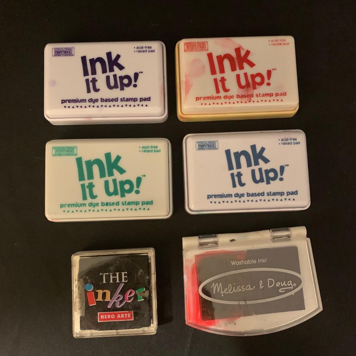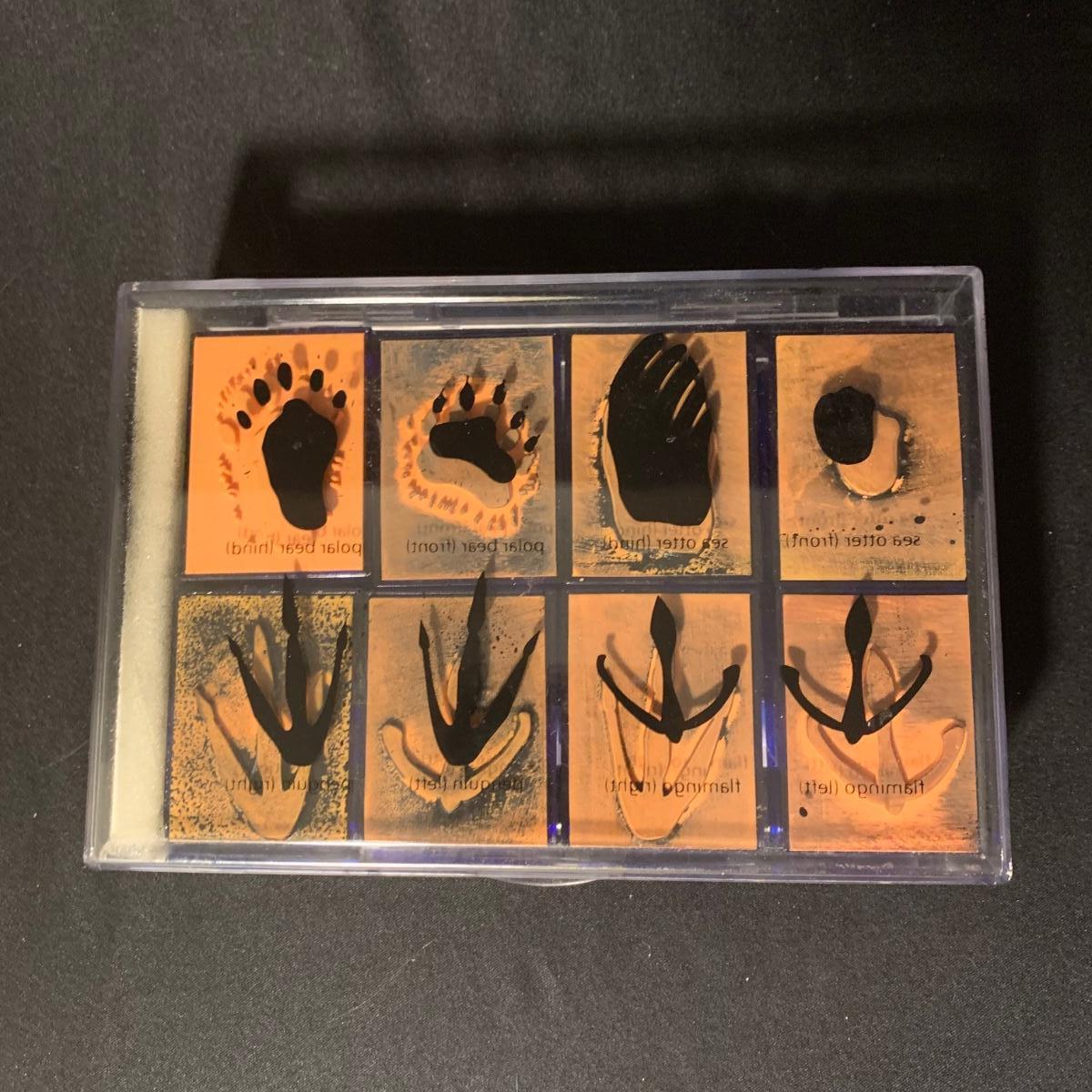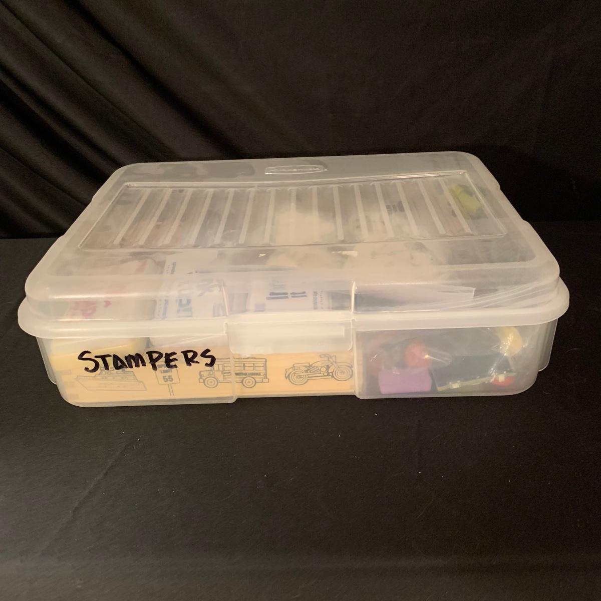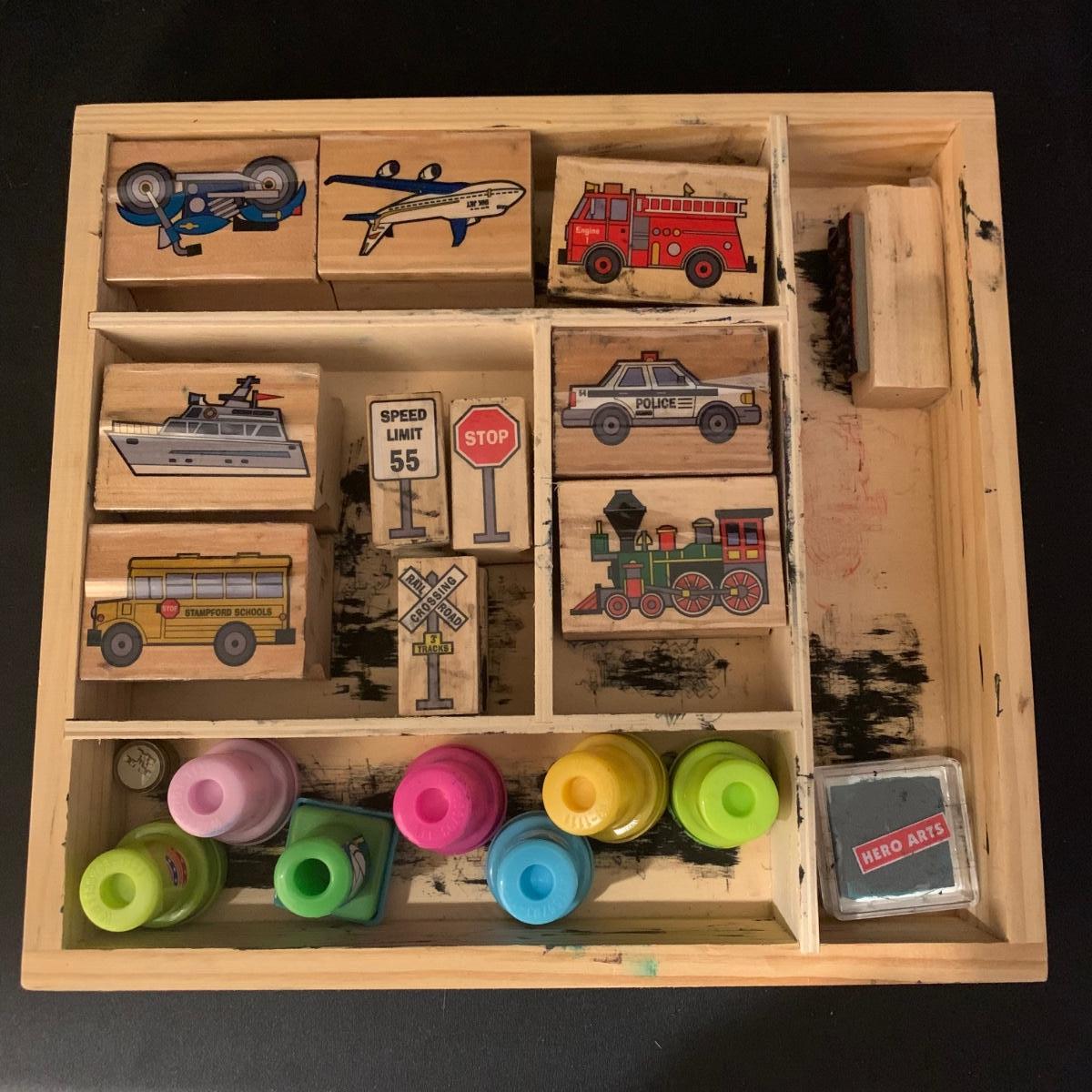 Children’s collection of stamps and stamp pads. Stamps are well loved but still have a lot of life left. Stamp pads are slowly drying out but with a little water they are likely to last a bit longer. Stamp collection comes in lidded plastic container.