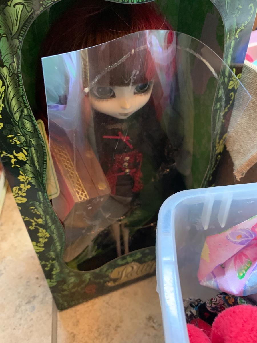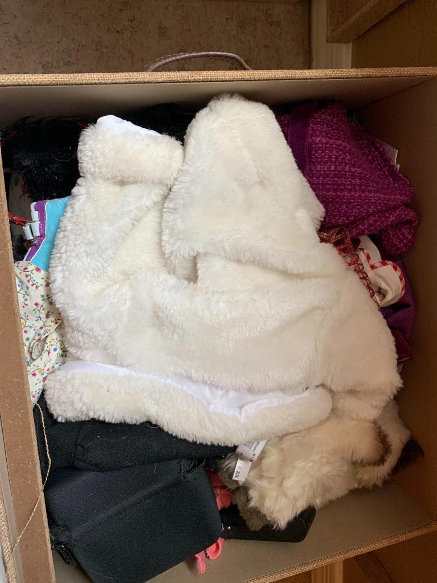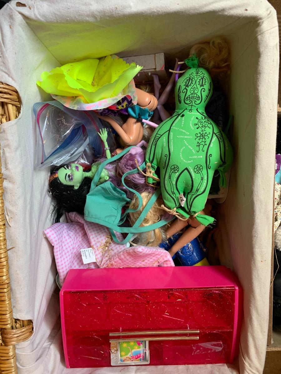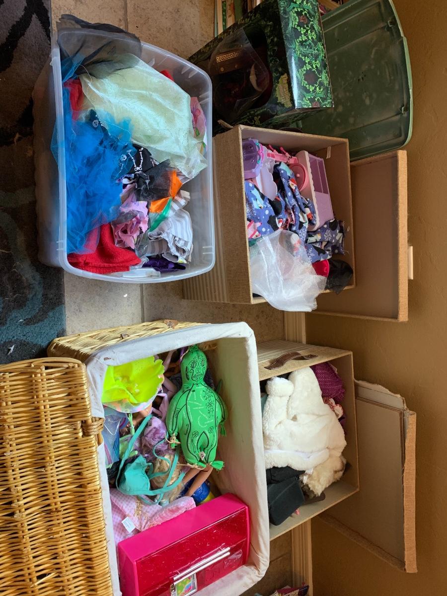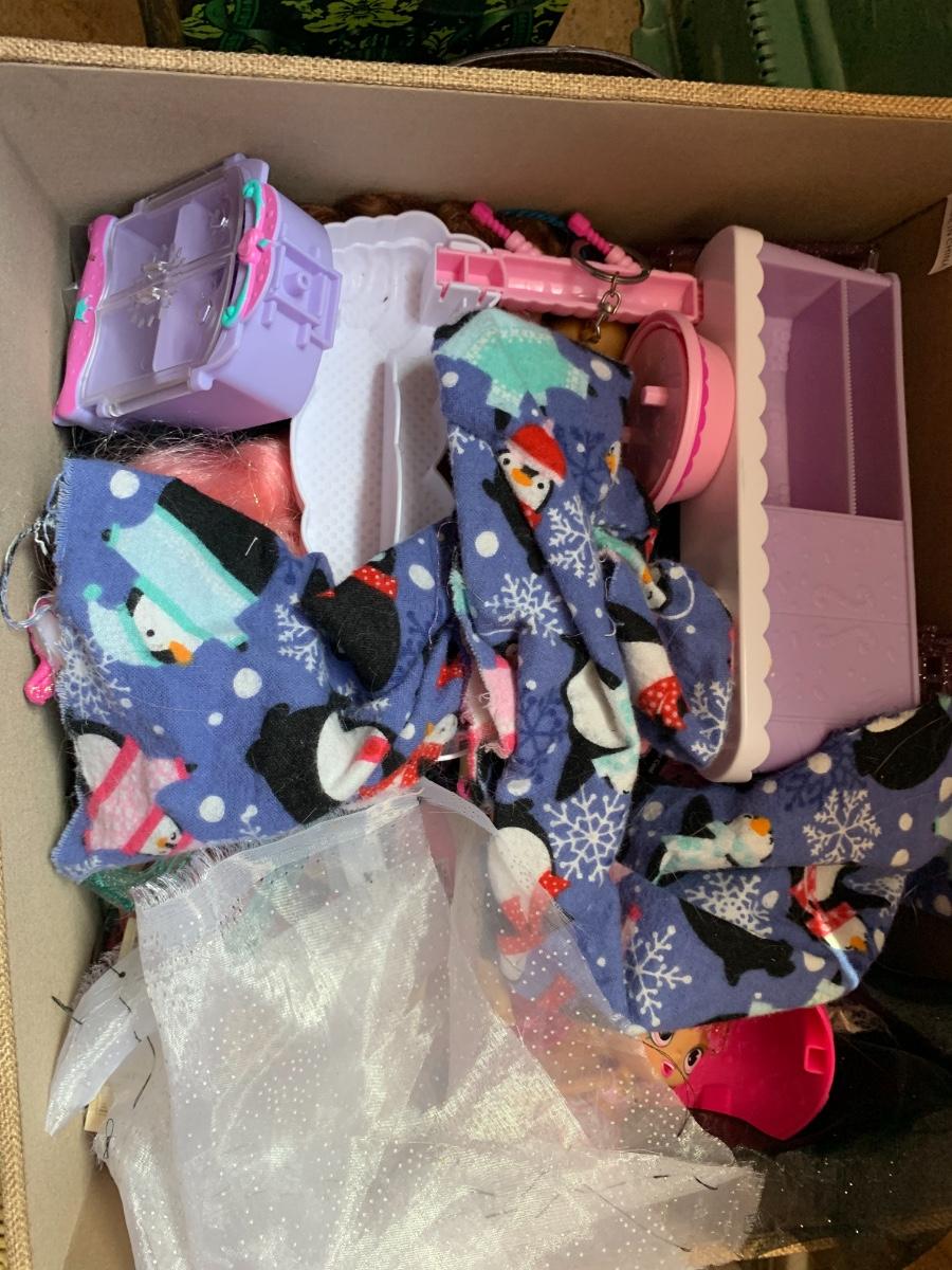 An assortment of toys including dolls and doll accessories. Fills 4 full storage bins. In good condition