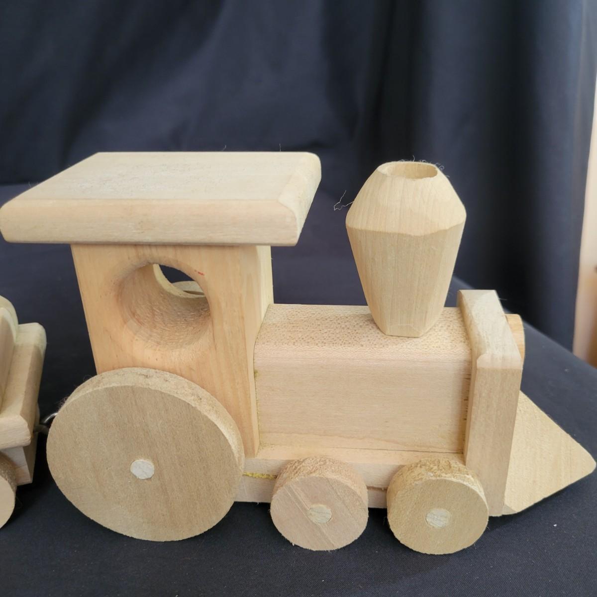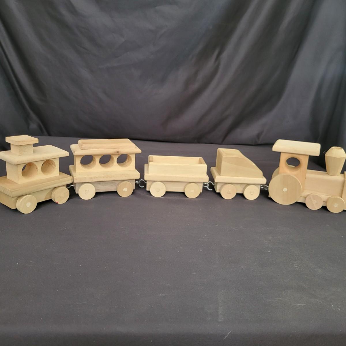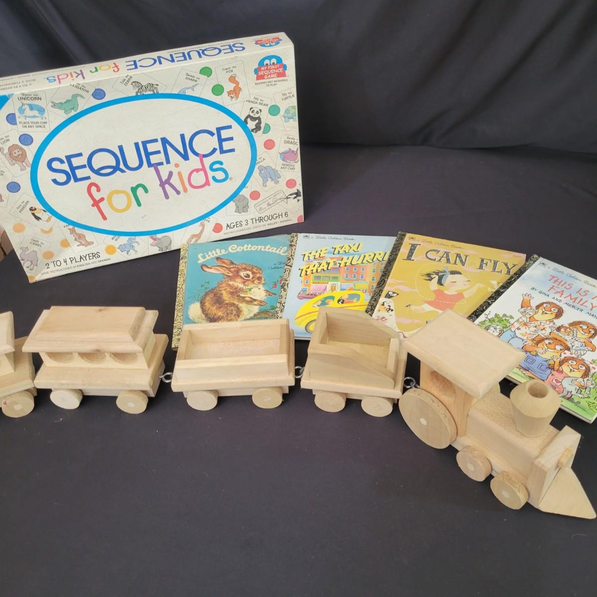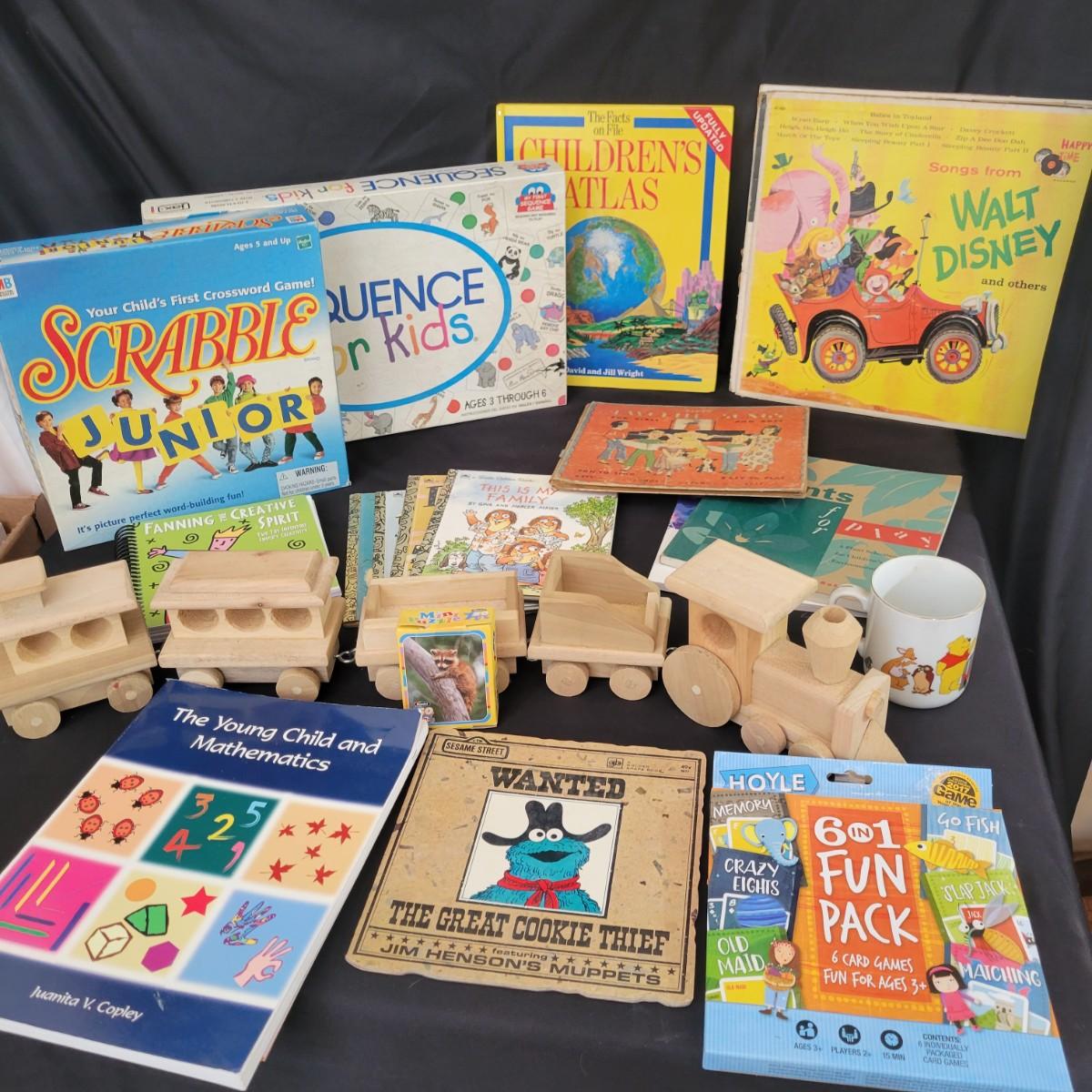 An assortment of children's toys, books, games and more in good condition. Included is a five piece raw wood train, multiple books and games, a 50 piece puzzle, three albums, and a Walt Disney Productions Winnie the Pooh mug. The trains engine measures approximately 7.5" x 3" x 4.5". Shipping available. Shipping can be costly. We suggest calling our local UPS with dimensions and getting an estimate
