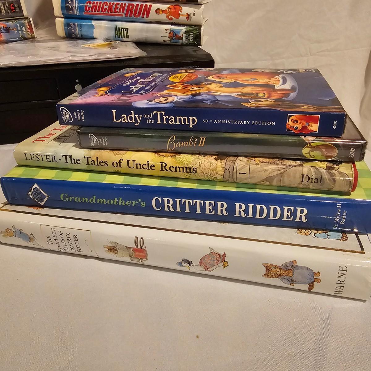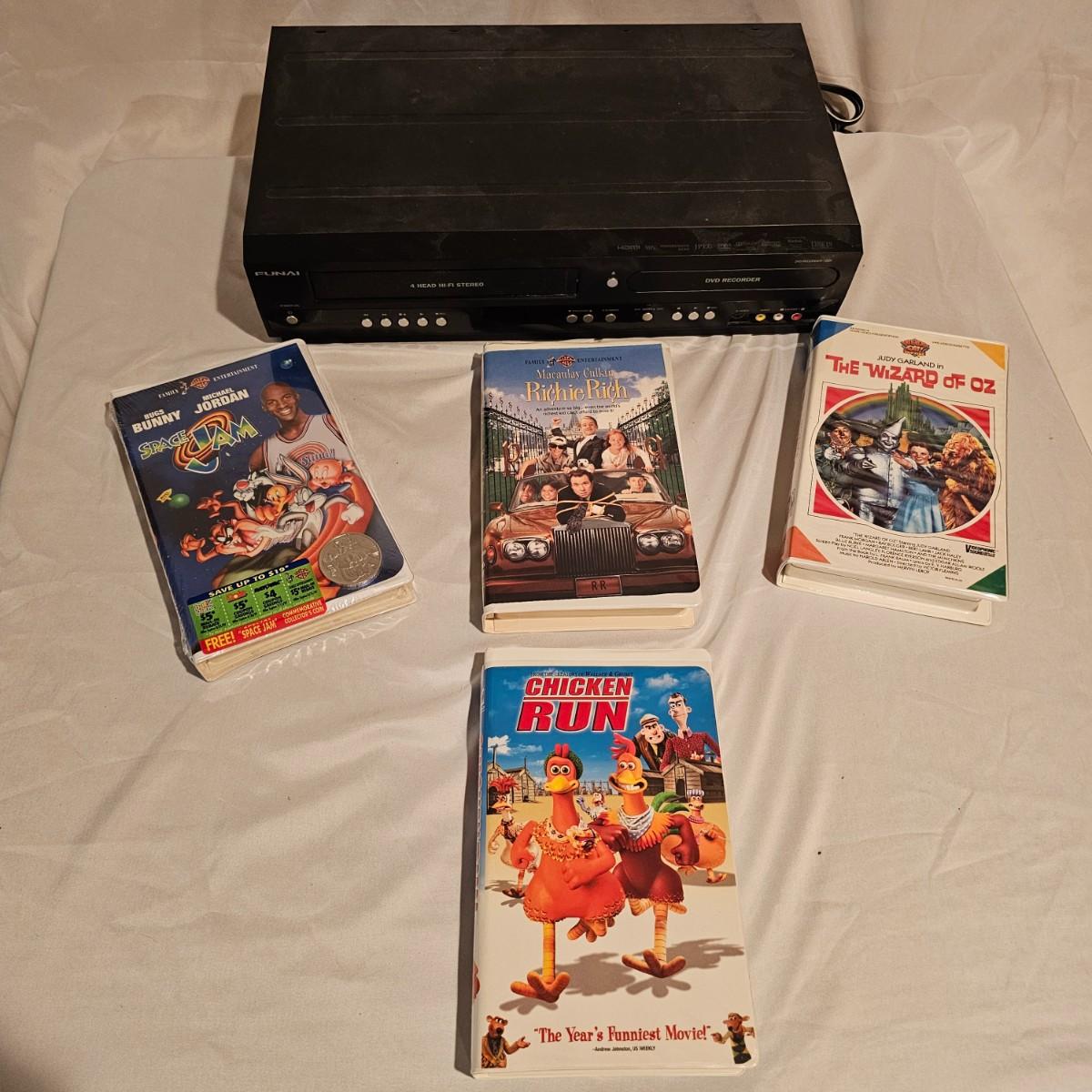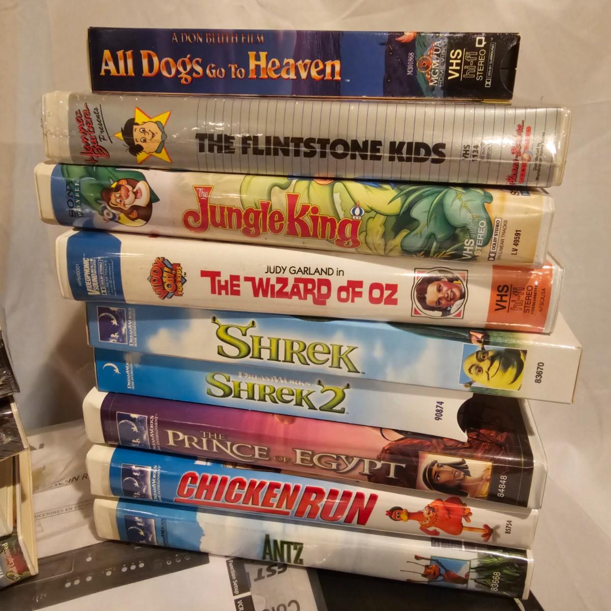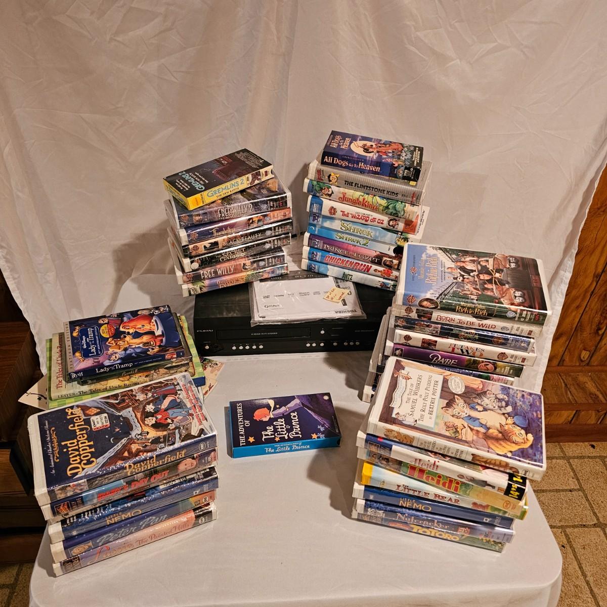 Lots of fun kids' classic movies on VHS tape, some books and a VHS/DVD recorder. Shrek, Richie Rich, Thumbelina and more. Over 35 titles here. Also includes a Funai DVD/VHS brand player/recorder. Unit powered on when plugged in. See photos for details. Local pickup only.