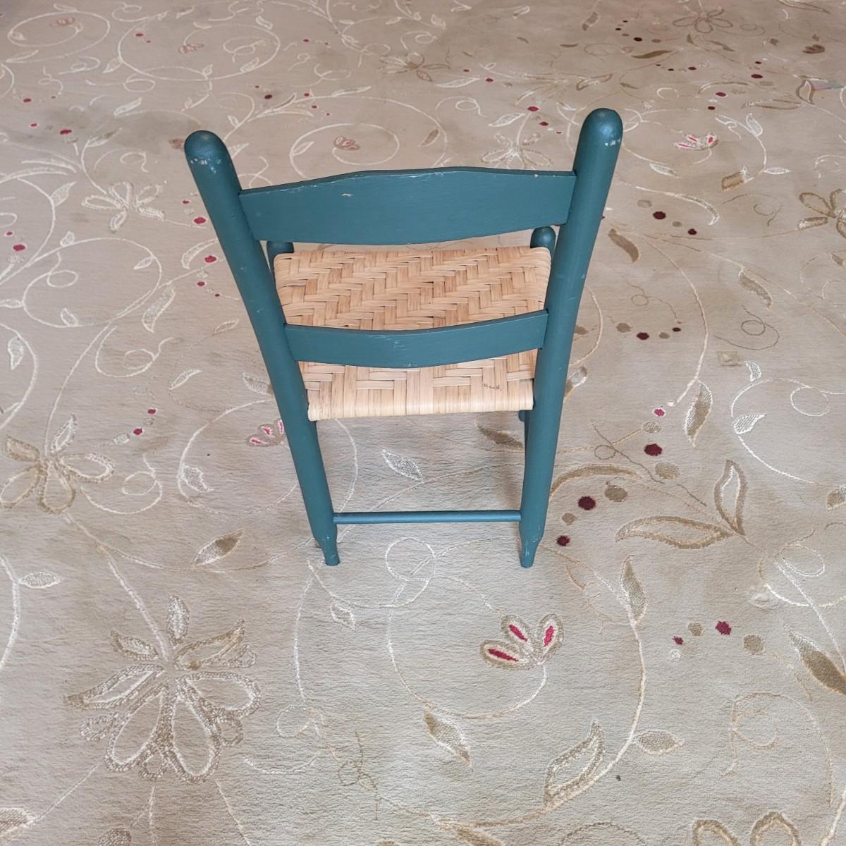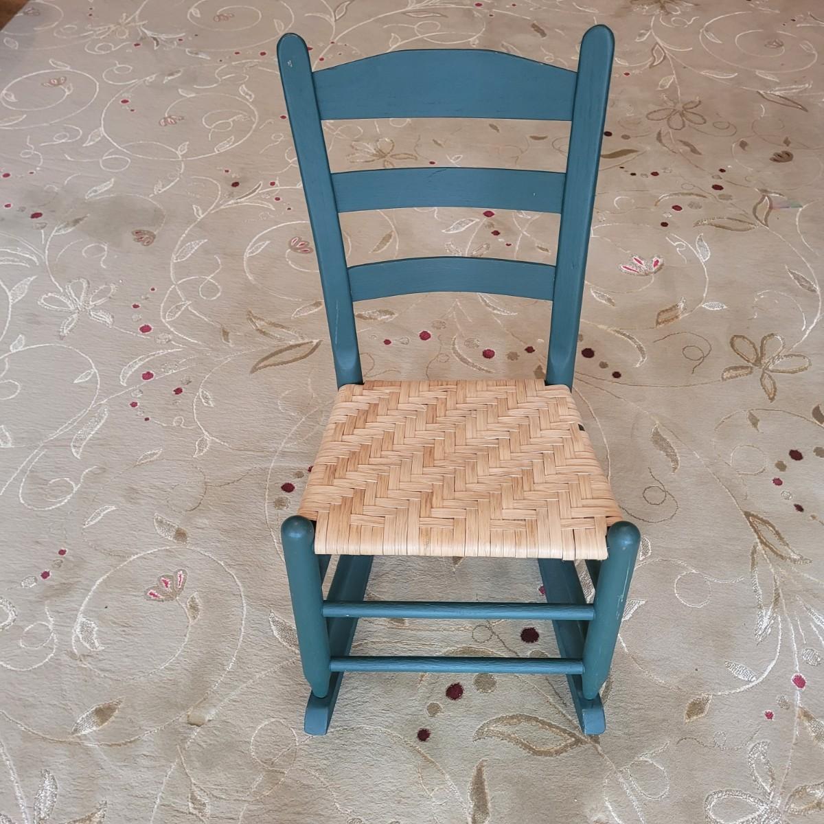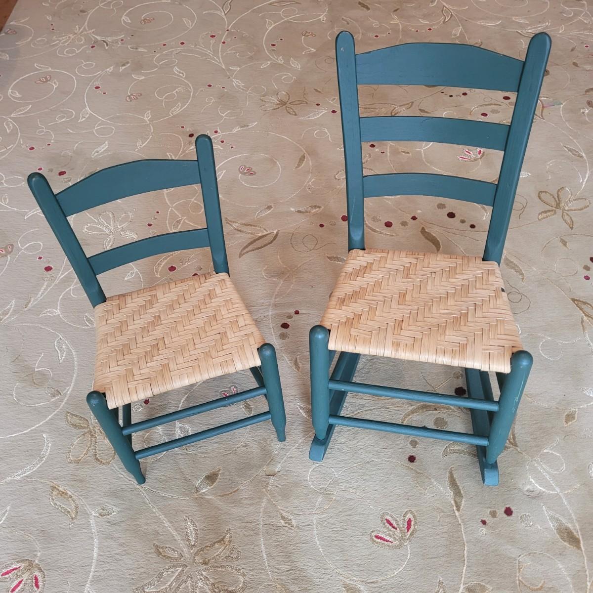 Set of two wooden ladder back children's chairs. One is a rocker style while the other is traditional stationary. Both chairs have a matching forest green paint and woven seats. The larger rocking chair measures 17" x 25" x 33"H with a 16” seat height. The smaller stationary chairs measures 14.5" x 12" x 26.5"H with a 13” seat height. Background rug is for sale in another lot.