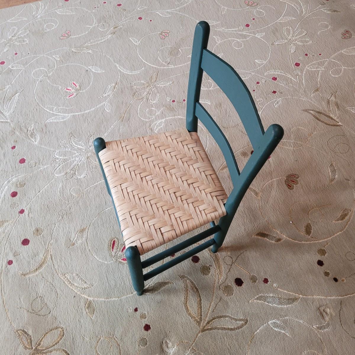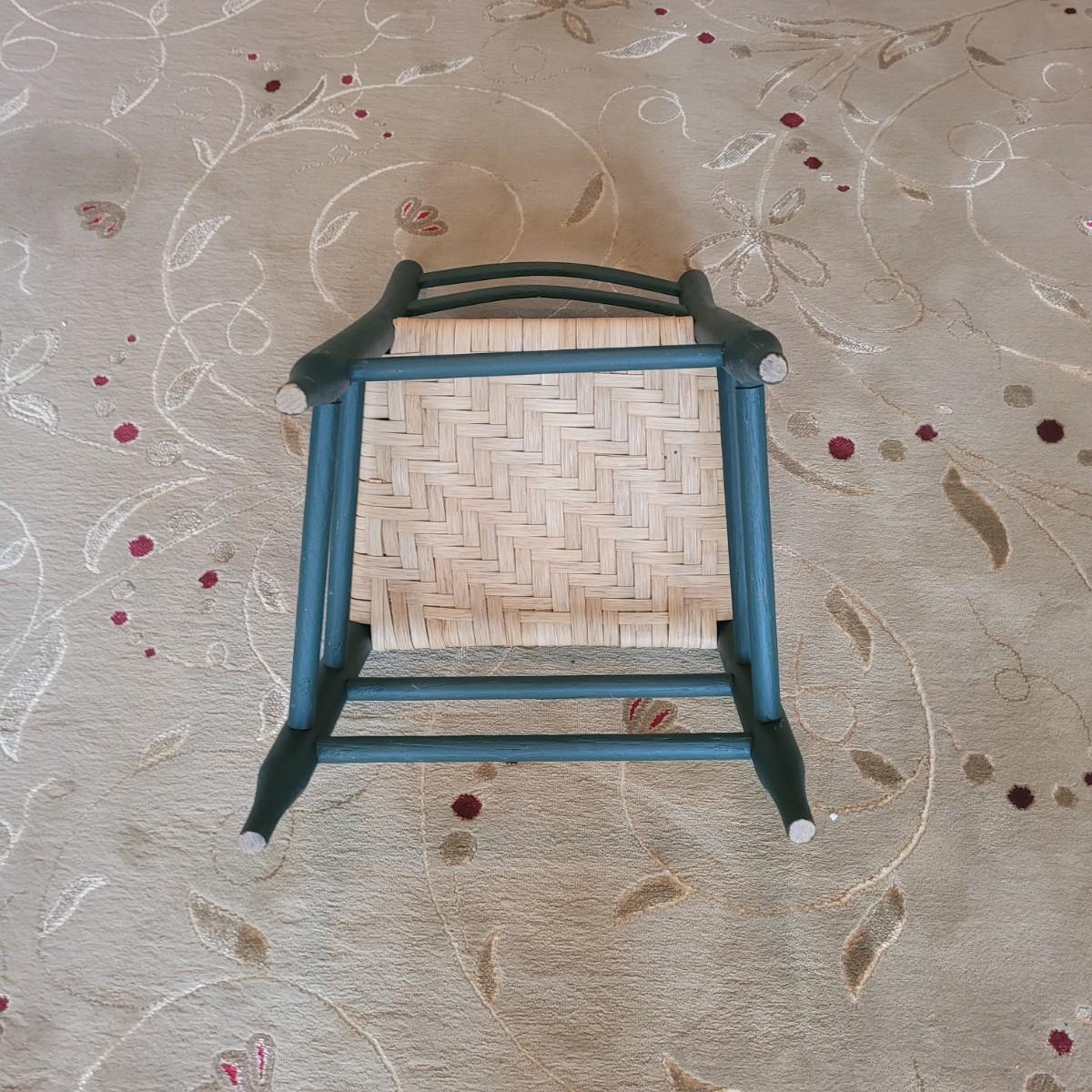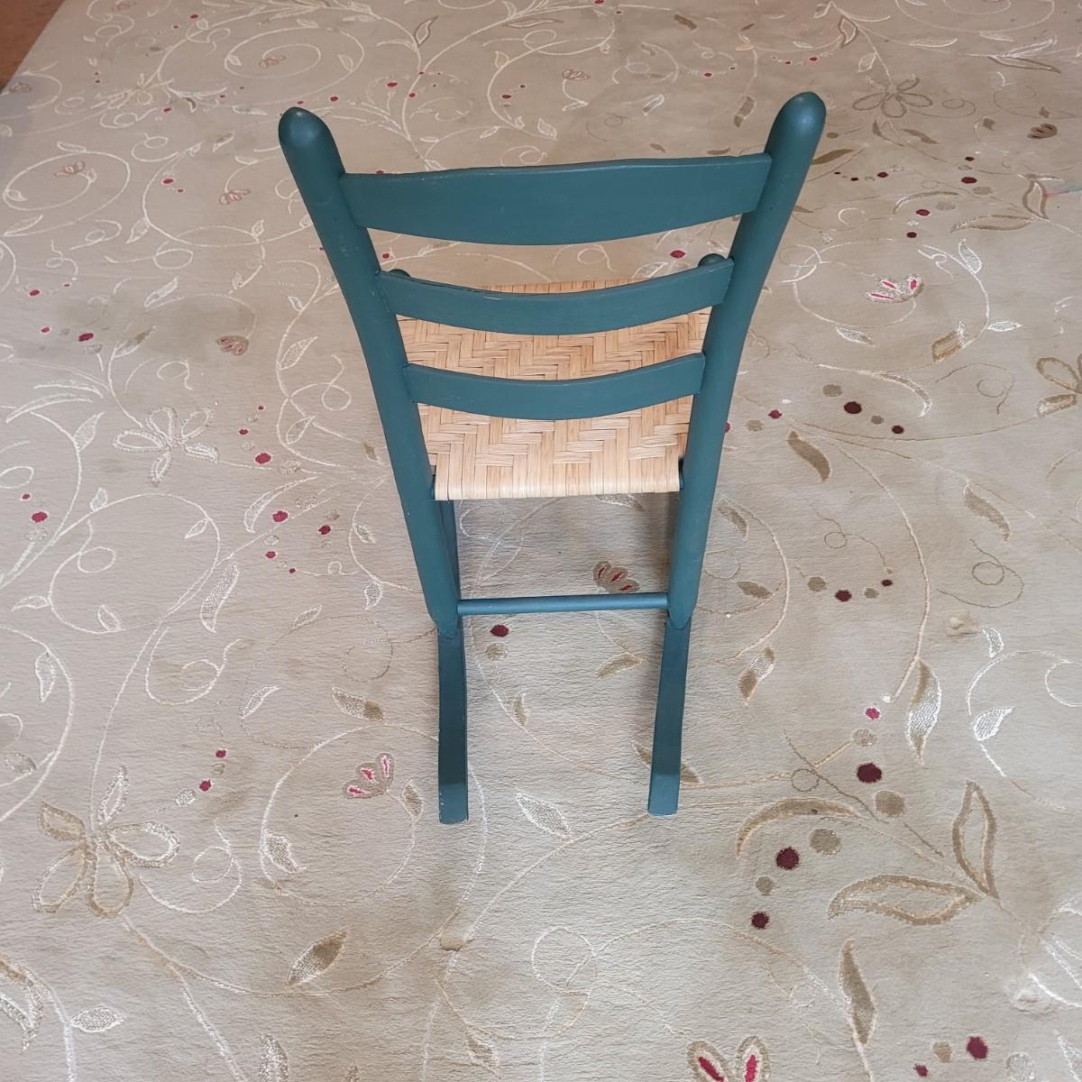 Set of two wooden ladder back children's chairs. One is a rocker style while the other is traditional stationary. Both chairs have a matching forest green paint and woven seats. The larger rocking chair measures 17" x 25" x 33"H with a 16” seat height. The smaller stationary chairs measures 14.5" x 12" x 26.5"H with a 13” seat height. Background rug is for sale in another lot.