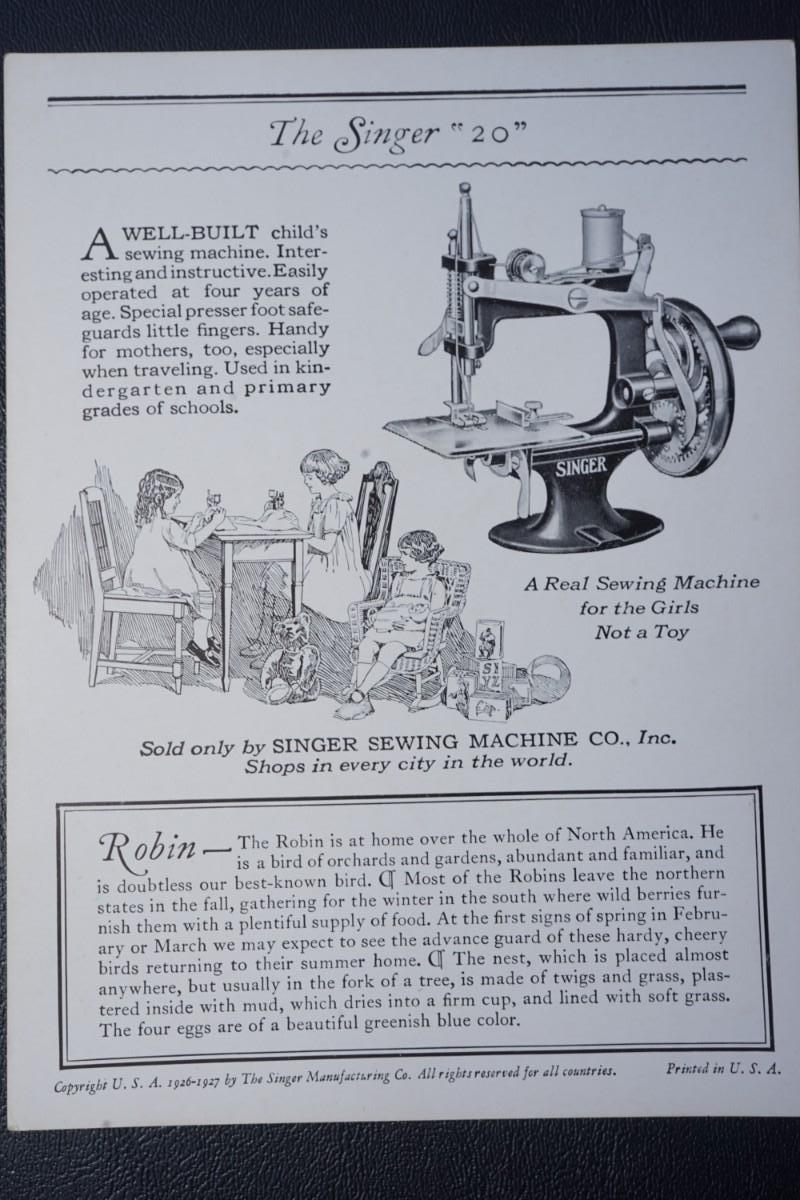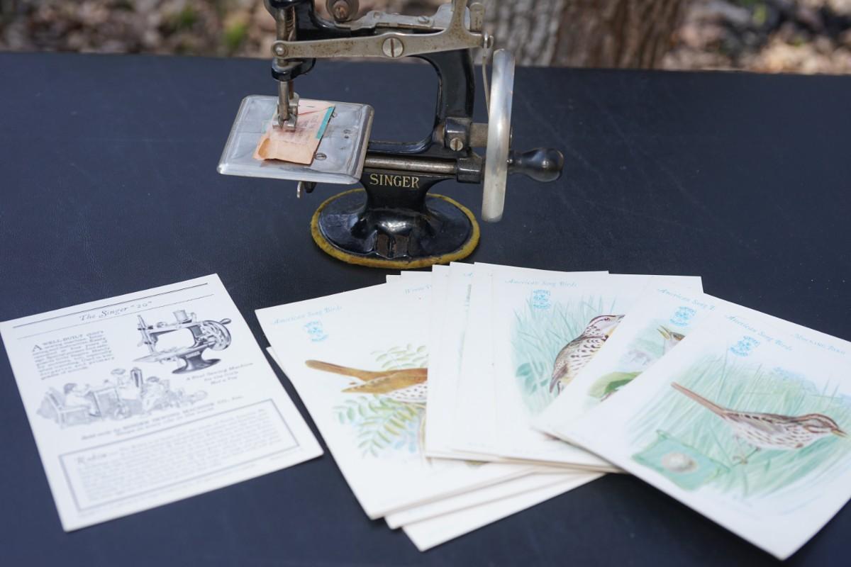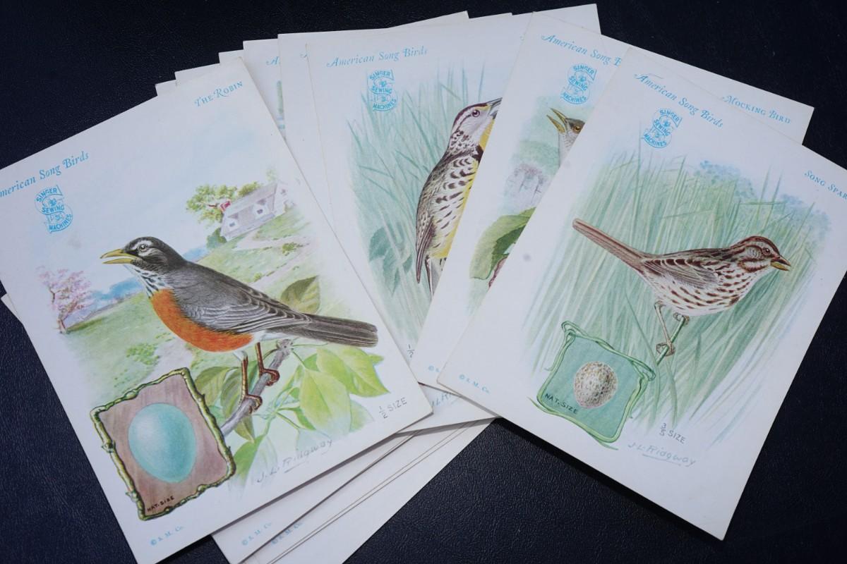 This also comes with the cards from the 1920; s that are a thin paper that have various species of birds on one side and the advertisement for Singer on the other.