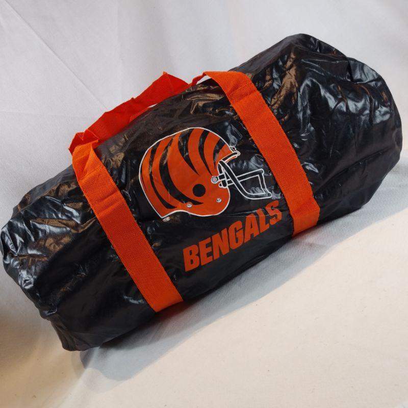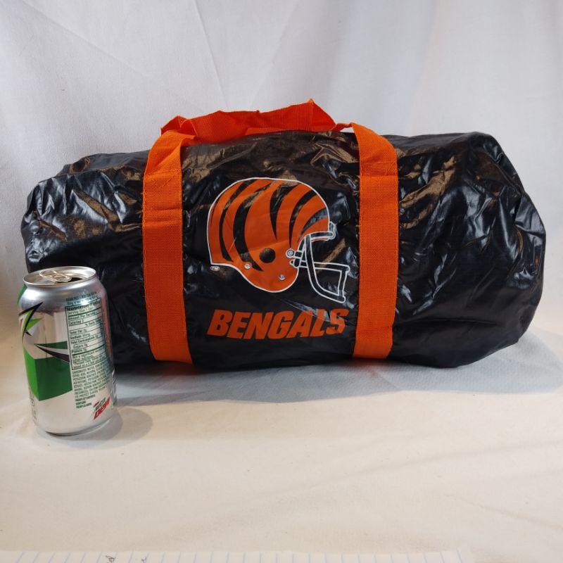 This is a lightweight small-sized Bengals Duffel Bag. Appears unused and is in very good condition. The zipper pull says Winston - so we are guessing it was originally a give-away from the cigarette company. It is 18-inches wide X 9-inches in diameter.