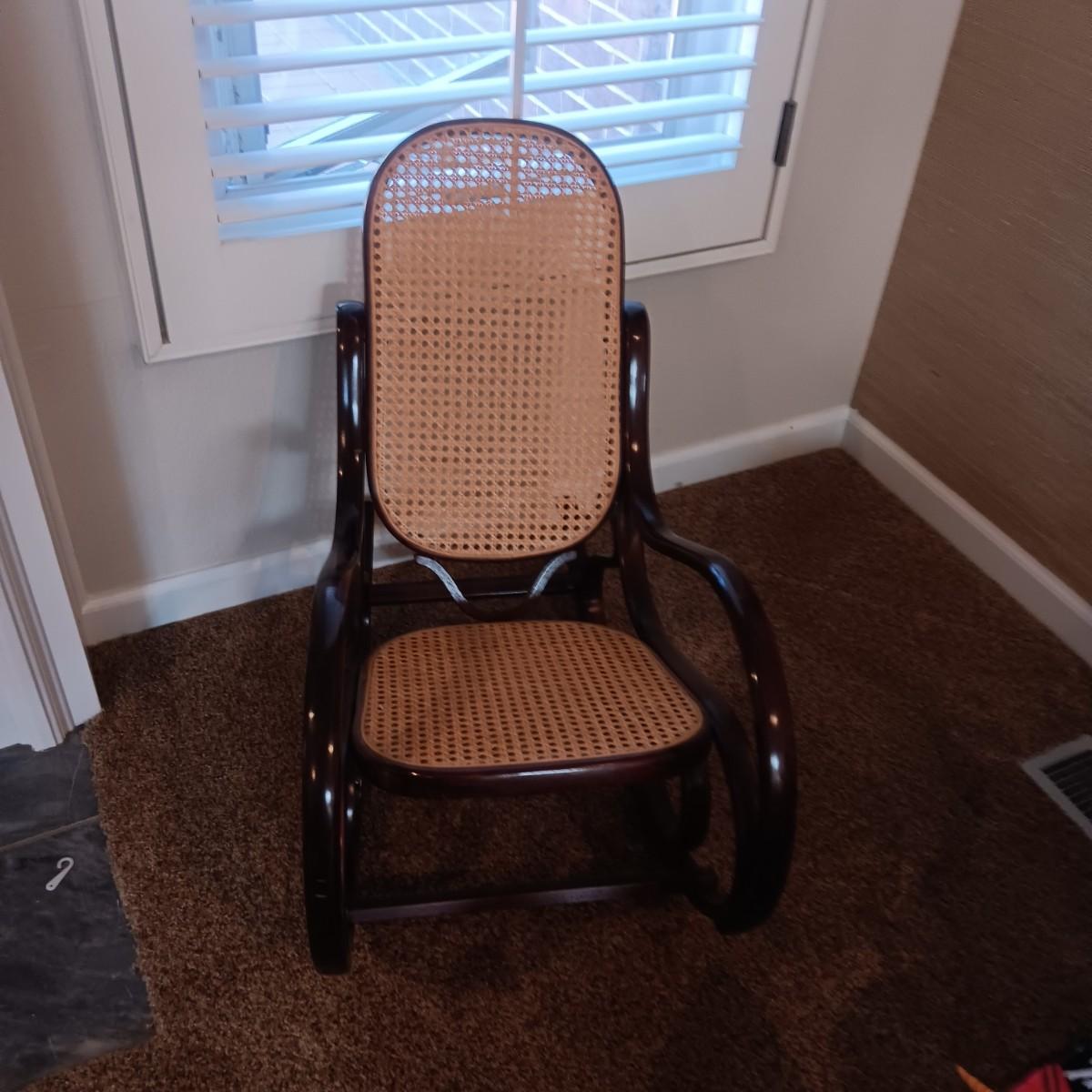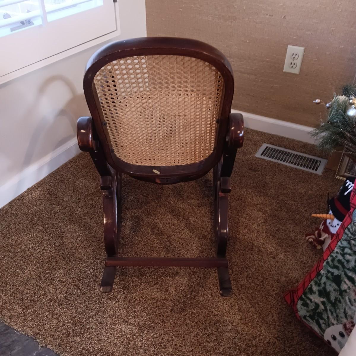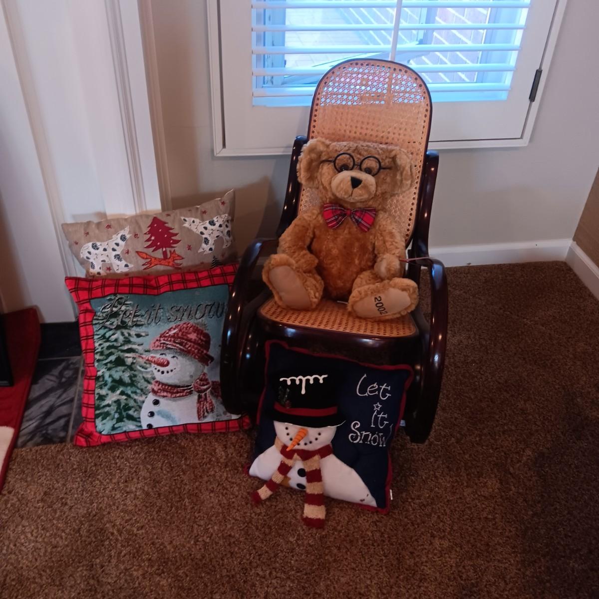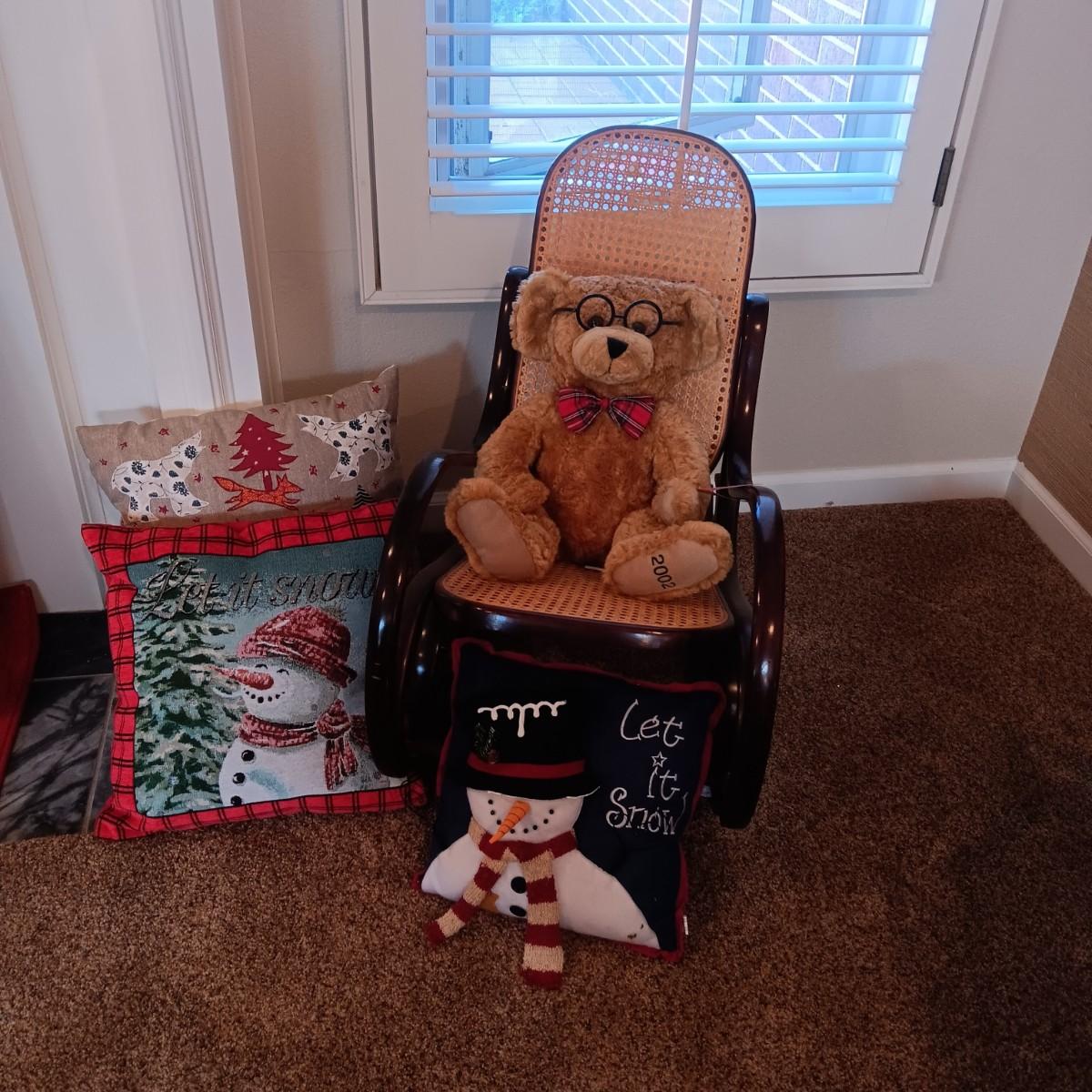 CHILD'S CANED ROCKING CHAIR, PLUSH BEAR & 3 THROW PILLOWS