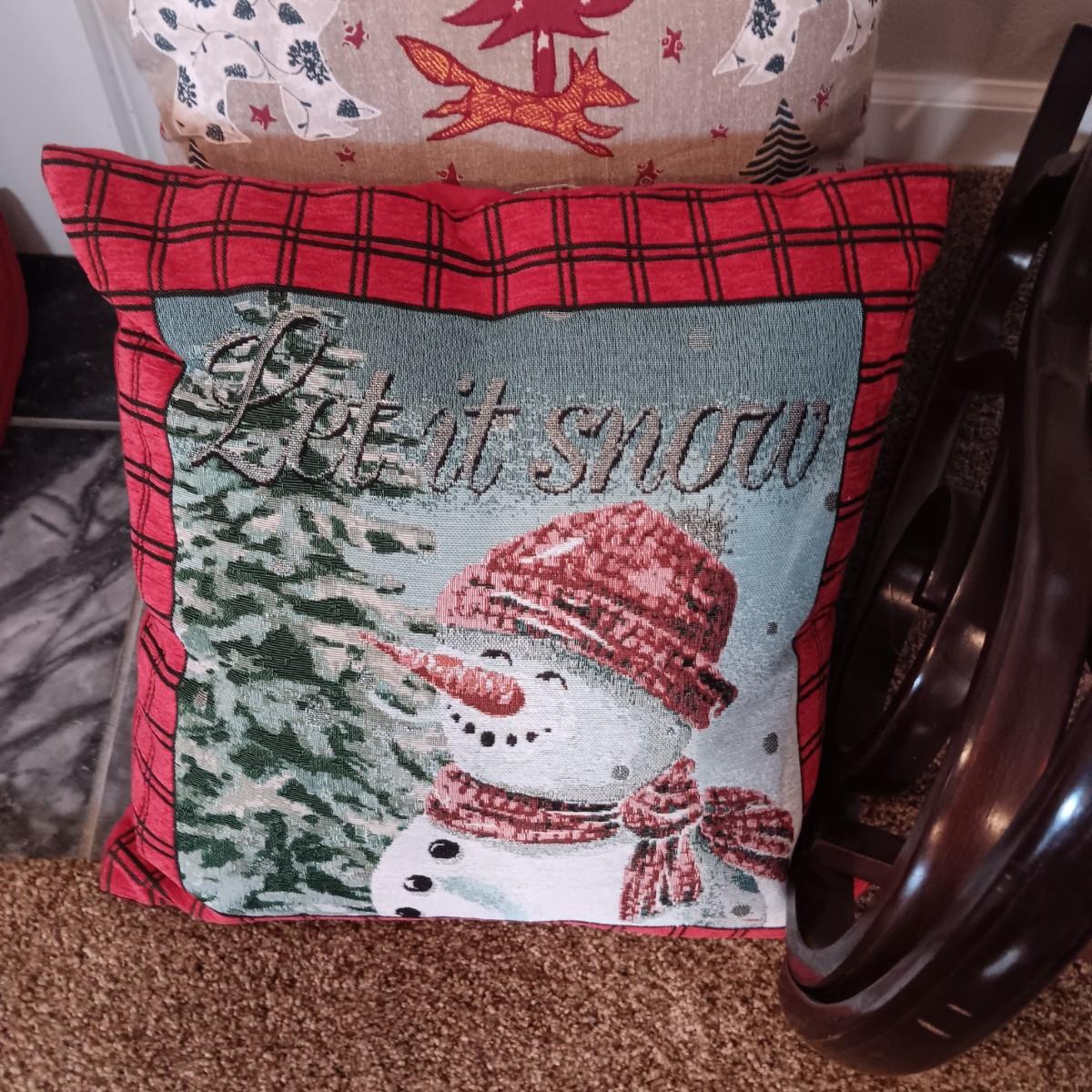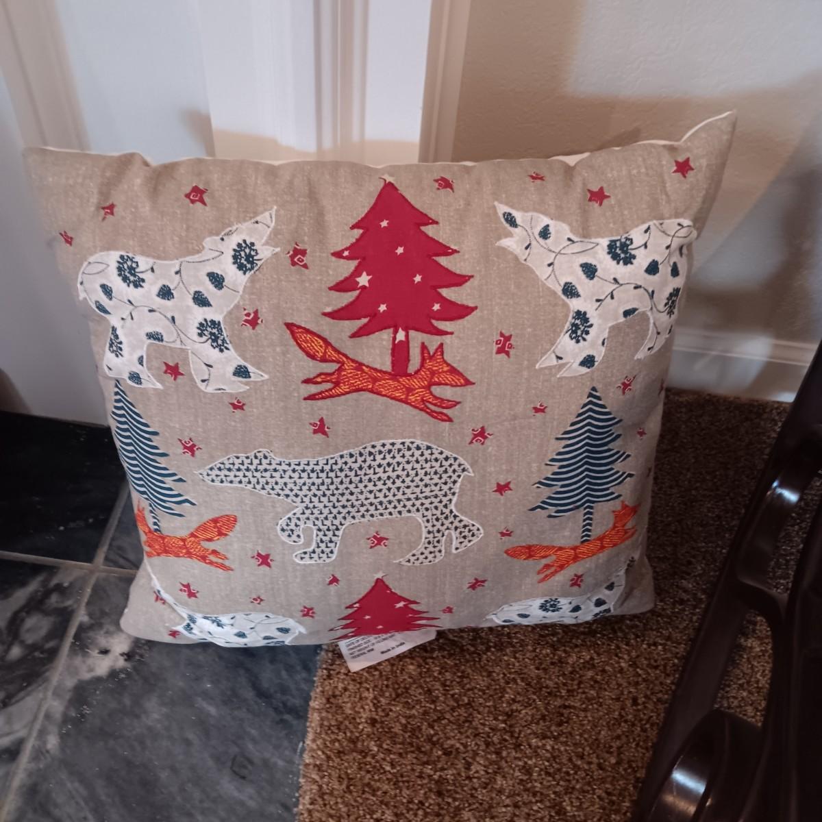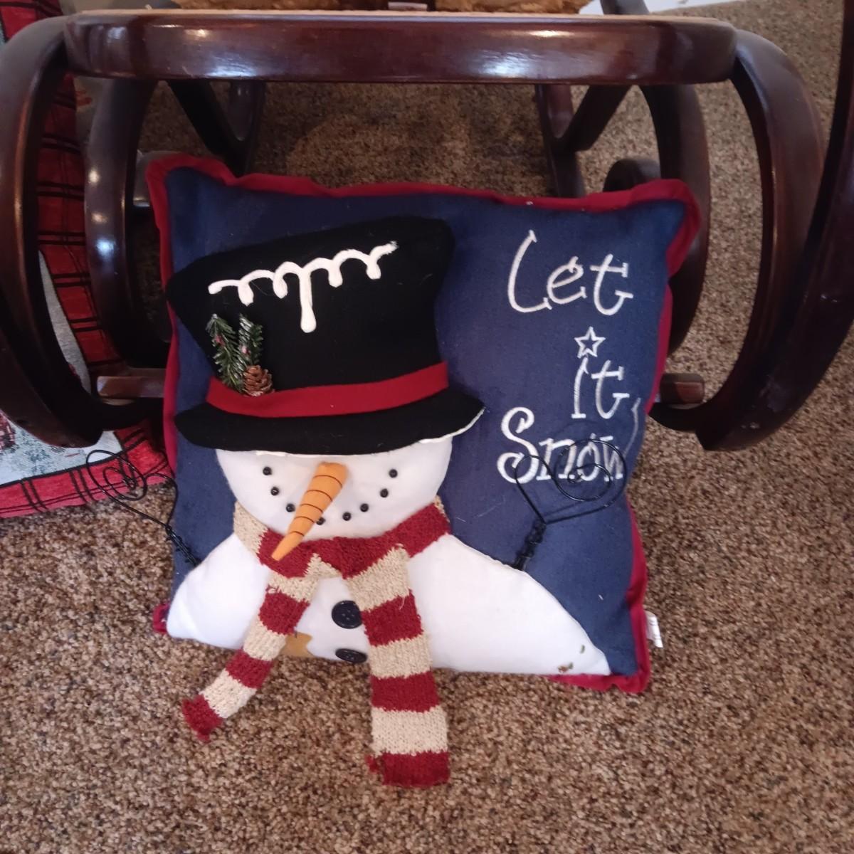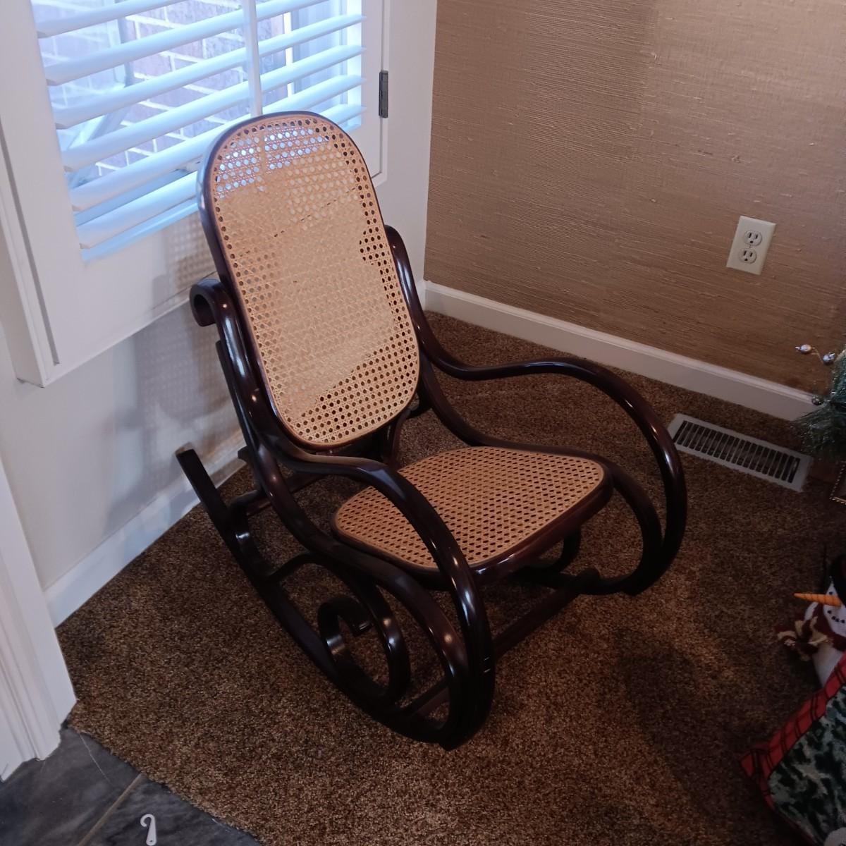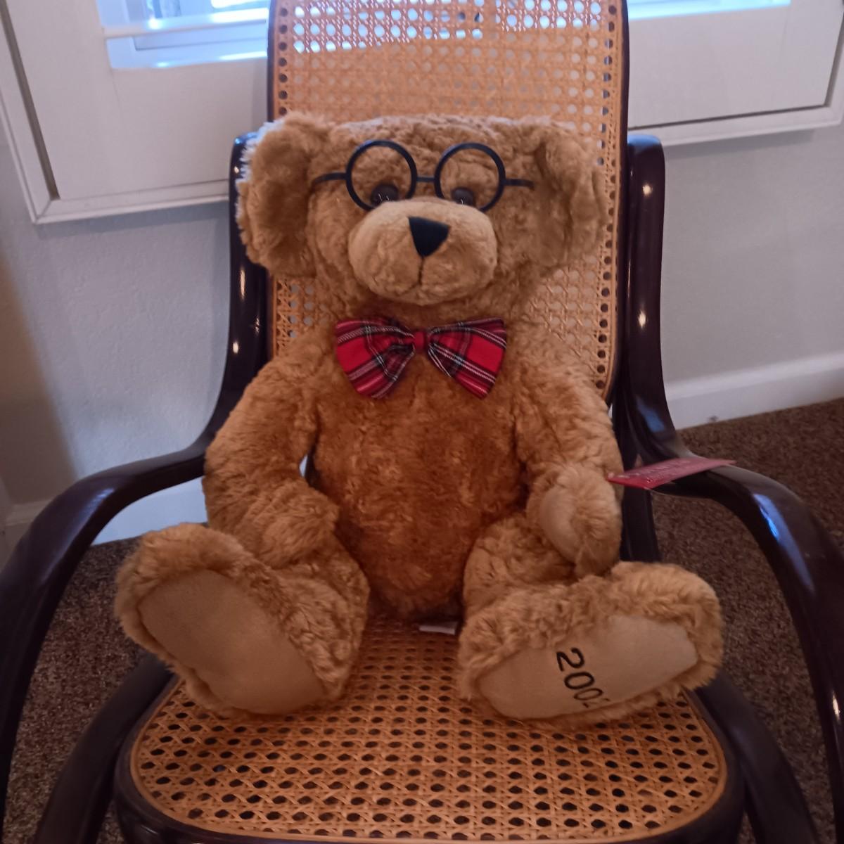 CHILD'S CANED ROCKING CHAIR, PLUSH BEAR & 3 THROW PILLOWS