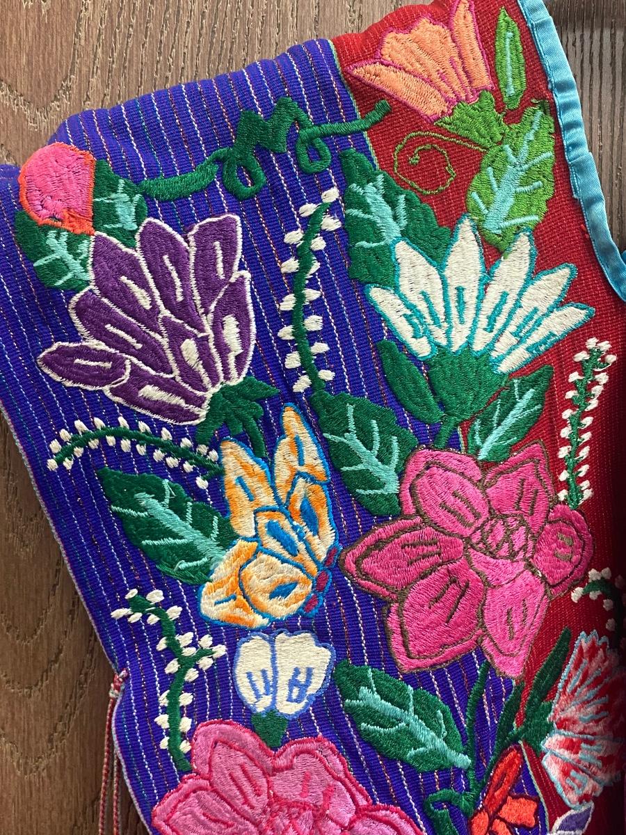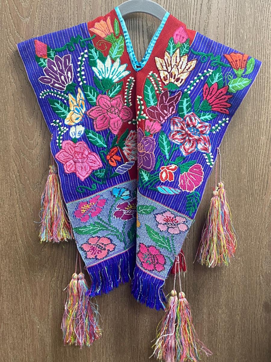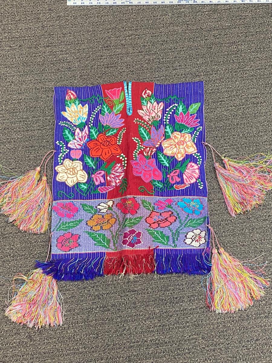 Child's festive poncho. Ornate floral embroidered design. Very colorful, similar front and back with tassel side ties. In good vintage condition, great for display. About 17" wide and 22" long.