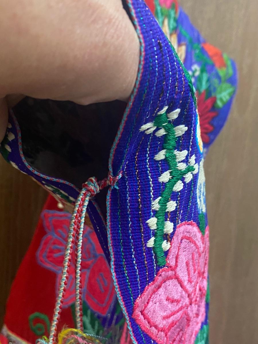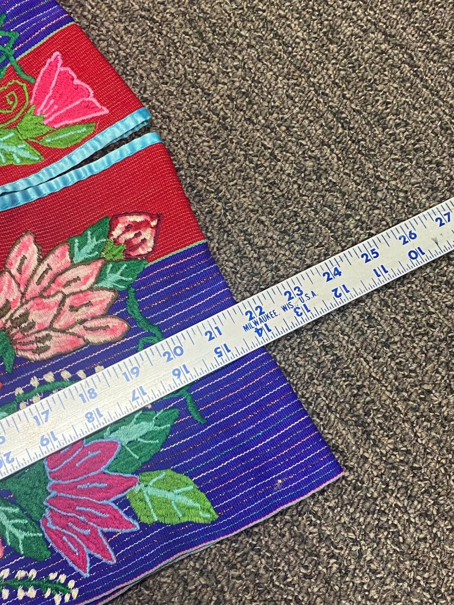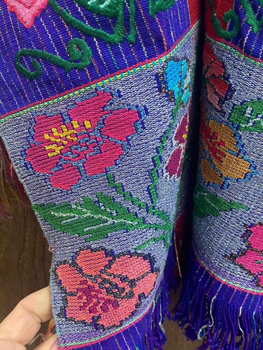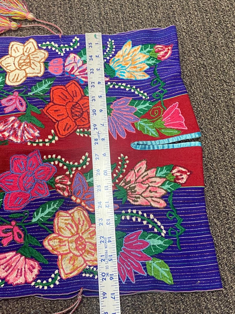 Child's festive poncho. Ornate floral embroidered design. Very colorful, similar front and back with tassel side ties. In good vintage condition, great for display. About 17" wide and 22" long.