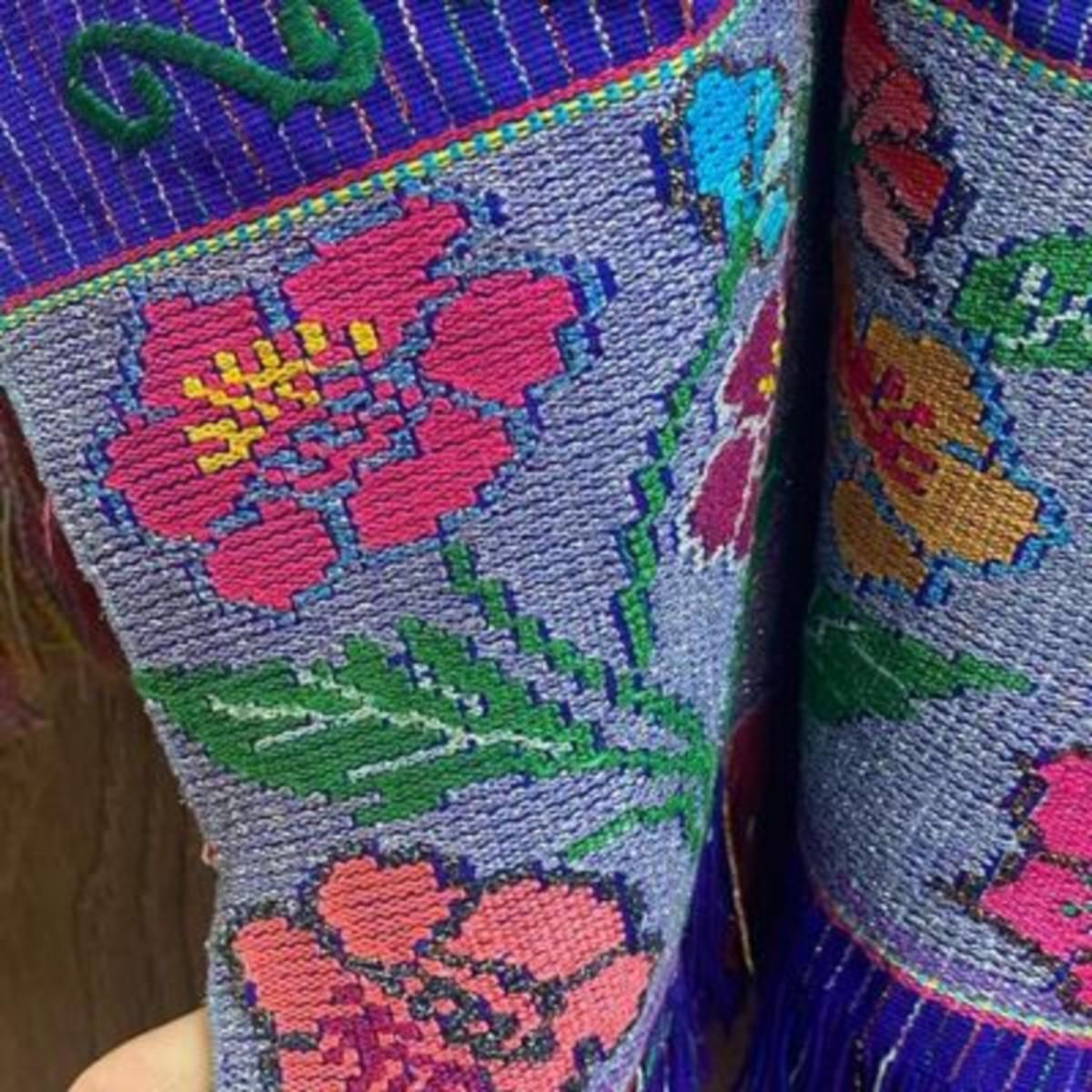 Child's festive poncho. Ornate floral embroidered design. Very colorful, similar front and back with tassel side ties. In good vintage condition, great for display. About 17" wide and 22" long.