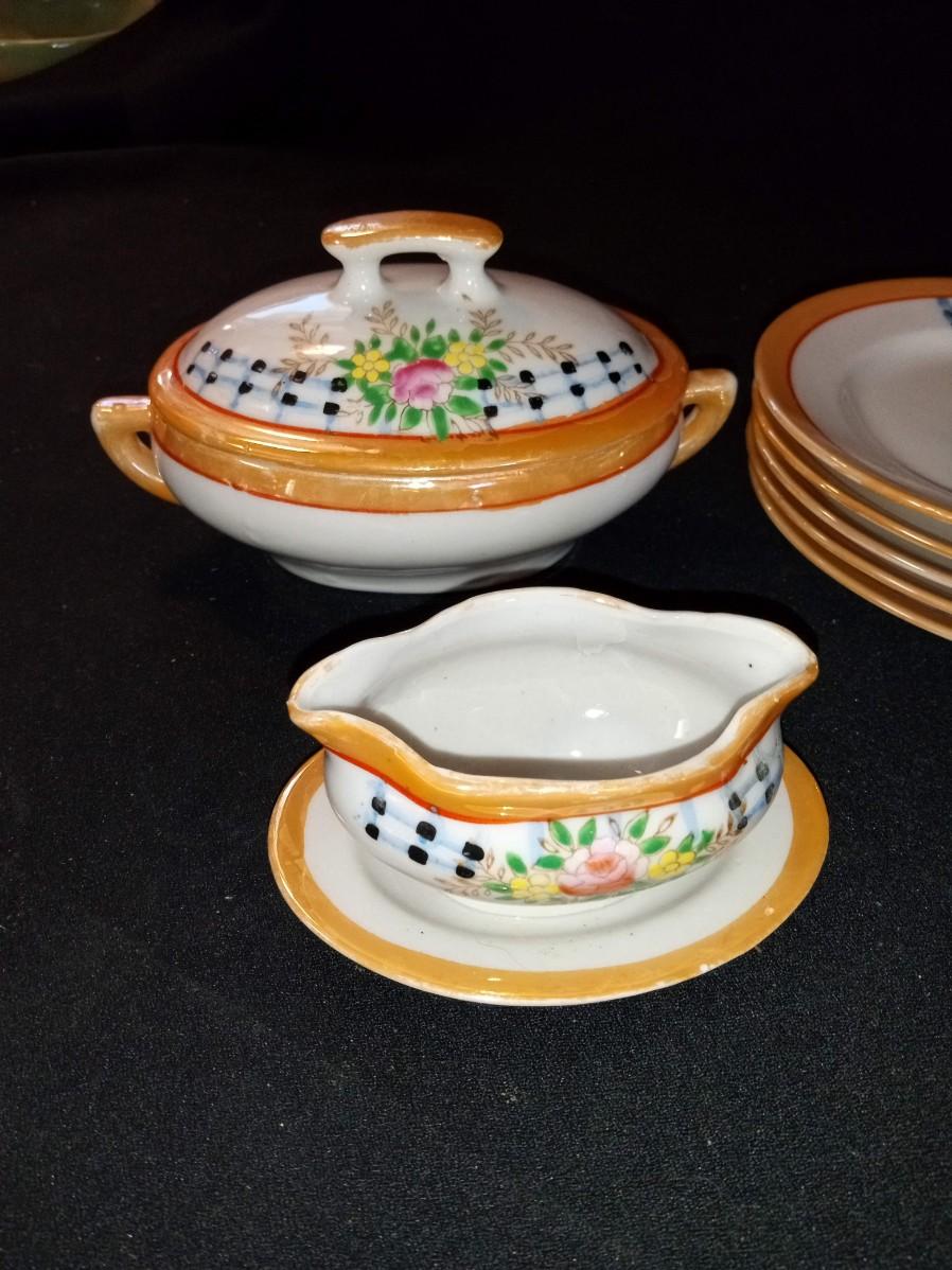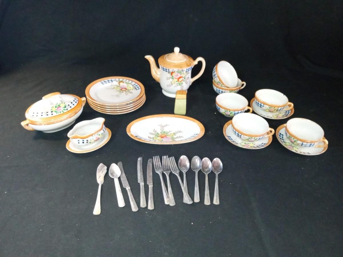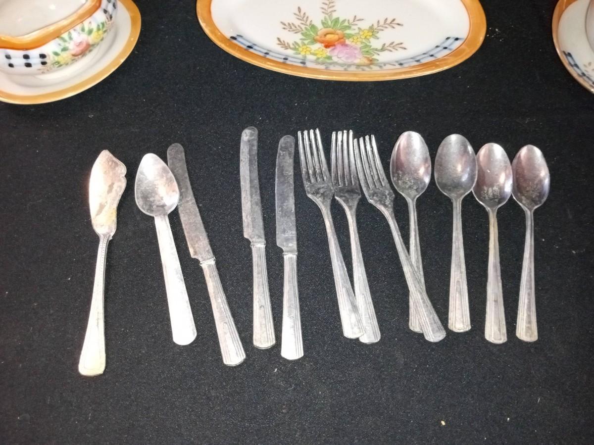 SET IS NOT COMPLETE AND THERE ARE A FEW CHIPS, INCLUDES SOME TIN FLATWARE