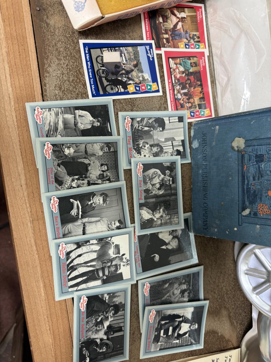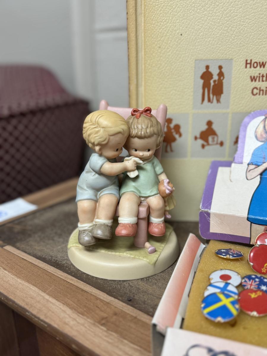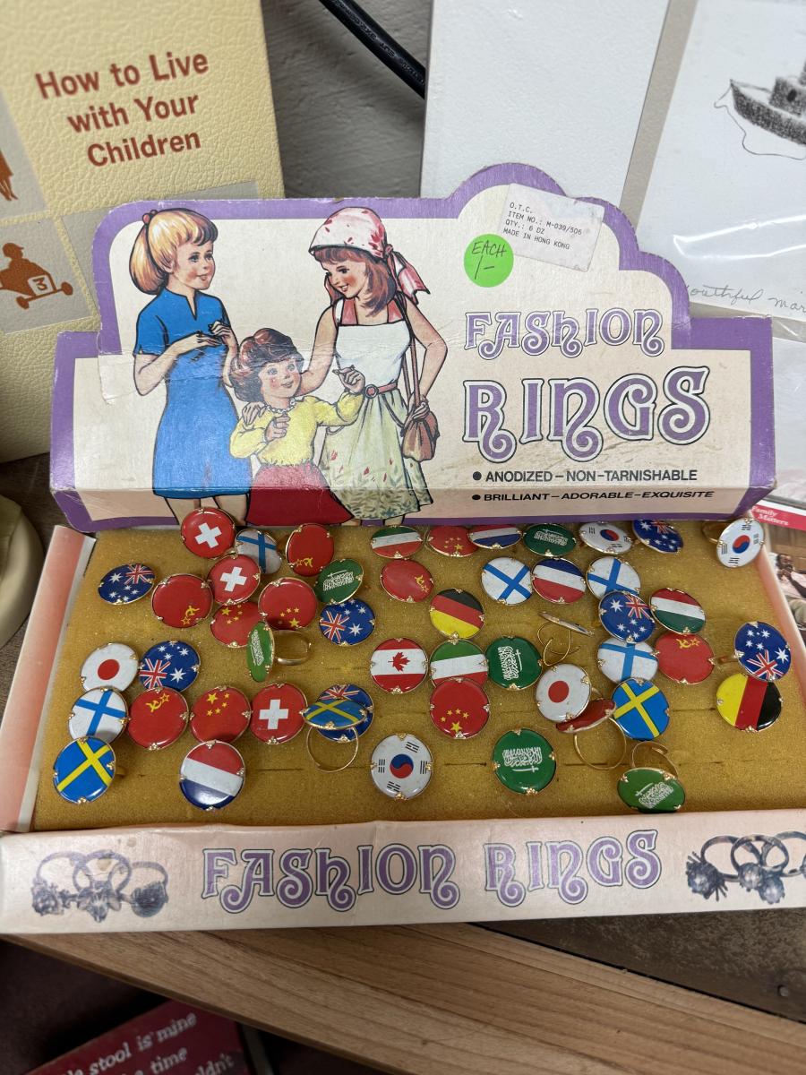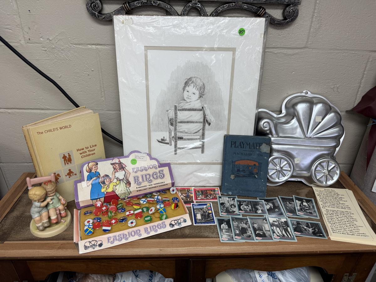 Pencil art, vintage books, porcelain twins, cake pan, vintage international flag rings, collectibles TV show cards