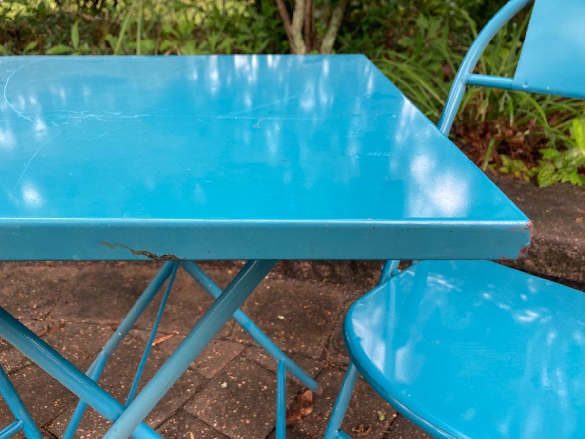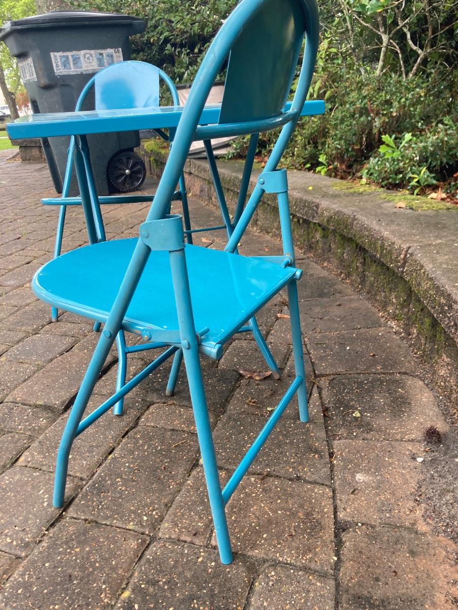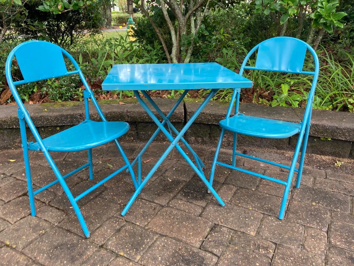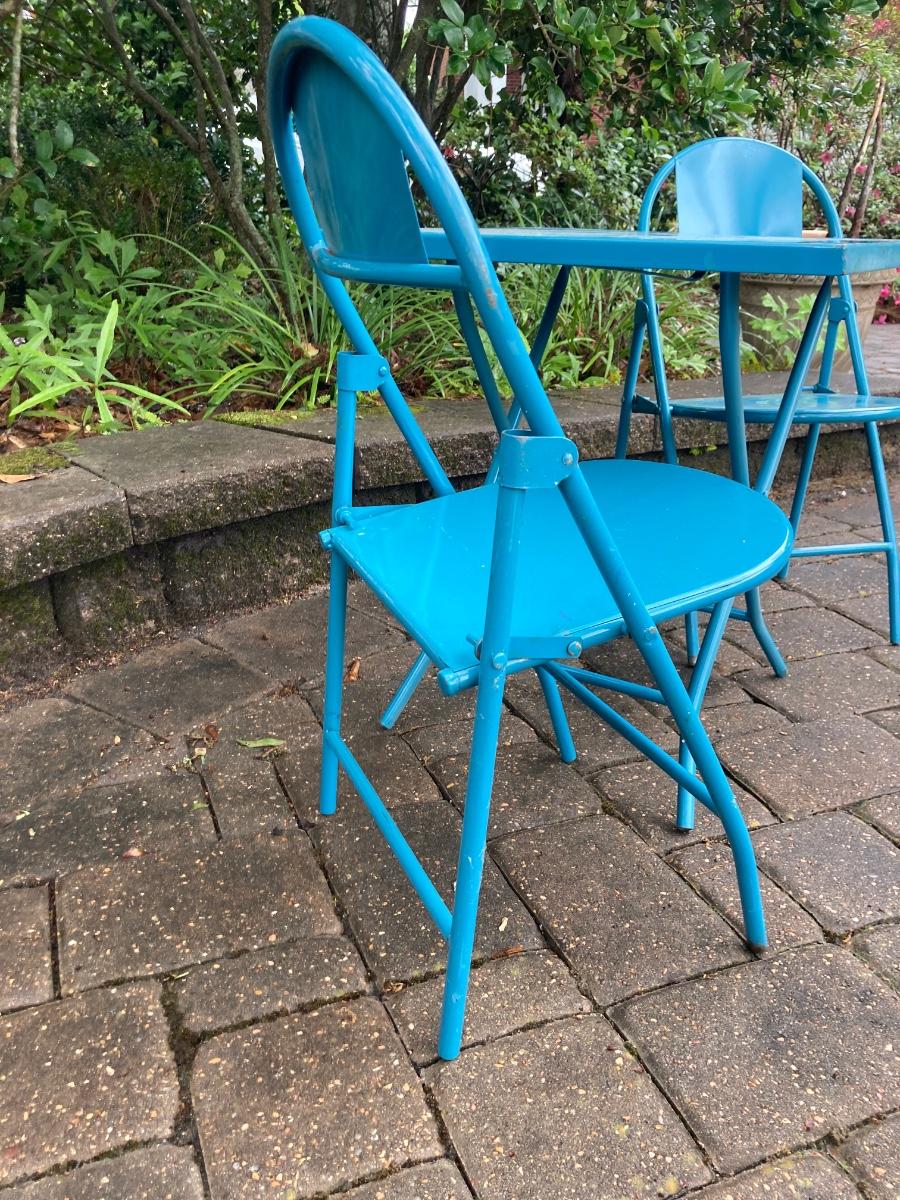 Child’s vintage metal blue table and chairs 19 1/4 Square 21” tall table. Two chairs 13” wide 26” tall. Very good vintage condition with minor scratches.