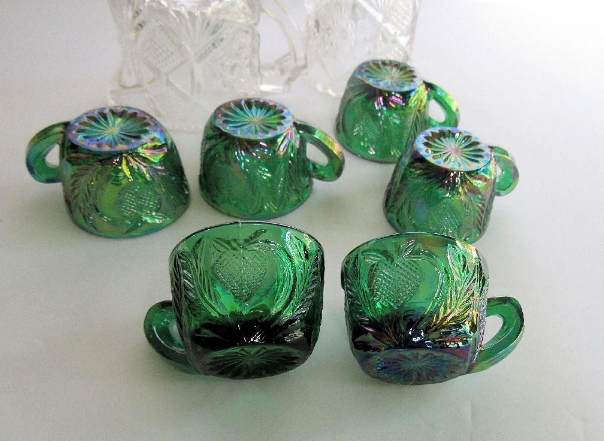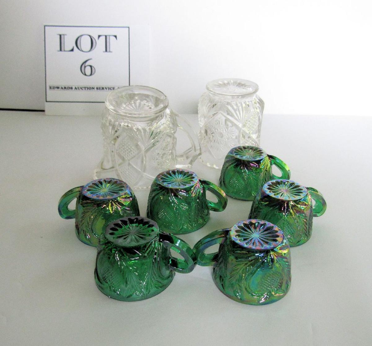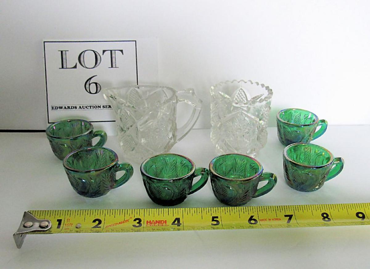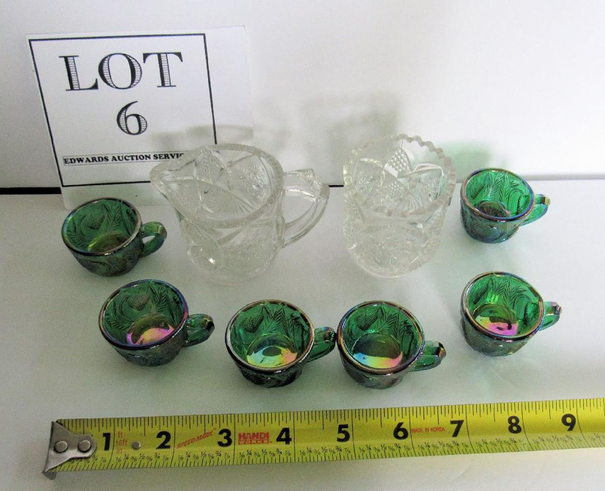 Child's Old EAPG Spooner and Creamer and 6 Green Carnival Glass Childs Inverted Strawberry Punch Cups