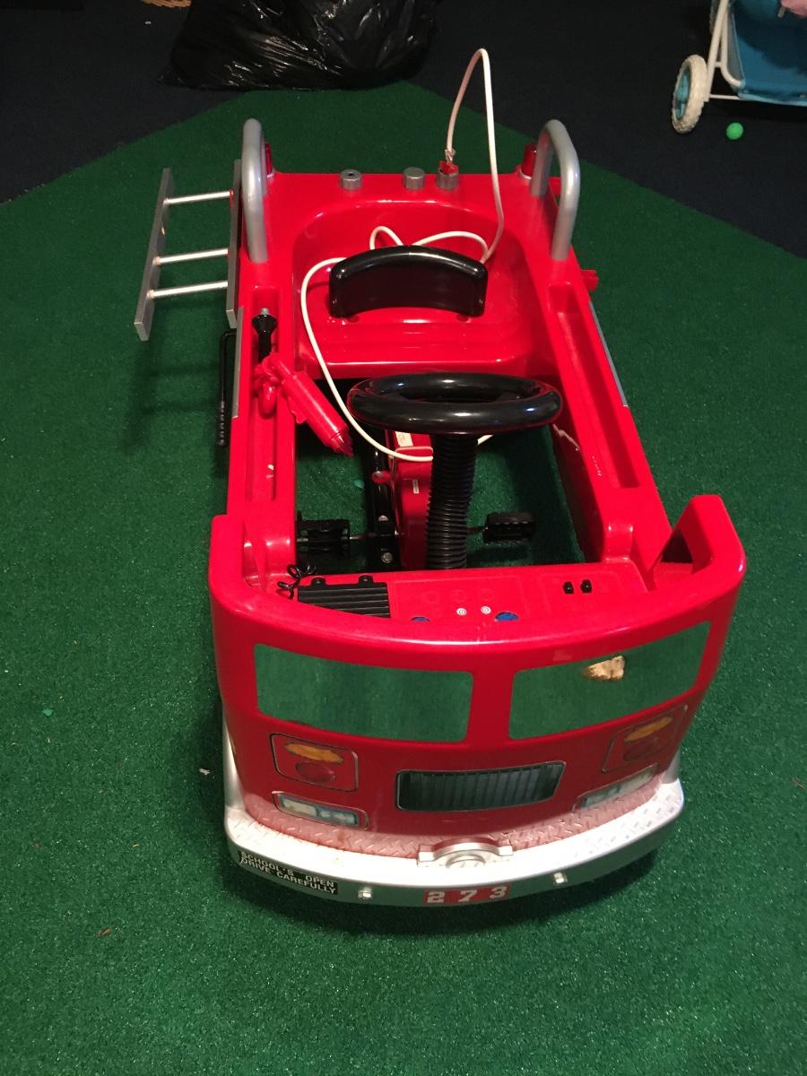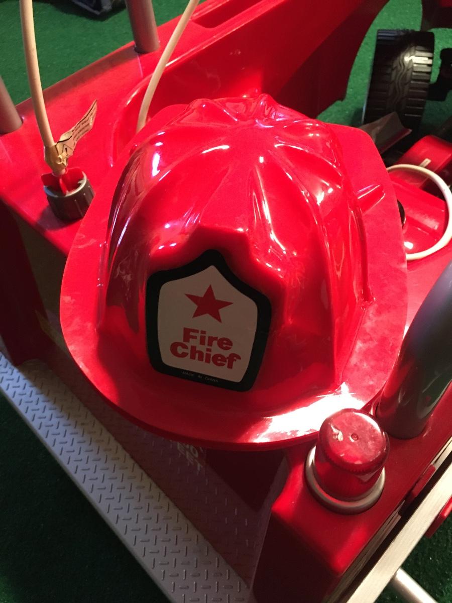 Fun childs firetruck. Can pedal and steer . IN used condition, but still fun and 'fires' up a child's imagination. Comes with extra fireman hats.