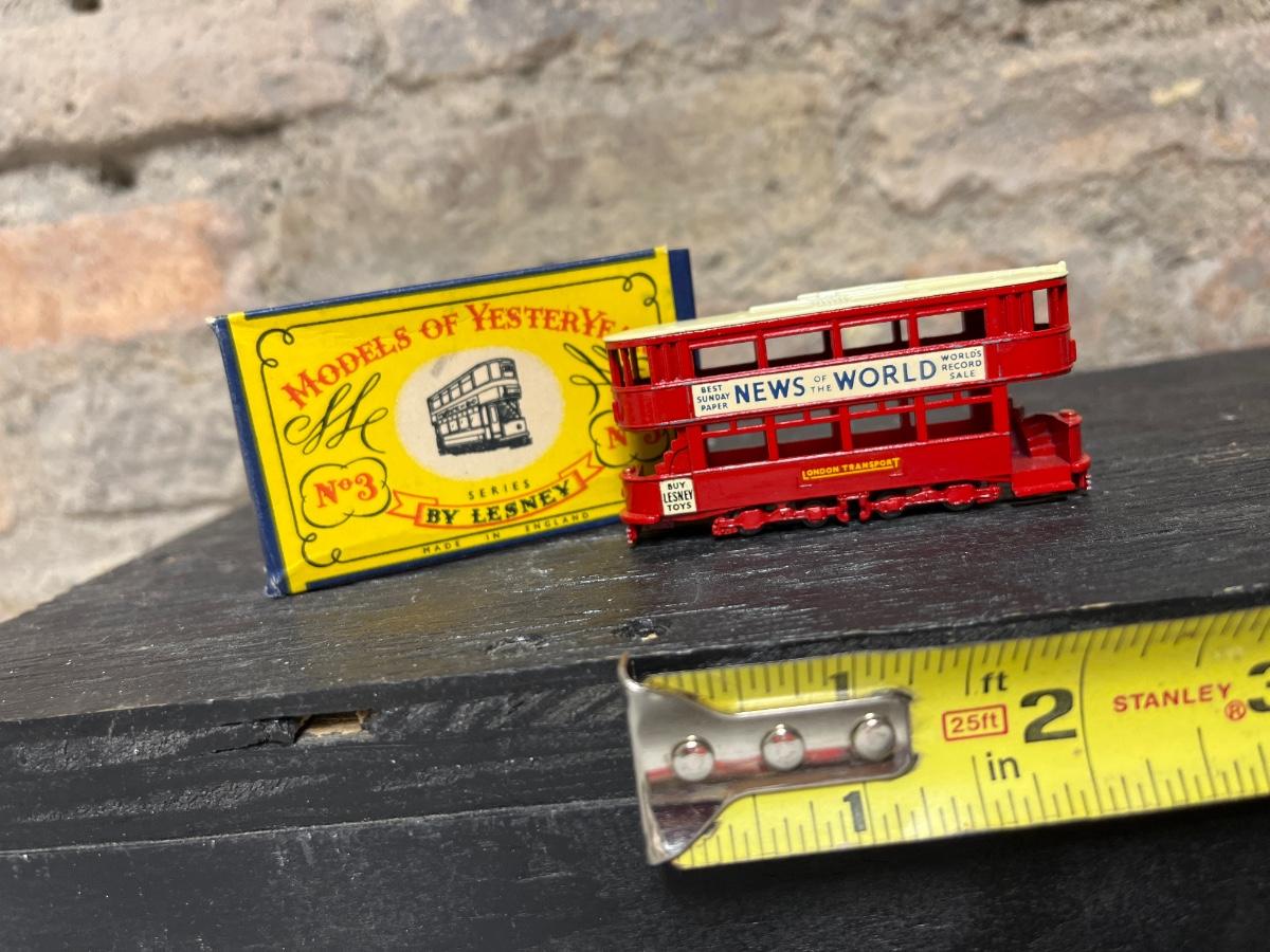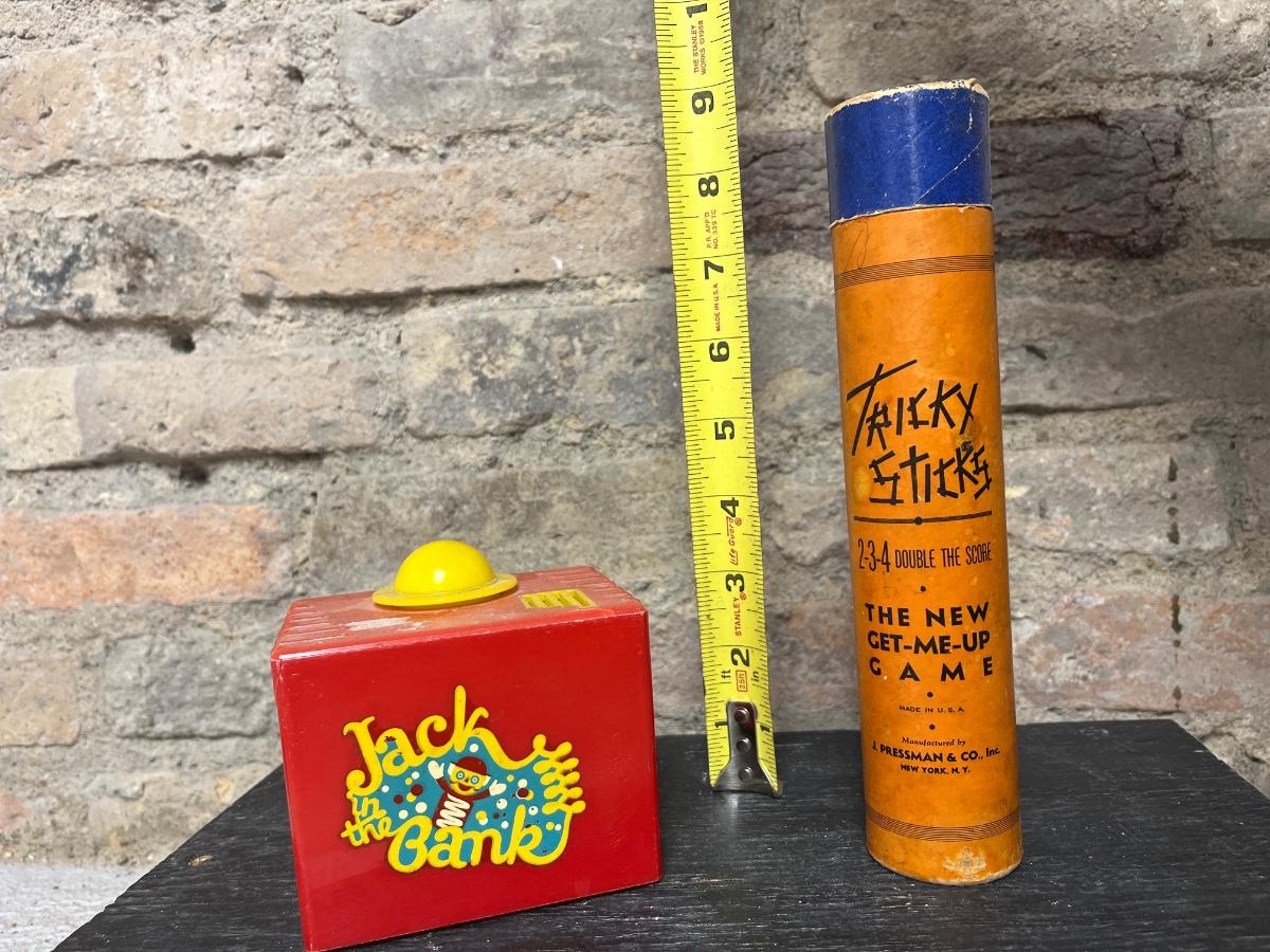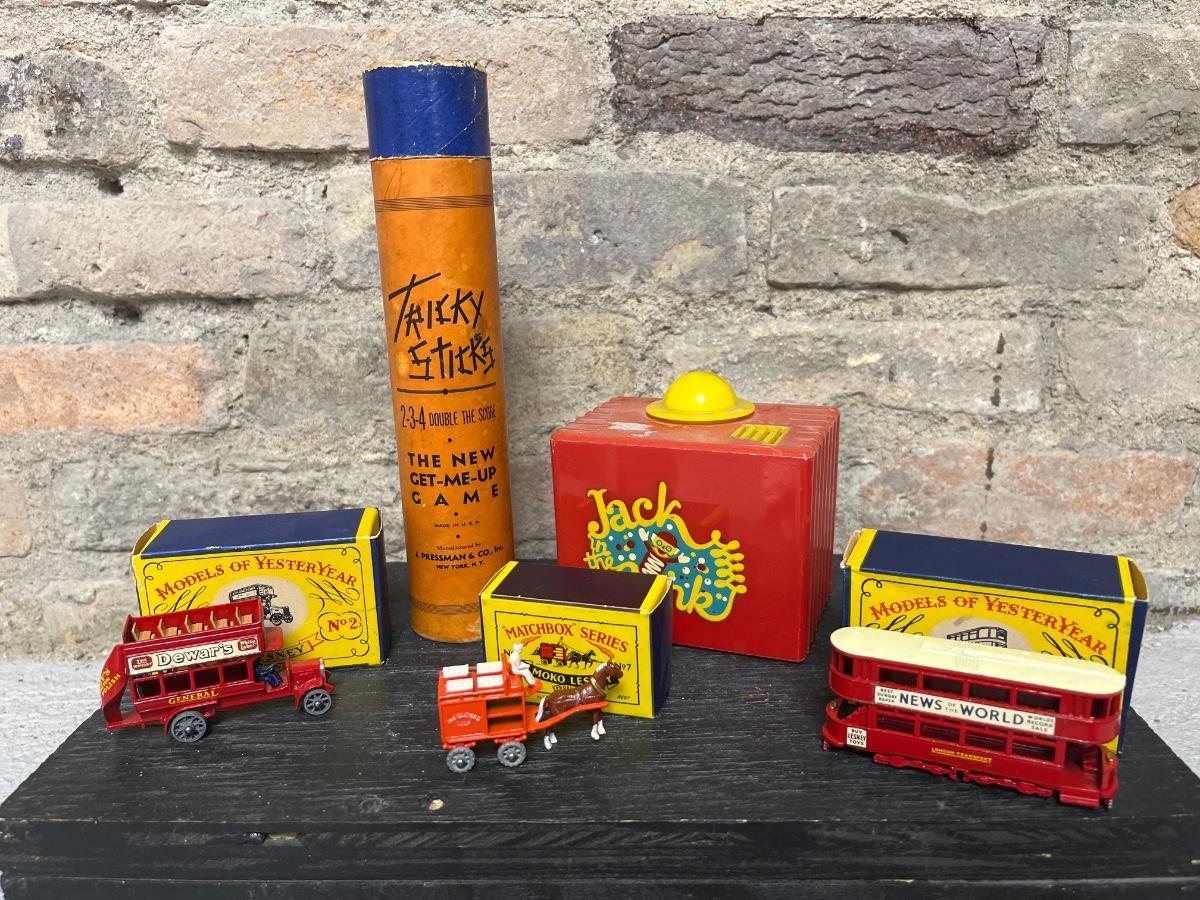 Vintage Jack in the Bank, vintage Tricky Sticks, and three Lesney Models of Yesteryear miniature models