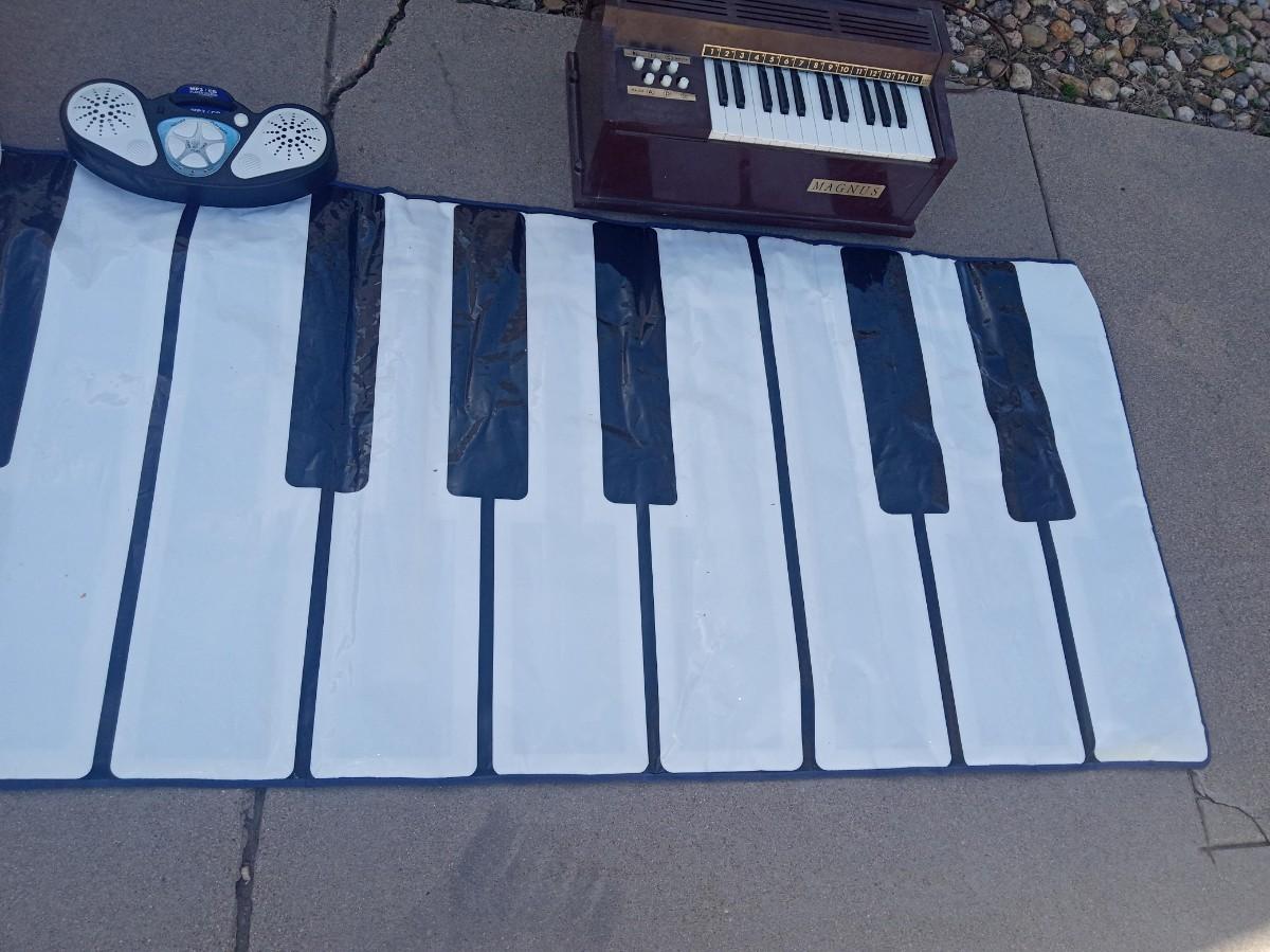 FOLDING CHAIR, ELECTRIC ORGAN AND A FLOOR MAT PIANO THAT PLAYS NOTES DEPENDING WHERE YOU STEP