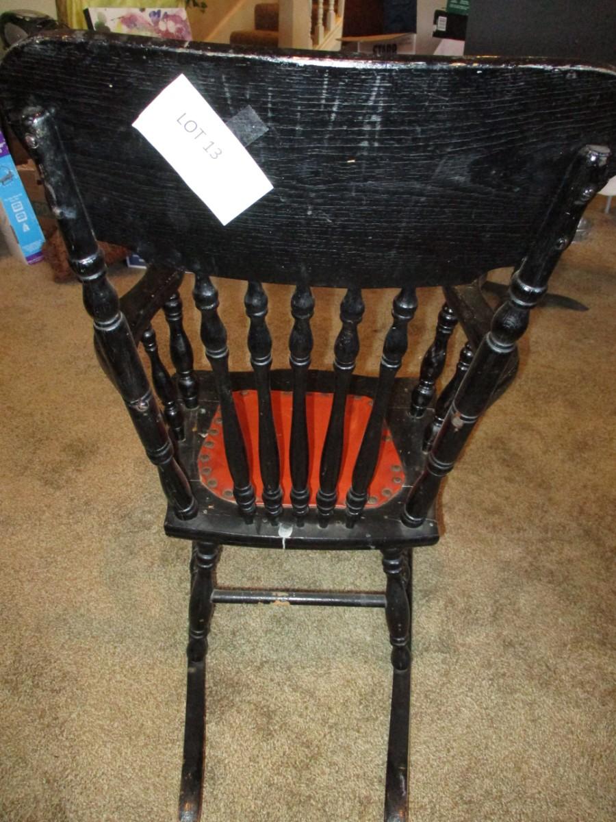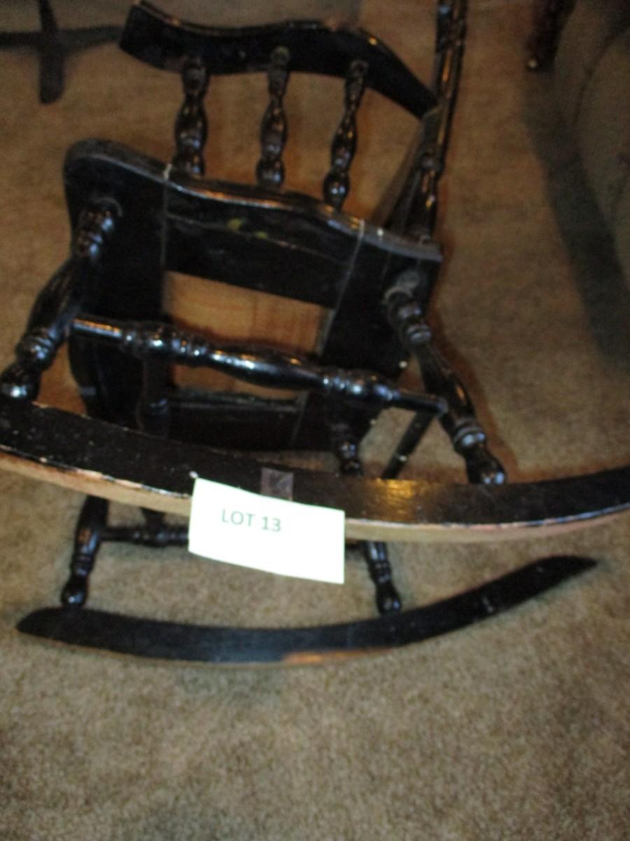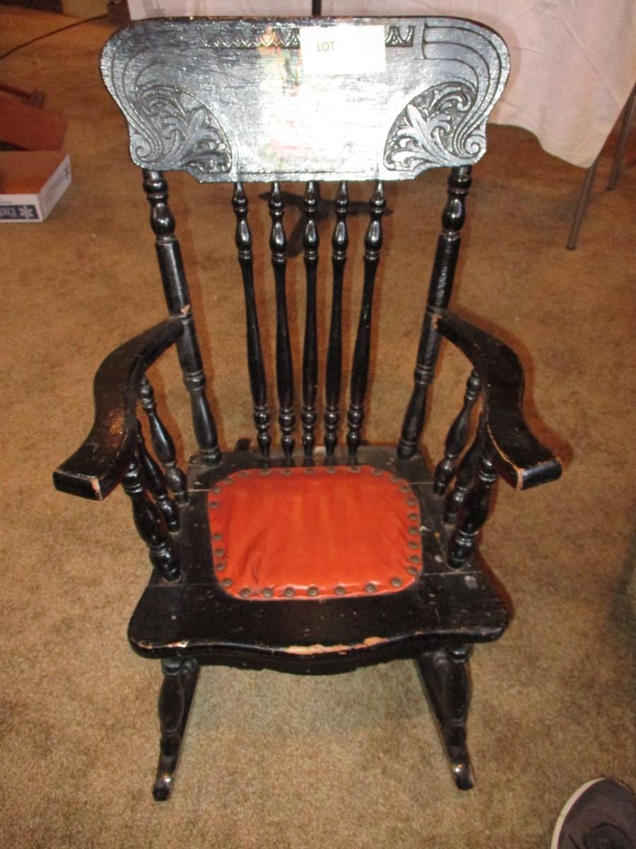 Black Child's Rocker. Normal wear. Leather seat cushion.