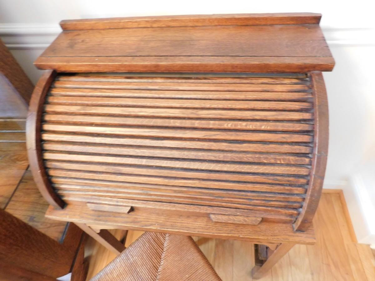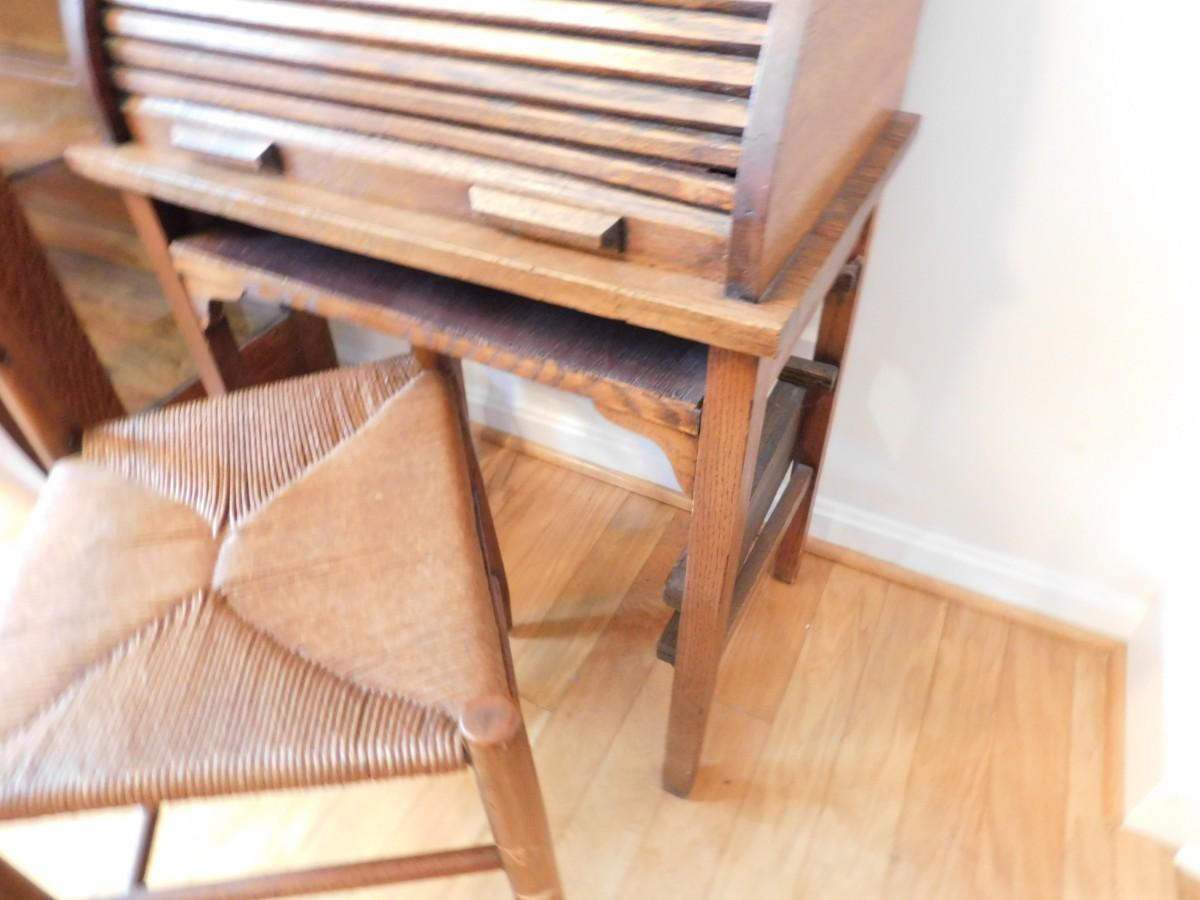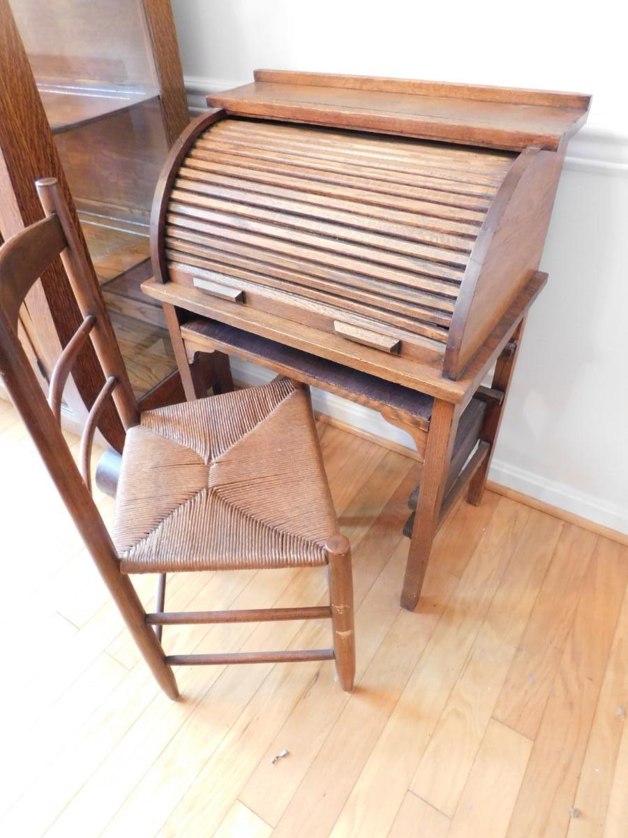 Childs Size Antique Oak Roll Top Desk w/ Ladder Back Rush Seat