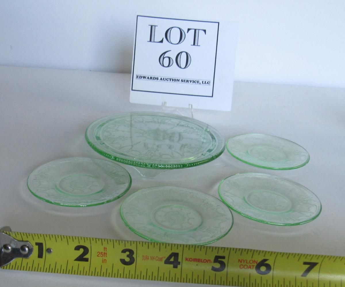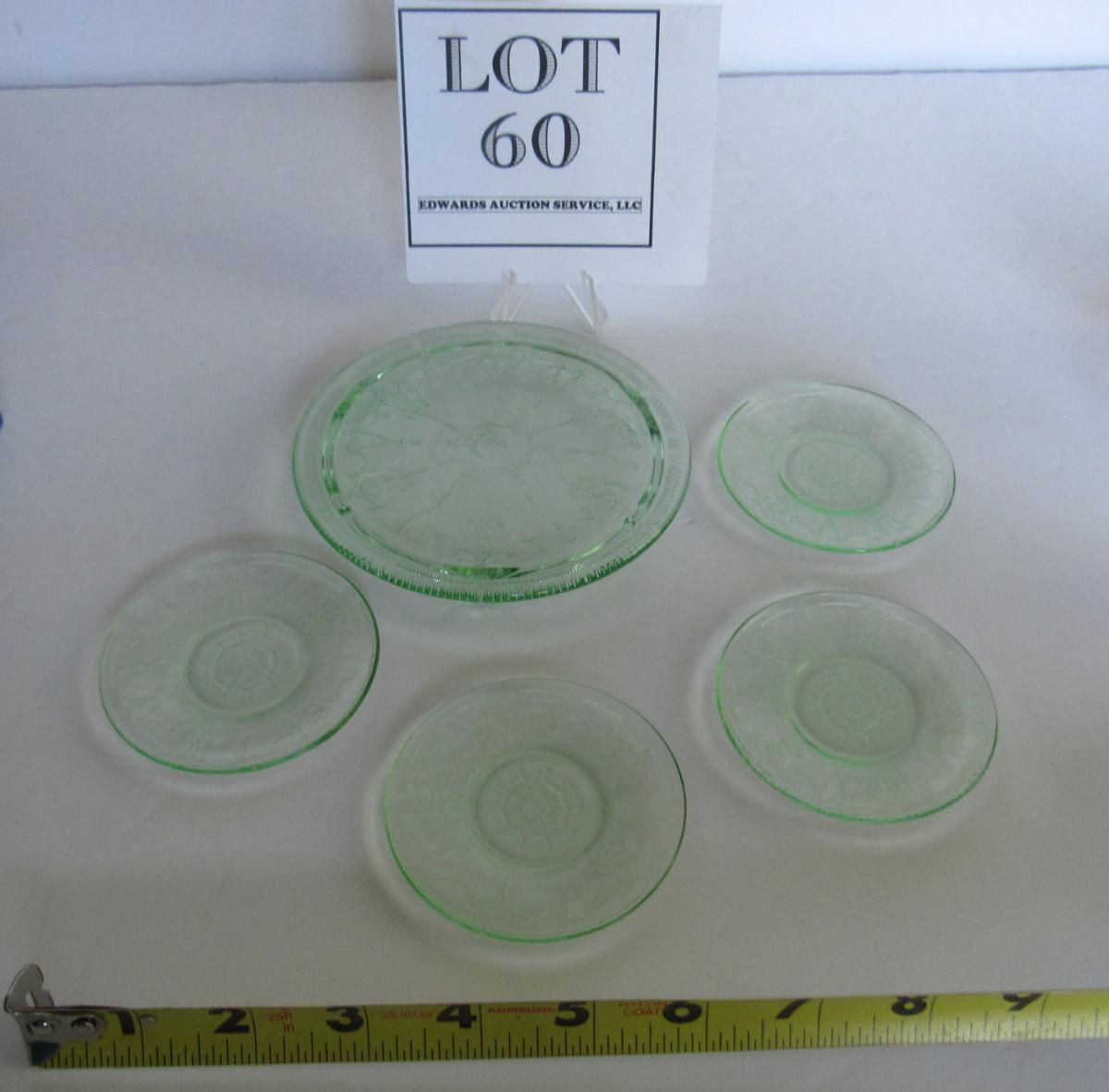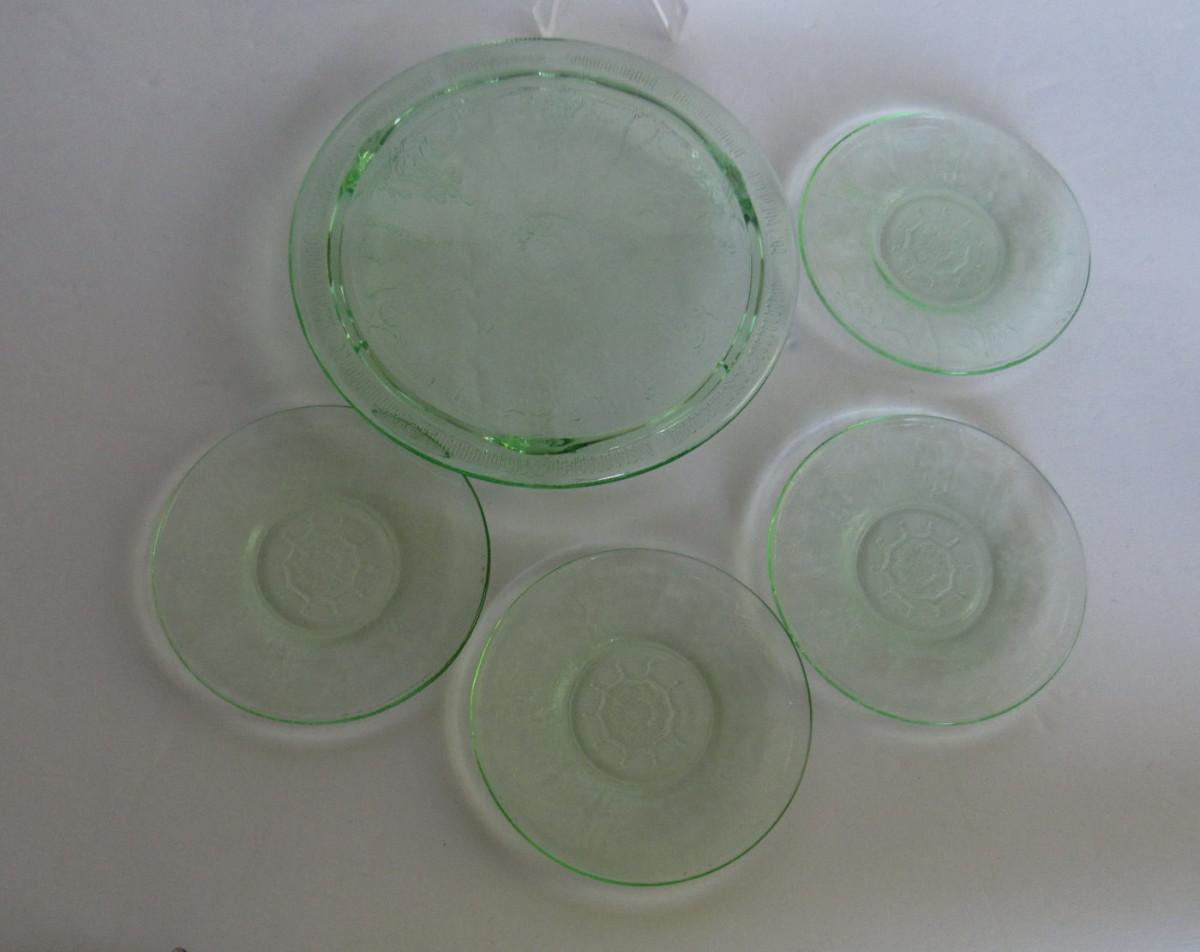 Child's Size Mosser Glass Cake Plate and 4 Small Plates, Green